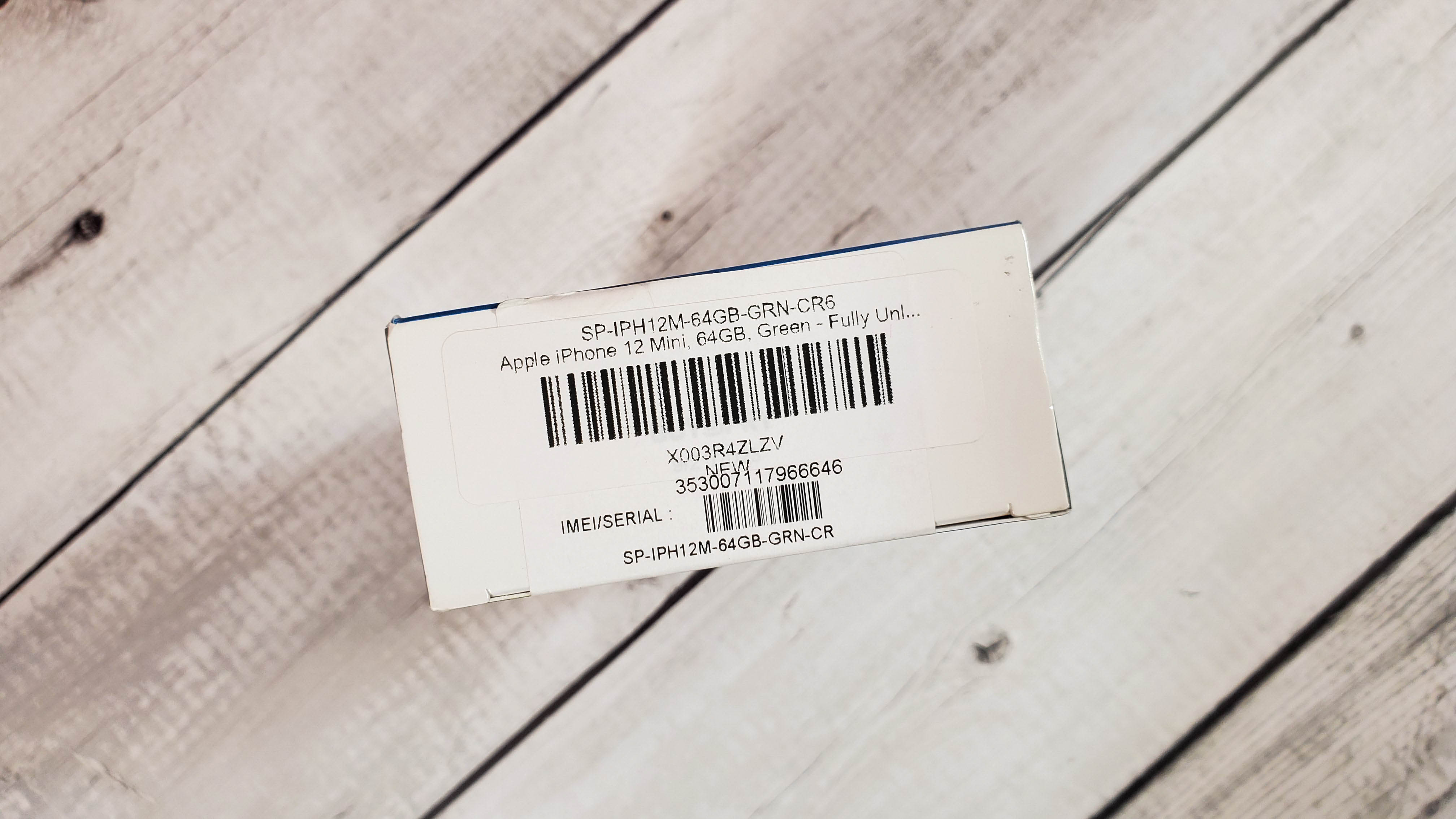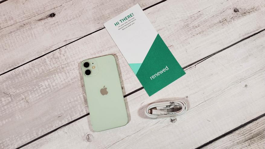 На текущий момент смартфон чаще всего продается в виде б\у, но до сих пор встречаются даже предложения на новый, «как новый» или «витринный образец». Я же пошел другим путем и купил восстановленный по программе Amazon Renewed. Прислали смартфон в неоригинальной коробке. Какая-то общая упаковка для восстановленных аппаратов с пометкой Smartphone Device и наклейкой, где указано, что внутри Apple iPhone 12 mini с памятью 64 GB, цвет Green, полностью разблокирован (не подвязан к операторам).