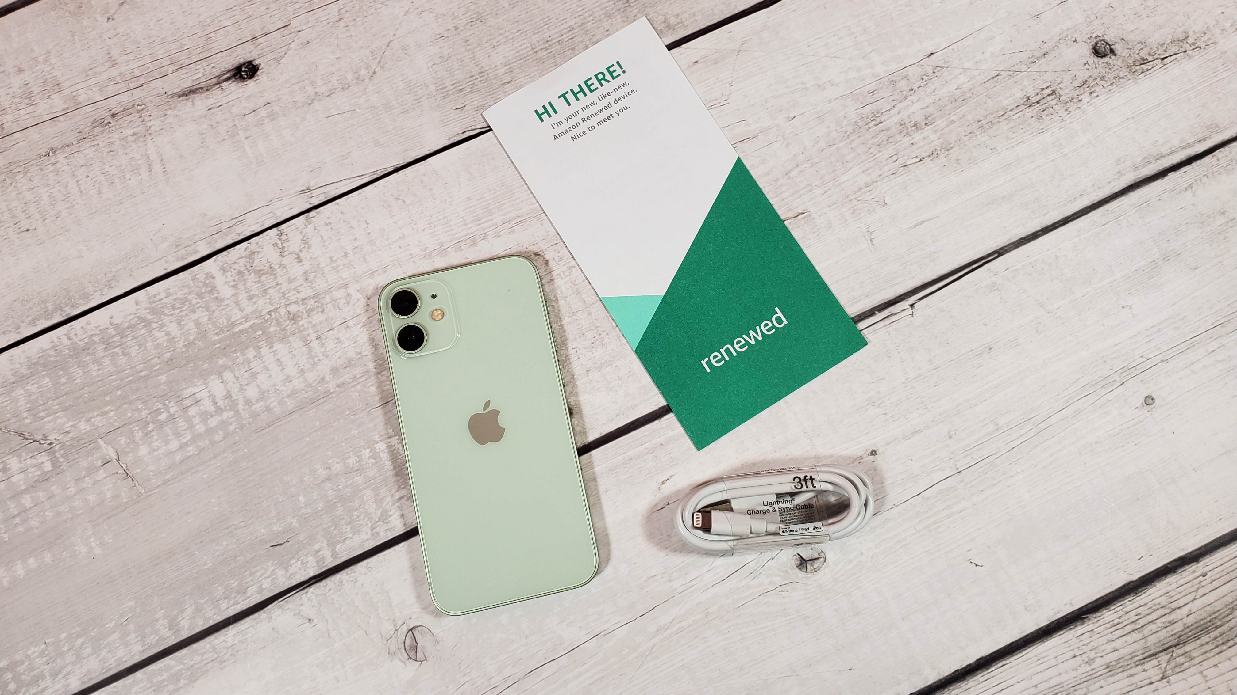В комплект к смартфону положили кабель и брошюрку с описанием программы Renewed.