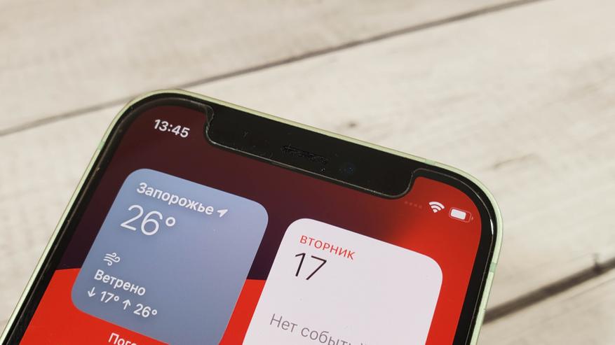 Вырез под разговорный динамик, фронтальную камеру и датчики Face id достаточно крупный, особенно это бросается в глаза при таком маленьком размере дисплея. В моем случае поверх дисплея наклеено защитное стекло.