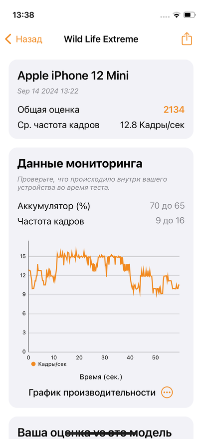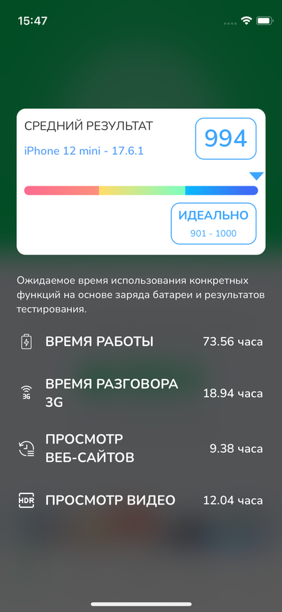 А теперь самая печальная сторона смартфона, его аккумулятор. Он и новый то не слишком балует автономностью, ведь его емкость составляет всего 2227 mAh. А тут еще и бывший в употреблении, с емкостью 87% от номинальной. При обычном использовании мне едва хватает смартфона на полный день. Если добавить игры и активное использование камеры, то уже к середине дня может потребоваться подзарядка. Ну, а если использовать только как звонилку + мессенджеры, то может протянуть пару дней с временем активного экрана около 5 часов. В общем совсем не густо. Хотя и экран здесь экономичный и техпроцесс на котором построен чипсет современный. Но емкость аккумулятора весьма печальна. Интересно, что в тесте батареи смартфон набрал 994 балла, что близко к идеальным значениям для iPhone 12 mini. Также провел пользовательский тест просмотром видео в Youtube, на яркости около 70% смартфон проработал чуть меньше 12 часов.