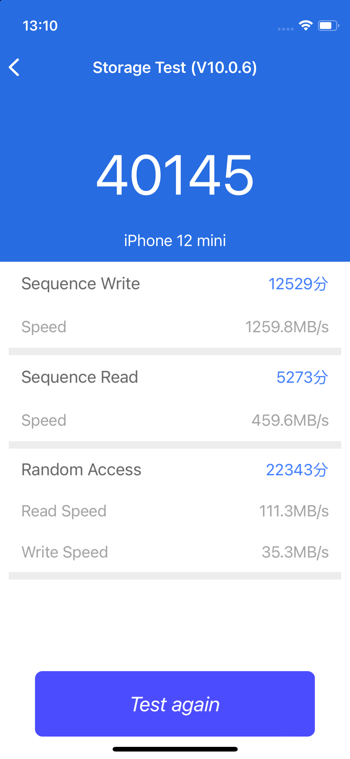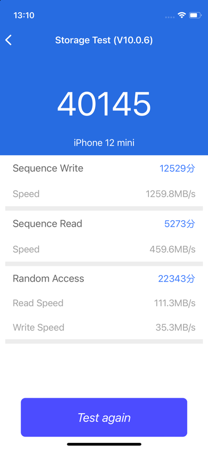 - Antutu Storage Test — 40145. Здесь немного необычно, что скорость записи 1260 MB/s выше скорости чтения 460 MB/s