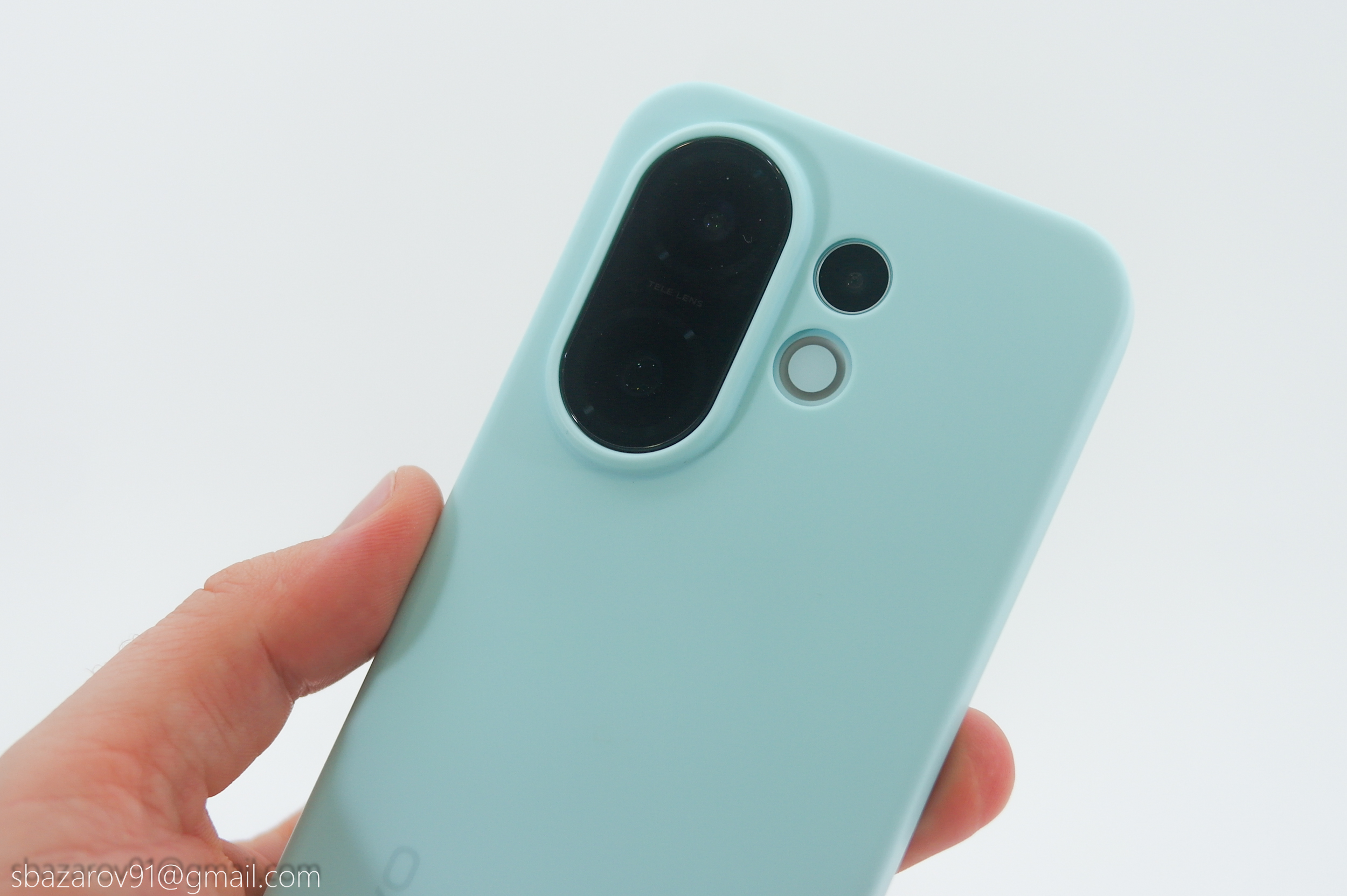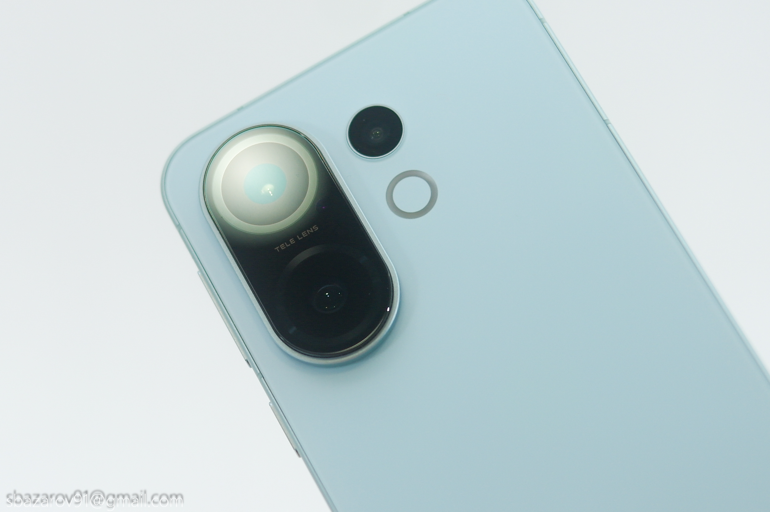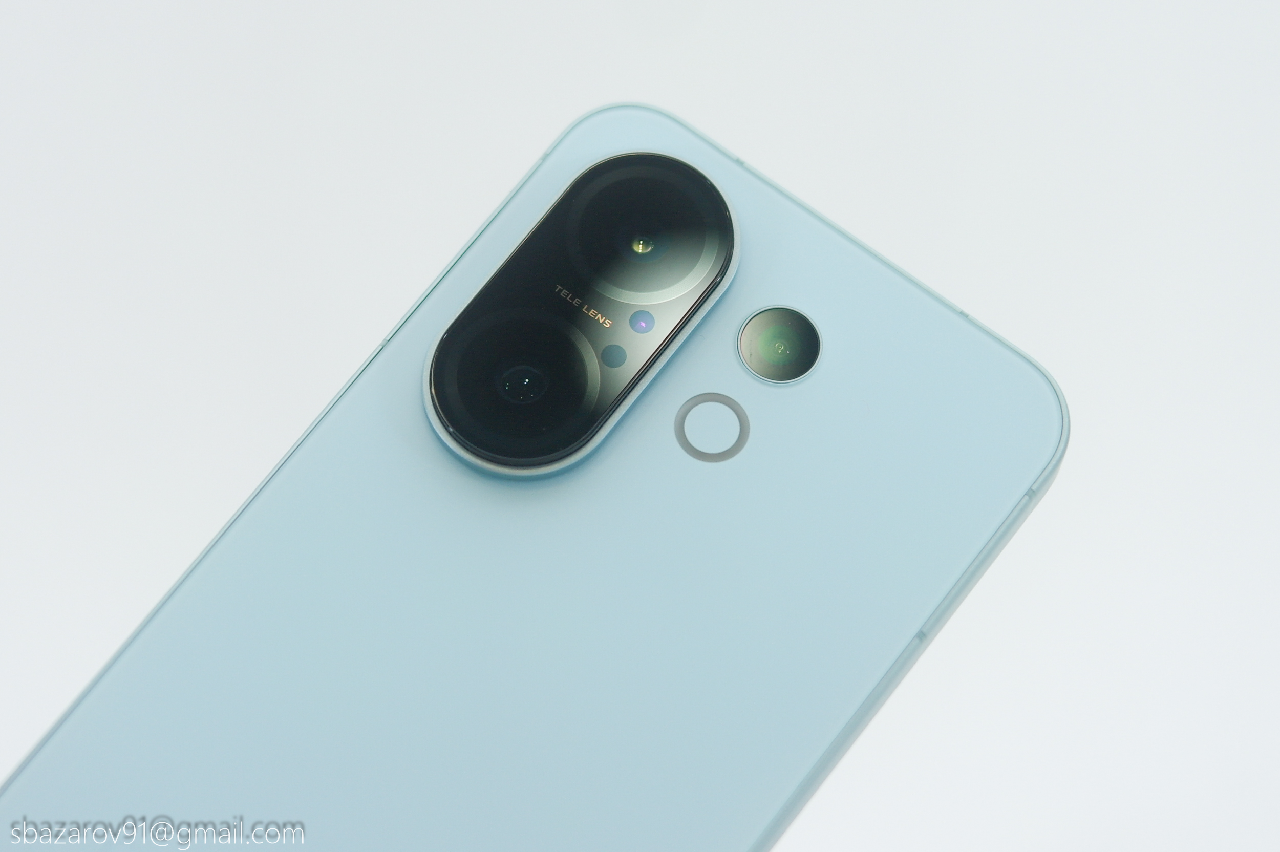 Это довольно серьёзный набор, охватывающий большой разброс фокусных расстояний: 1х, 2х (на основной) и 3, 6х (оптический). Камерный блок получился интересным: он включает 2 крупных сенсора, между которыми можно увидеть лазерный датчик фокуса и ИК-порт для управления бытовой техникой. Справа от них — ультраширик в плоском исполнении и кольцевая вспышка. Сначала мне даже показалось, что в vivo X200 FE всего две камеры, так умело их обыграли дизайнеры.