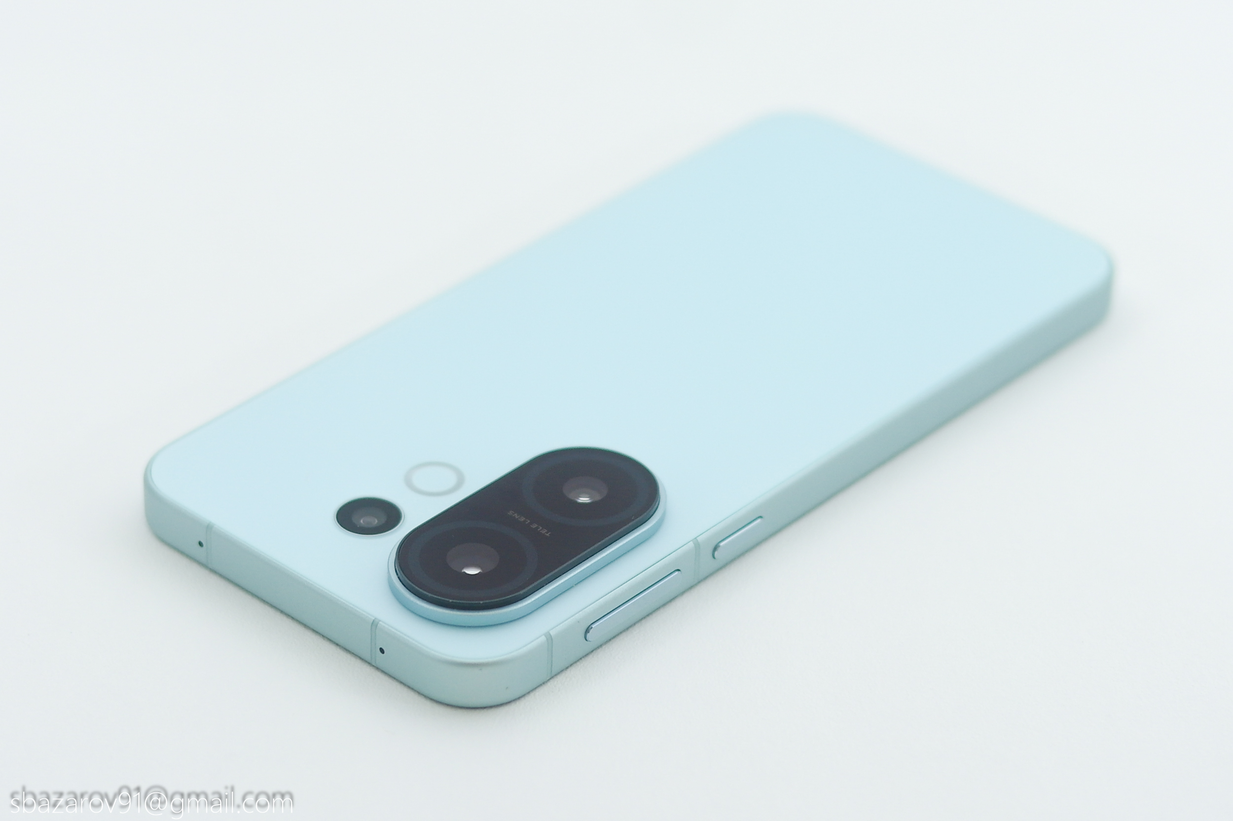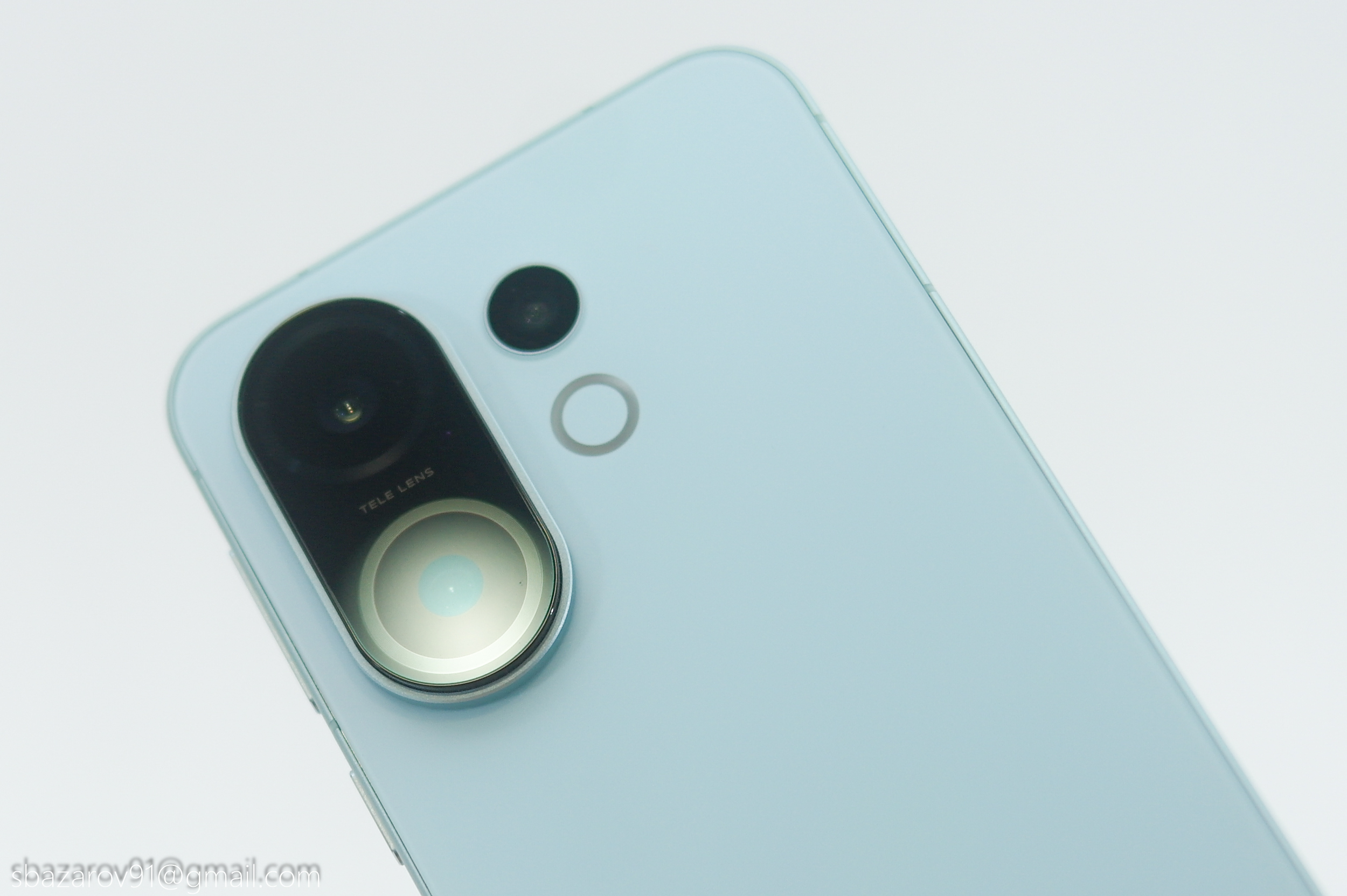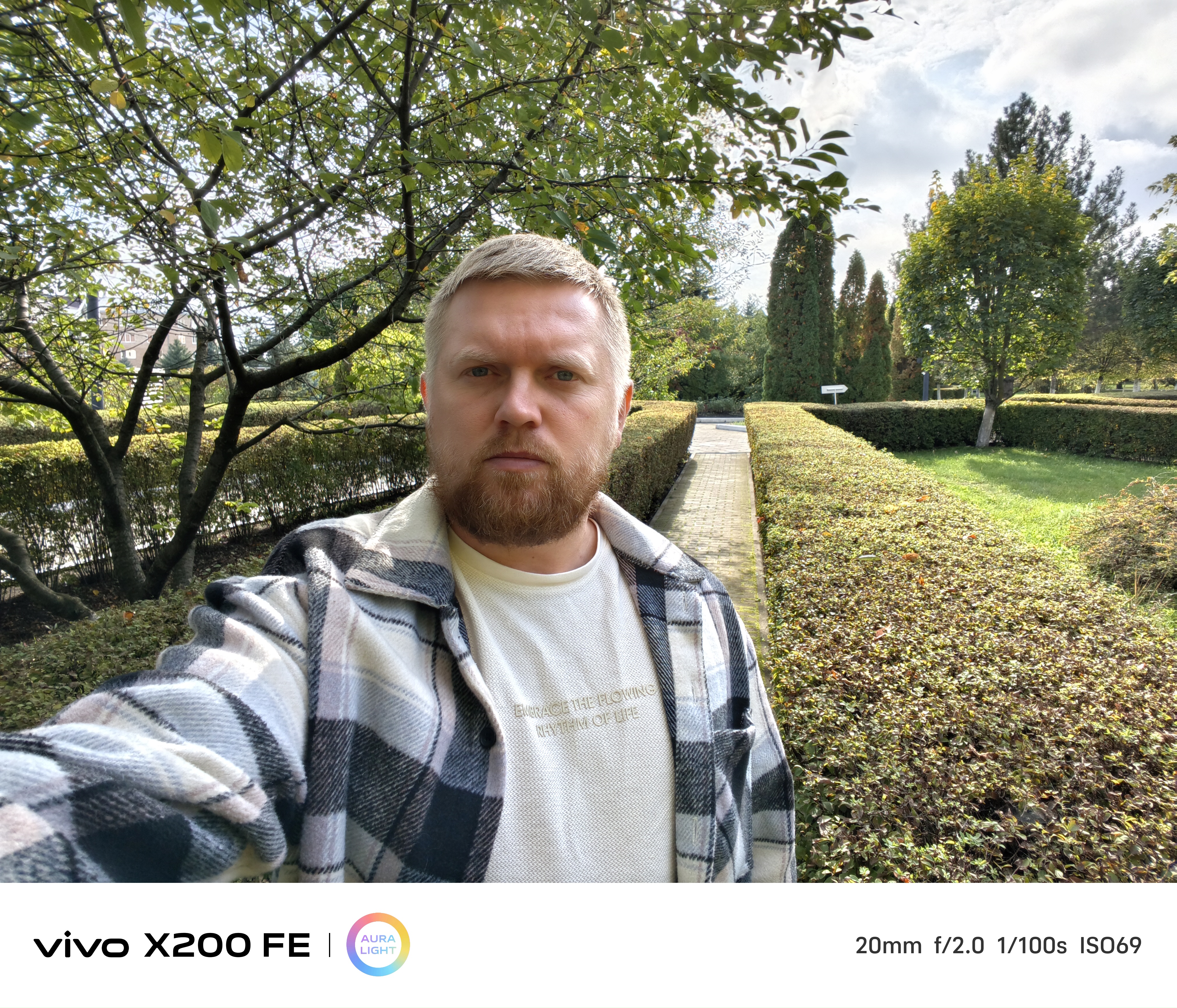 Это довольно серьёзный набор, охватывающий большой разброс фокусных расстояний: 1х, 2х (на основной) и 3, 6х (оптический). Камерный блок получился интересным: он включает 2 крупных сенсора, между которыми можно увидеть лазерный датчик фокуса и ИК-порт для управления бытовой техникой. Справа от них — ультраширик в плоском исполнении и кольцевая вспышка. Сначала мне даже показалось, что в vivo X200 FE всего две камеры, так умело их обыграли дизайнеры.