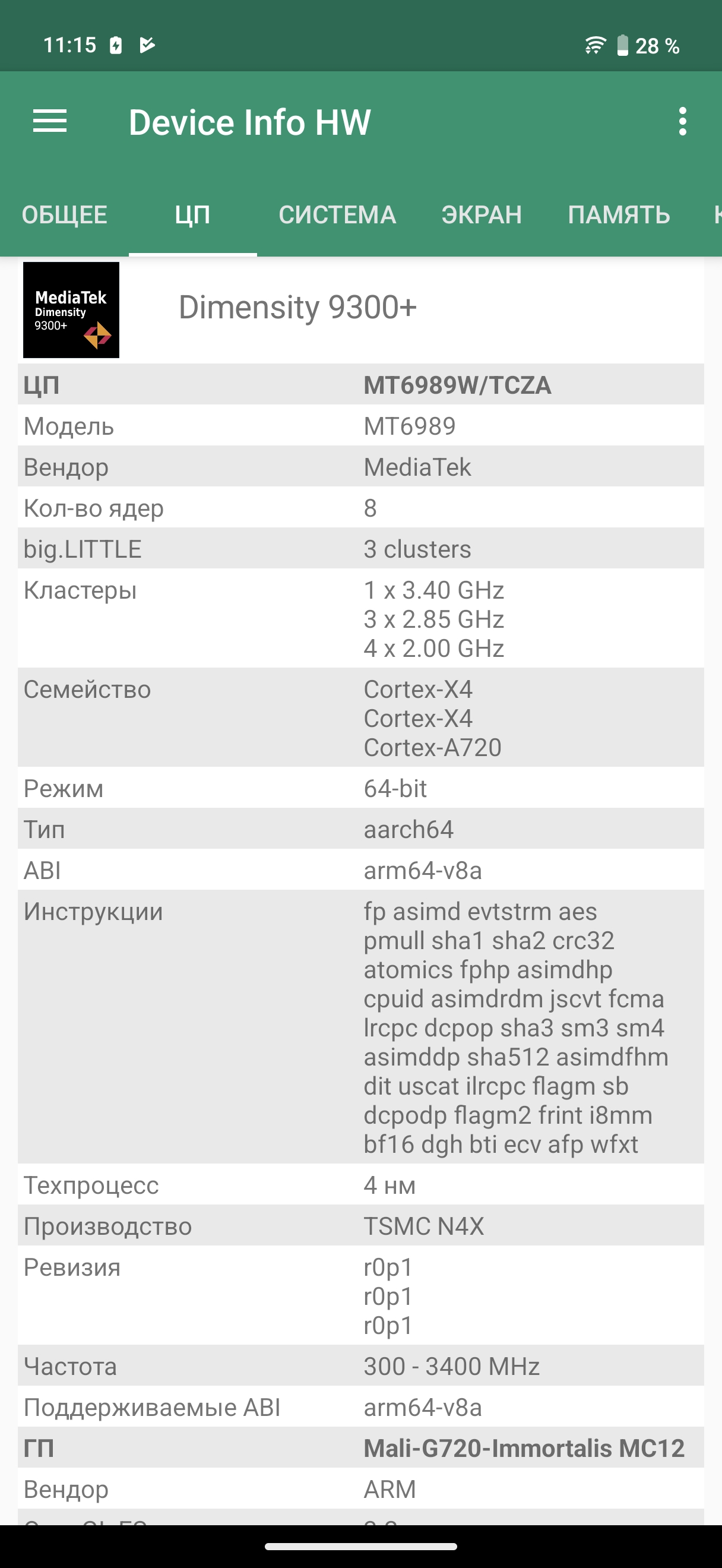 | Центральный процессор | MediaTek Dimensity 9300+ (8ядер, 4нм) |
