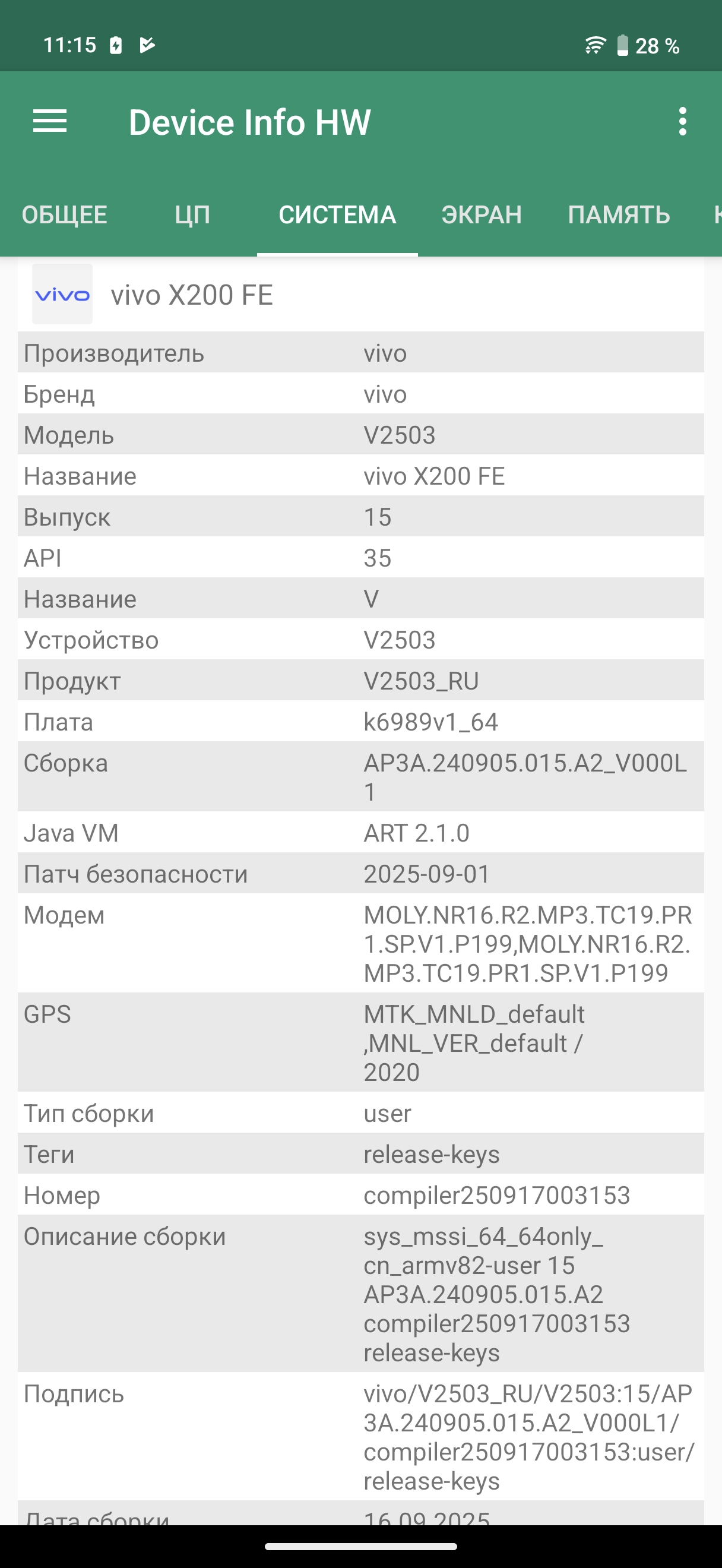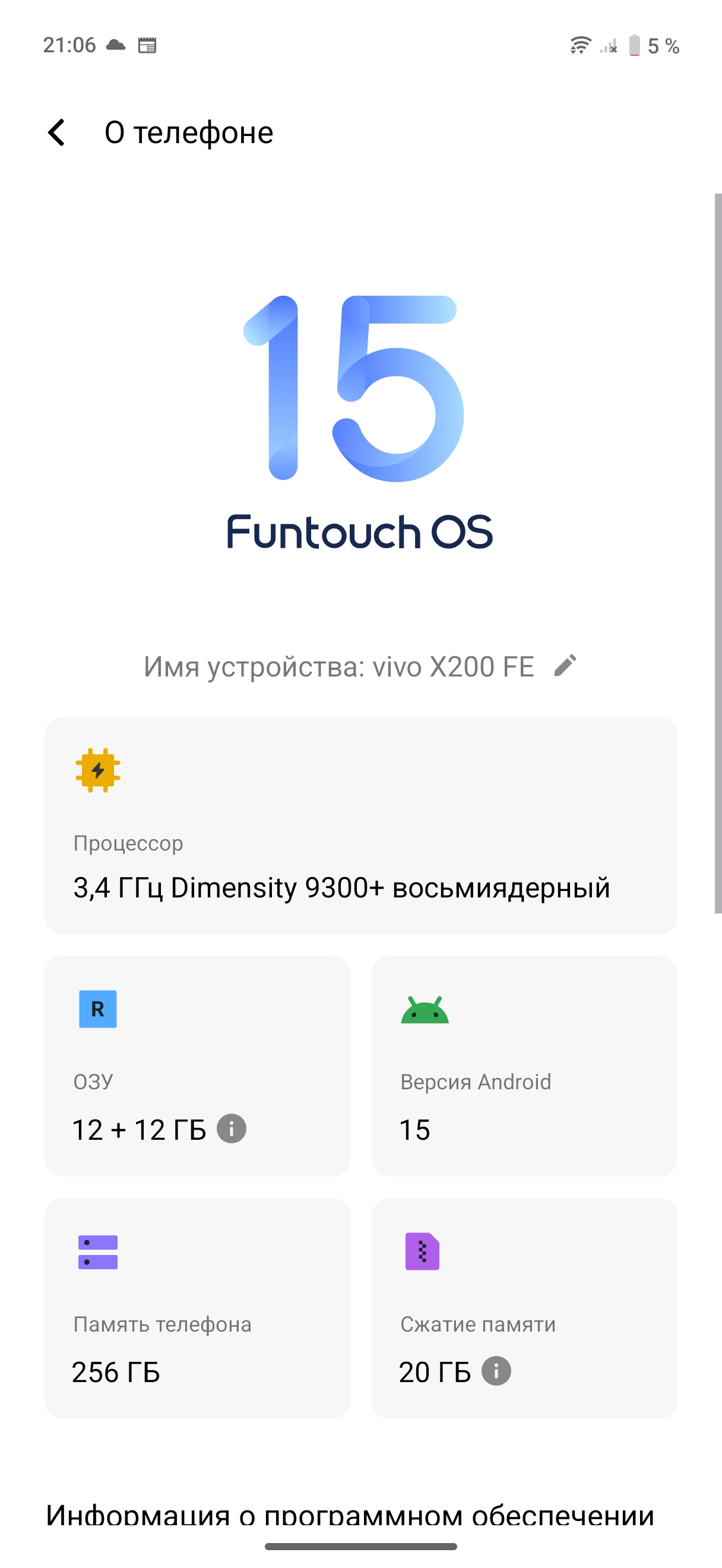 vivo X200 FE работает под управлением Android 15 с фирменной оболочкой Funtouch OS 15. Оболочка лаконичная и с малым количеством стороннего ПО (всё удаляется). При первом включении доступно минорное обновление на ~500 Мб с различными улучшениями стабильности.