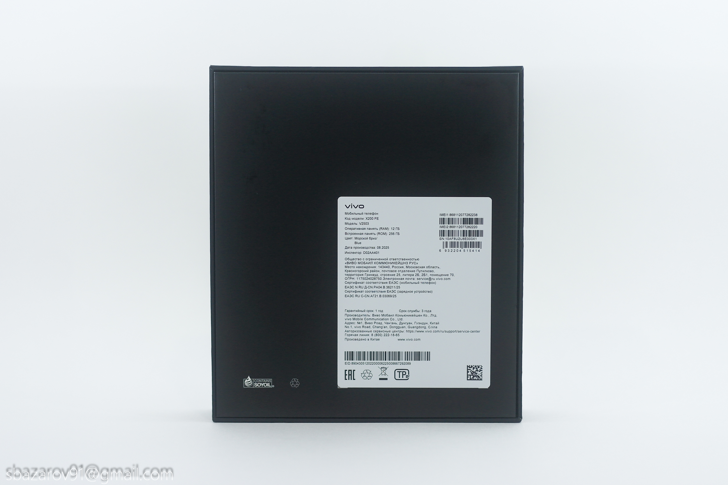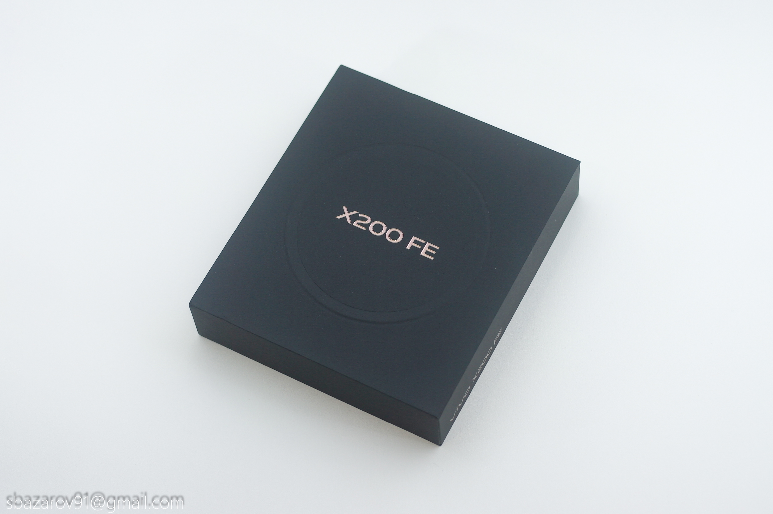 vivo X200 FE продолжает традиции и поставляется в плоской, квадратной коробке. Сверху — тиснение в виде окружности, а в центре — наименование модели. На обратной стороне — краткие технические характеристики.