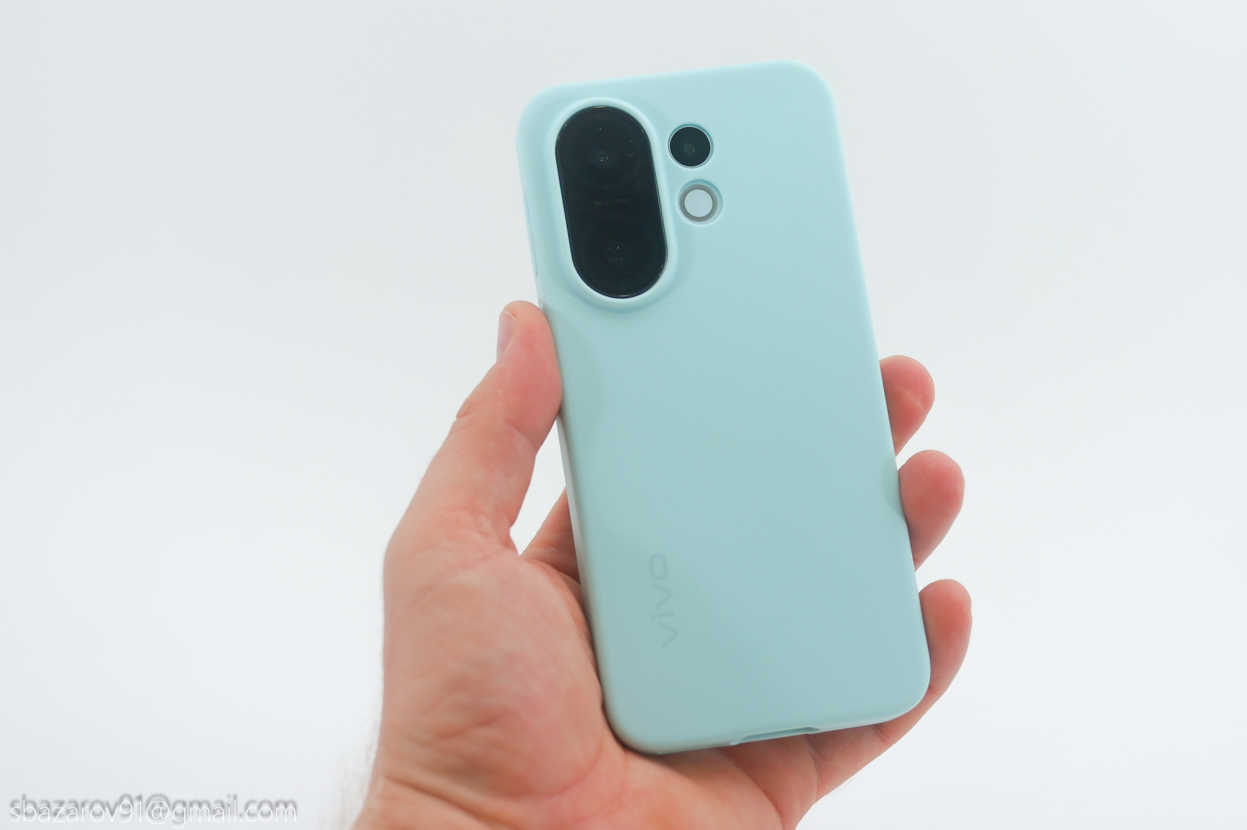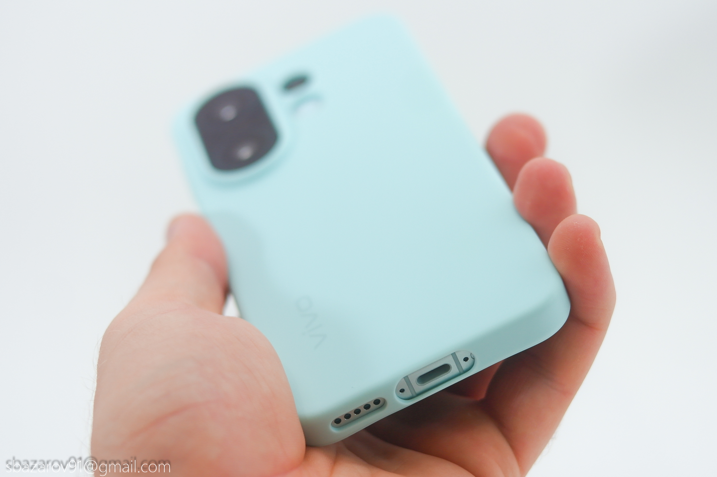 Чехол из TPU (термопластичный полиуретан) имеет приятный бледно-бирюзовый оттенок, который удачно дополняет смартфон, защищая все разъёмы и массивный блок камер.