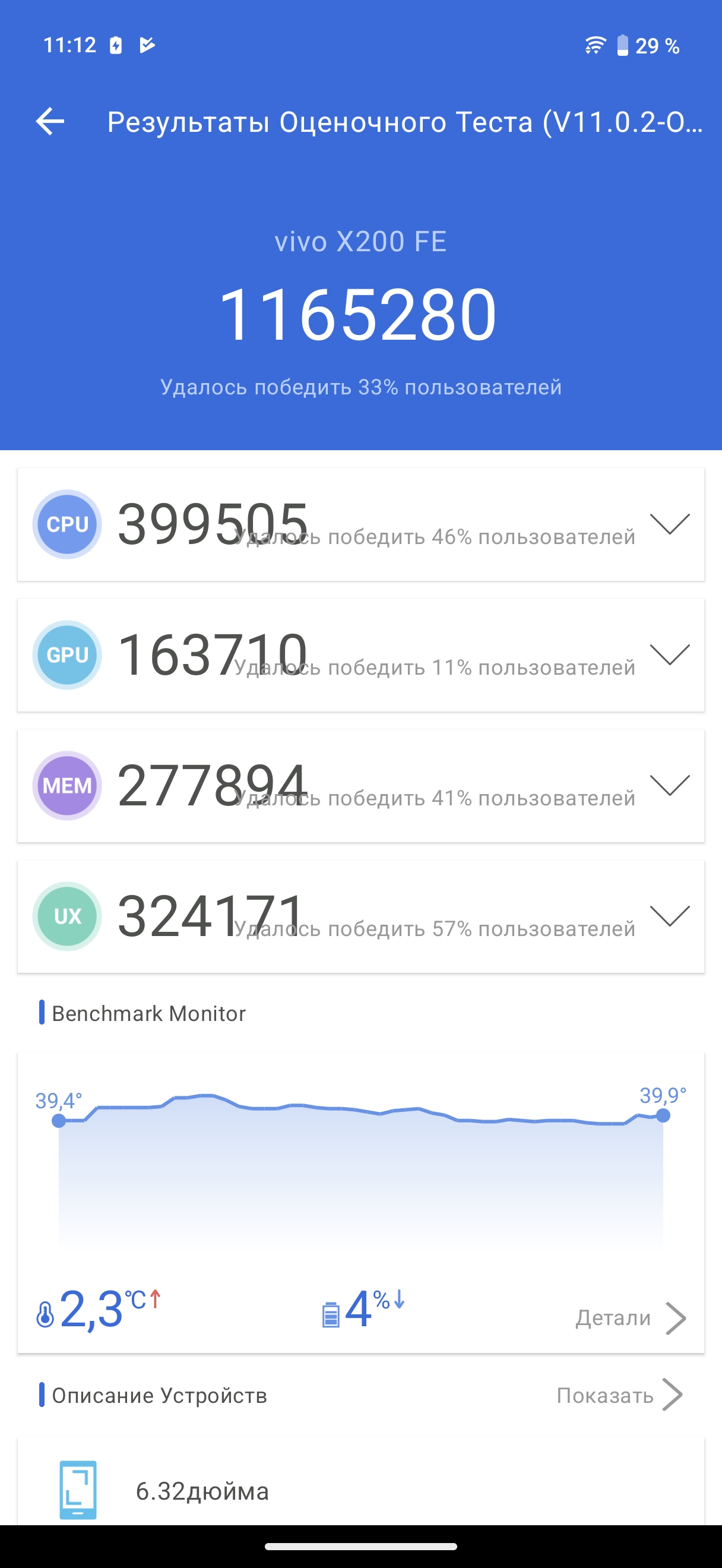 Из неочевидного: при достижении заряда менее 40-50% происходит снижение производительности вплоть до половины от общей мощности. На заряде от 50 до 100% смартфон набирает около 1,86 млн млн очков в AnTuTu и 1646/6530 очков в Geekbench 6. Как только заряд снижается, результаты становятся более скромными — 1.165 млн и 615/3124 очков, соответственно. Данный эффект не единичный и встречается у многих пользователей; возможно, он будет исправлен в будущих обновлениях.