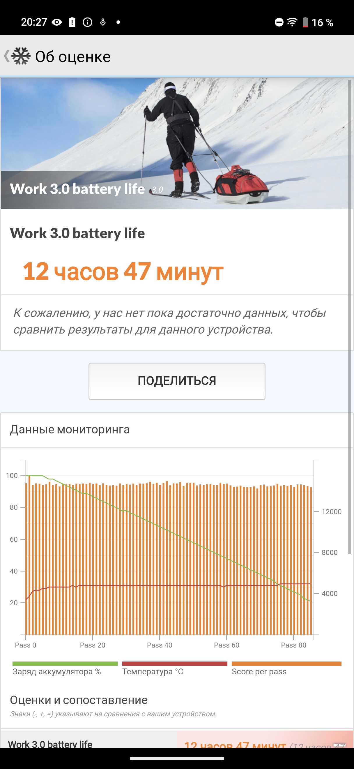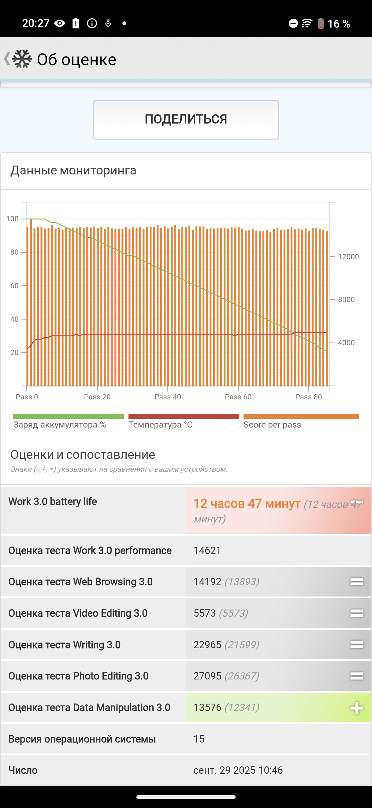 Несмотря на малые размеры корпуса, vivo X200 FE получил внушительную кремний-углеродную батарею (Si/C) на 6500 мА*ч. Это обеспечивает высокую автономность, что демонстрирует тест PC Mark: смартфон проработал 12 часов 47 минут с остатком заряда 20%. Это отличный результат, которого хватит на один световой день даже при интенсивной нагрузке, либо на 2 дня умеренной нагрузки. Если же снизить разрешение в настройках и запустить аналогичный тест, то можно получить дополнительные 25 минут ко времени работы.