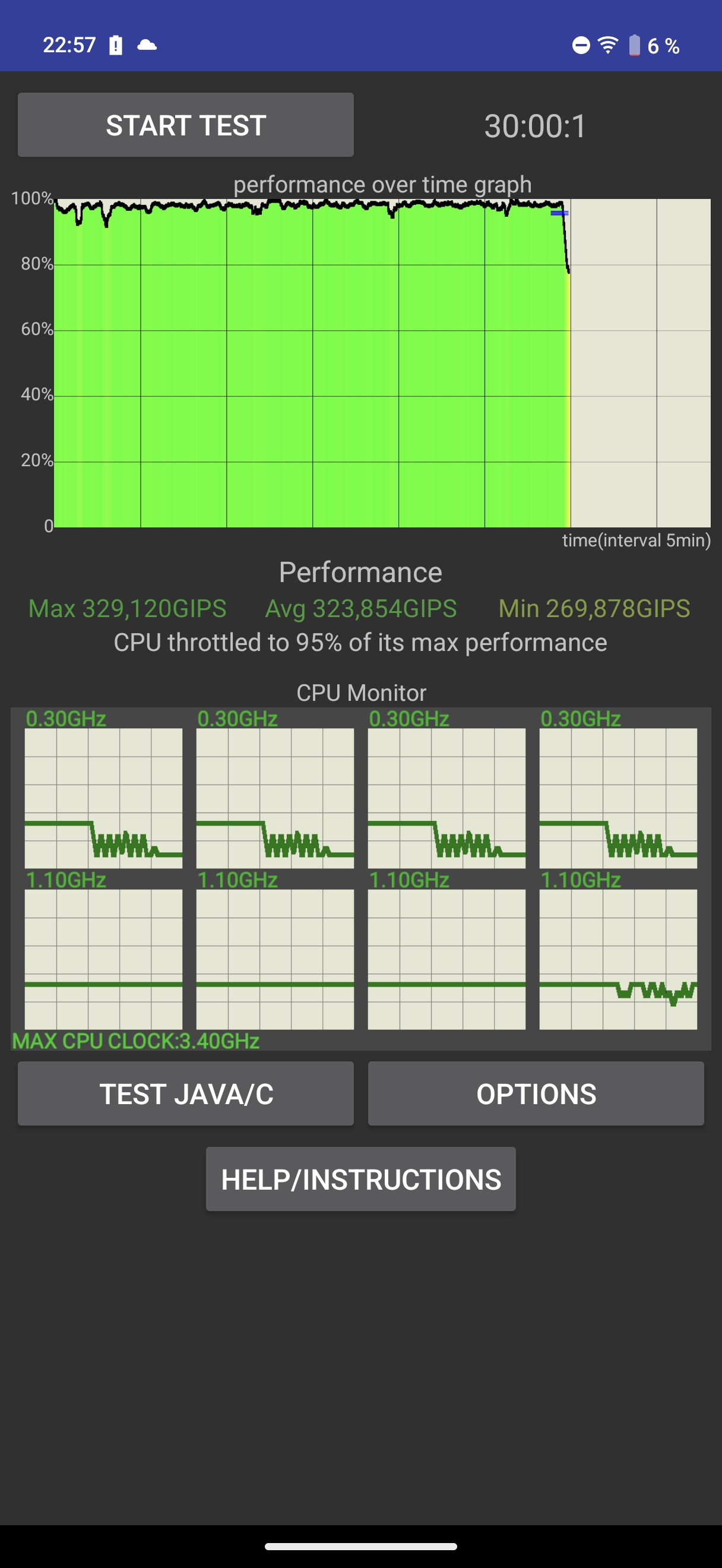 Отдельно хочется отметить работу процессора под нагрузкой. Я гонял телефон в разных условиях и играх, результат везде один — еле ощутимый нагрев корпуса и практически полное отсутствие троттлинга. Но как и в предыдущем тесте, разный процент заряда демонстрирует различные показатели общей производительности: при полном заряде 570 GIPS Max, ближе к середине 541 GIPS Max, а на минимальном заряде имеем лишь 329 GIPS Max.