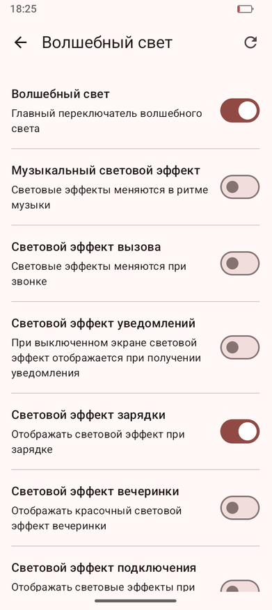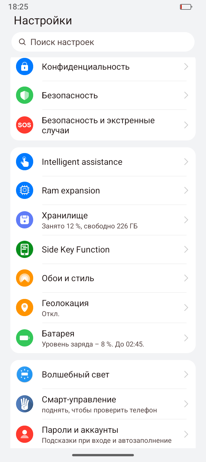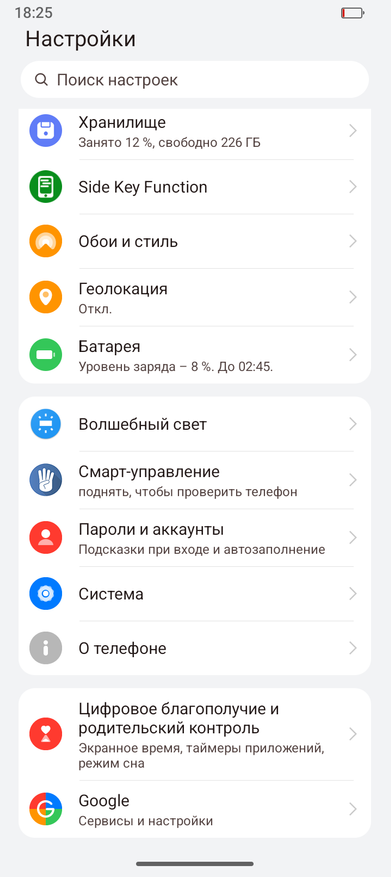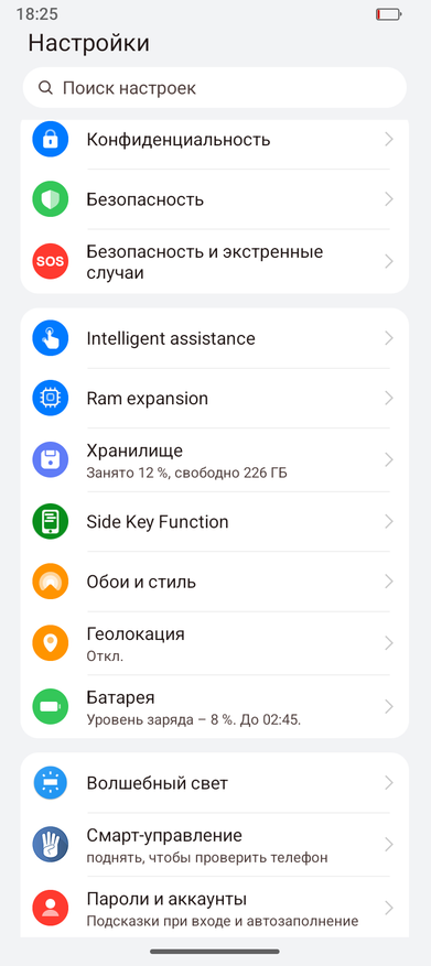 В предыдущих моделях смартфонов была предустановлена операционная система android 14, а тут уже android 15. Меню аналогично предыдущим версиям, но есть незначительное отличие. В расширении оперативной памяти её можно добавить до 12 ГБ. Функциональная кнопка поддерживает до 3 действий: однократное нажатие, двойное нажатие и длительное удержание. «Волшебный свет» для настройки отображения светодиодного индикатора размещённого на блоке камер. Он может отображаться в красном, зелёном или синем цвете запятая в зависимости от состояния или режима работы. К примеру, при низком уровне заряда аккумулятора он будет гореть красным, а во время зарядки зелёным. Во время прослушивания музыки может подмигивать в такт.