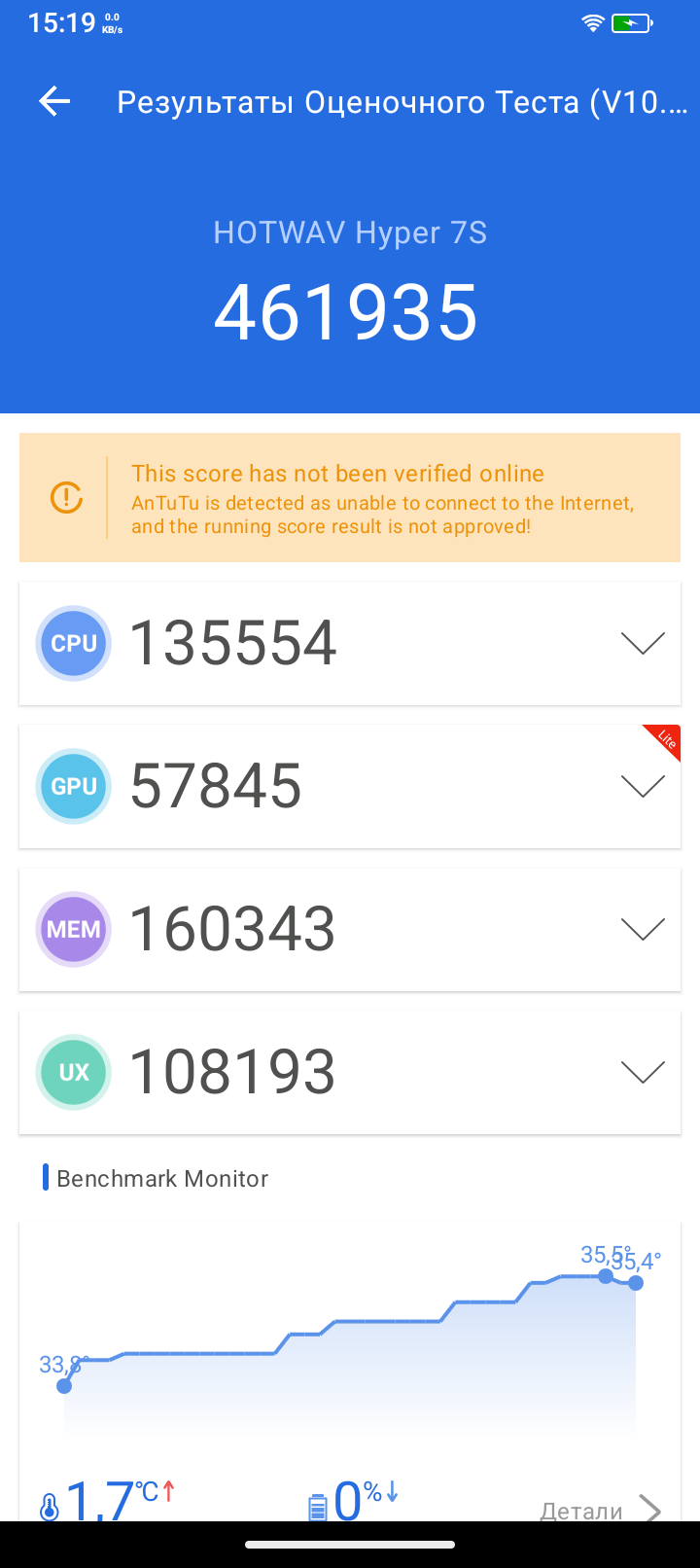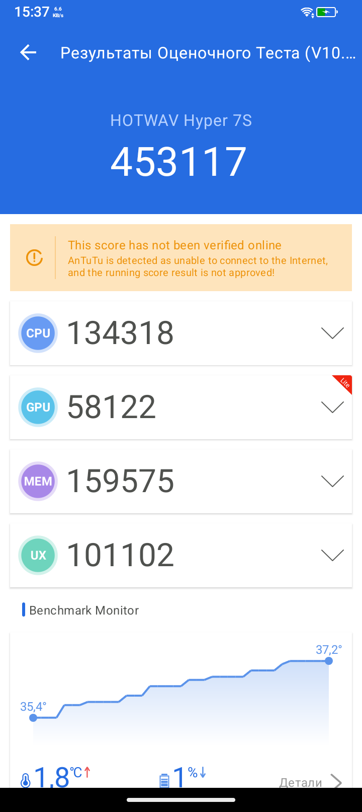 Проведённый тест antutu показал штатные показатели для данного процессора. Среднее значение от 450 до 460.000 очков. У Hotwav hyper 7 это значение составляет 530.000 очков.