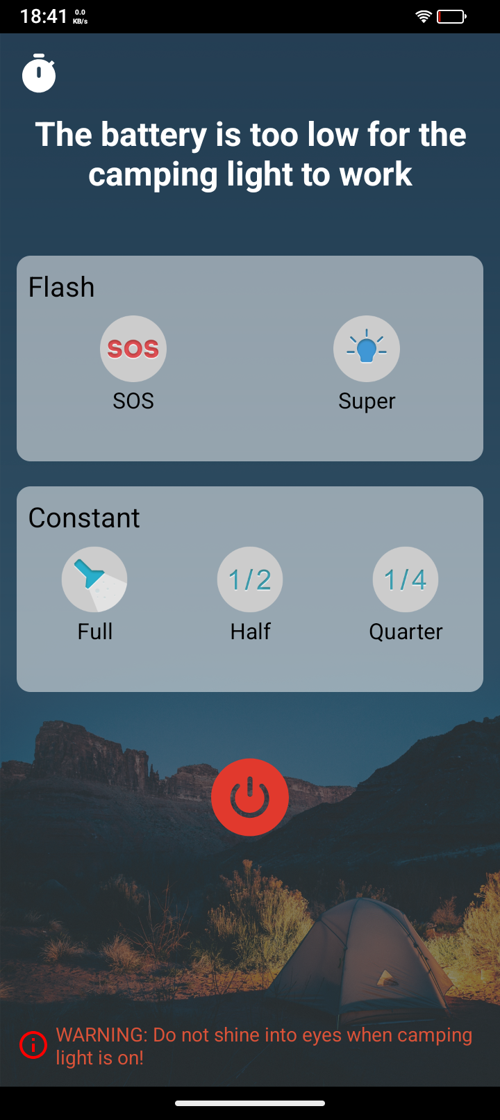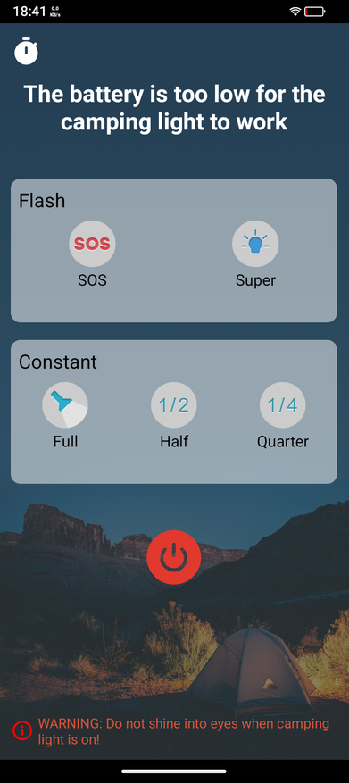 Приложение для запуска кемпингового фонаря позволяет включать светодиодную матрицу на полную мощность, половину или 1/4, а также включать режим SOS и стробоскоп.