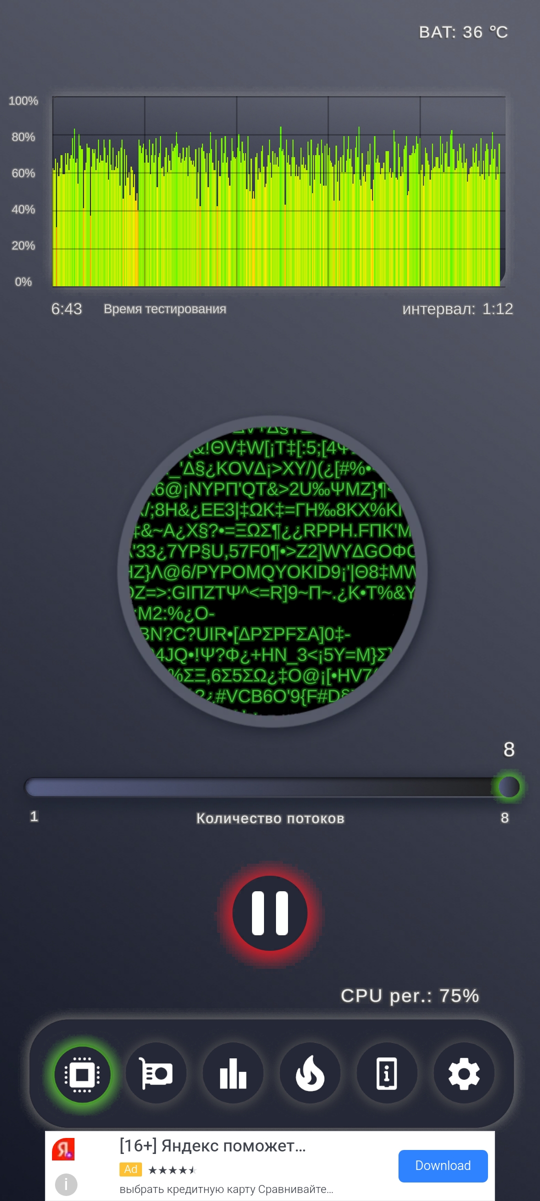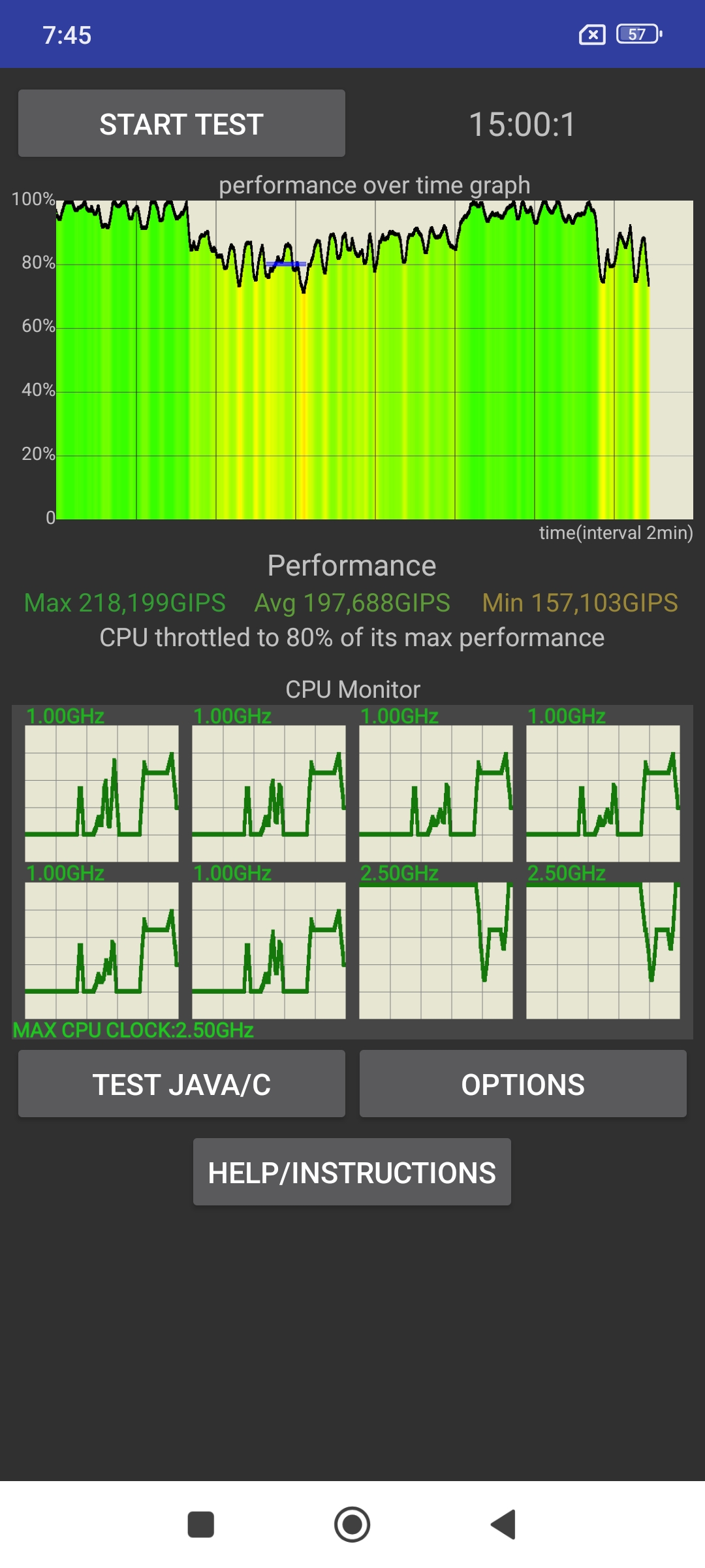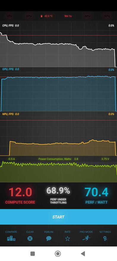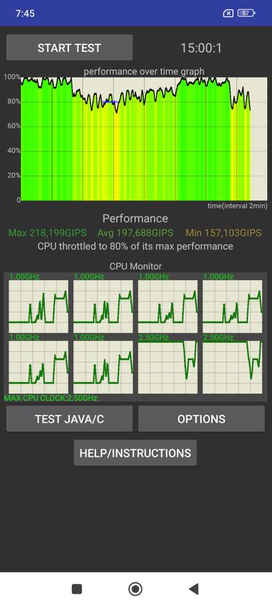 Проверка на троттлинг процессора MediaTek Dimensity 7025 показывает незначительные провалы во время 15 и 30 минутного теста, но больших искривлений не зафиксировано, ниже 75% не уходило. При этом корпус довольно хорошо прогрелся в районе установленных камер.