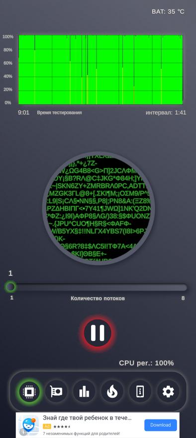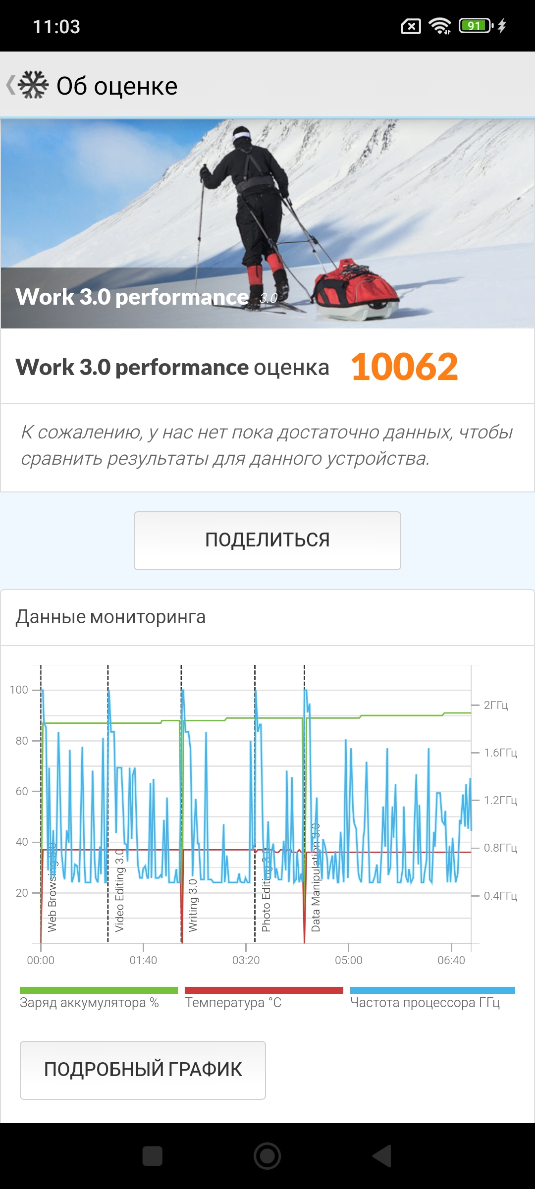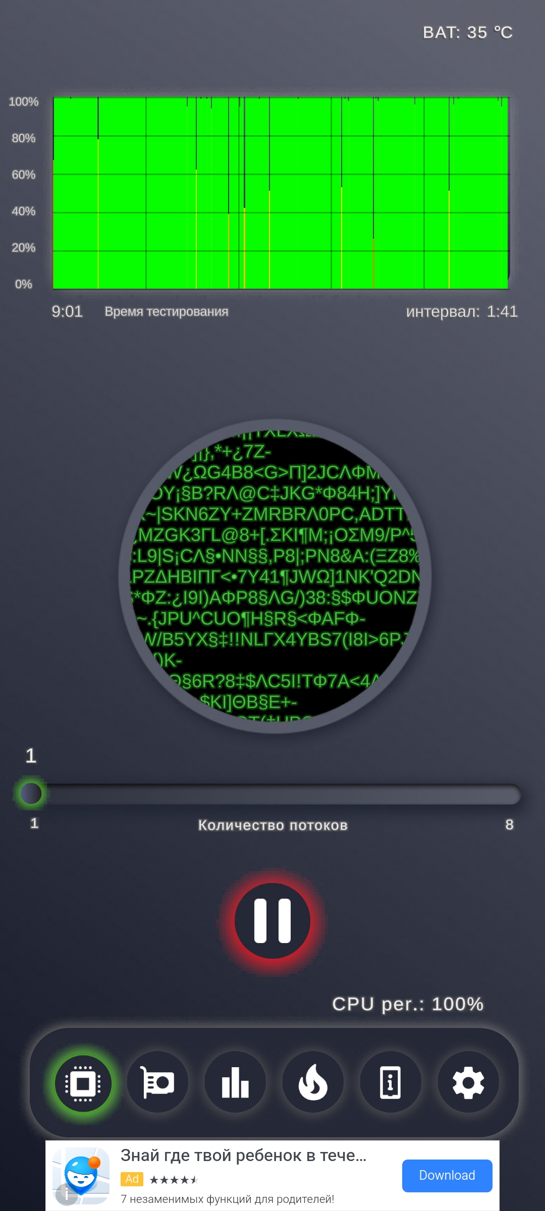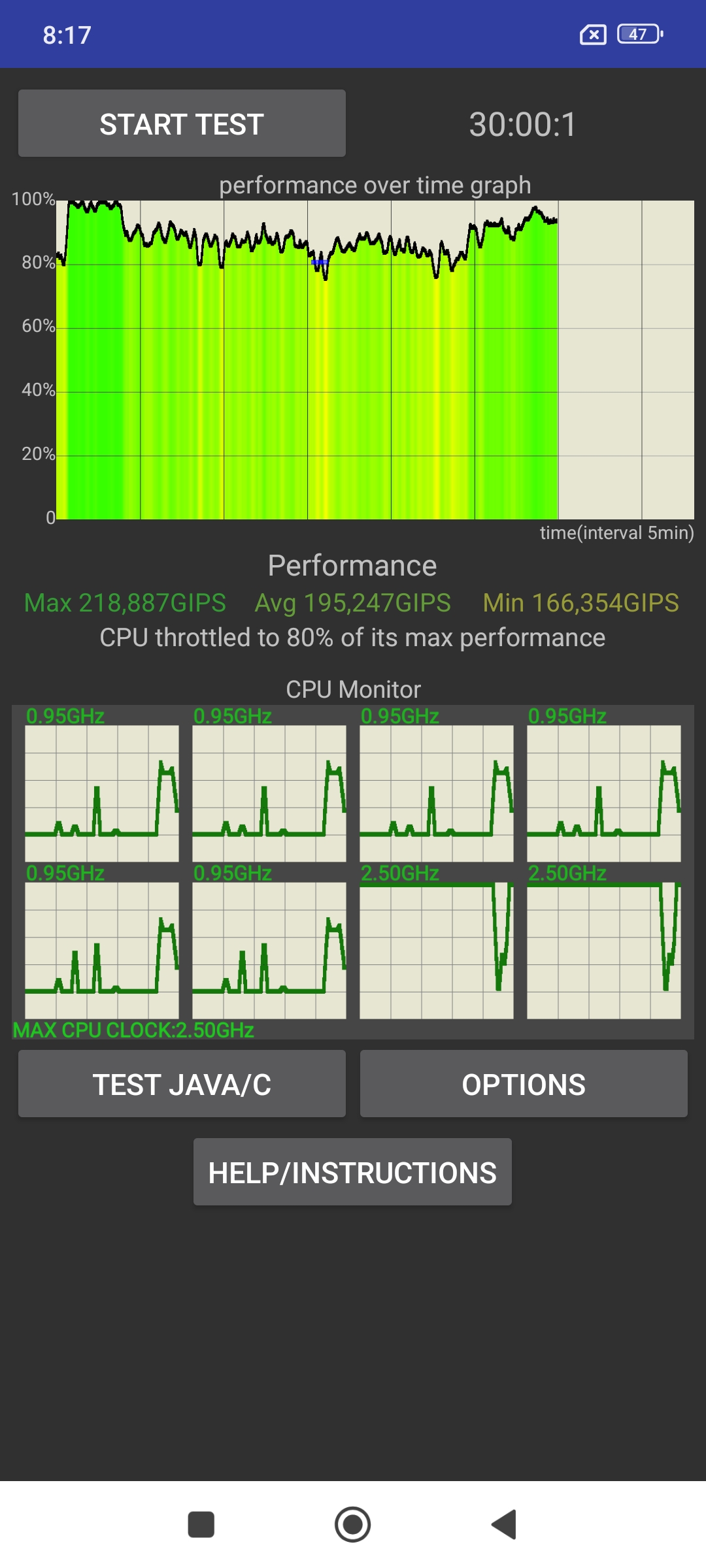 Проверка на троттлинг процессора MediaTek Dimensity 7025 показывает незначительные провалы во время 15 и 30 минутного теста, но больших искривлений не зафиксировано, ниже 75% не уходило. При этом корпус довольно хорошо прогрелся в районе установленных камер.