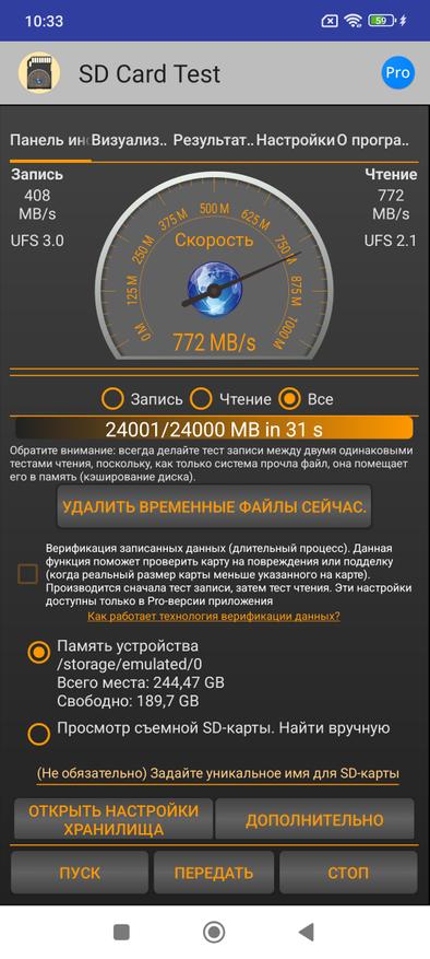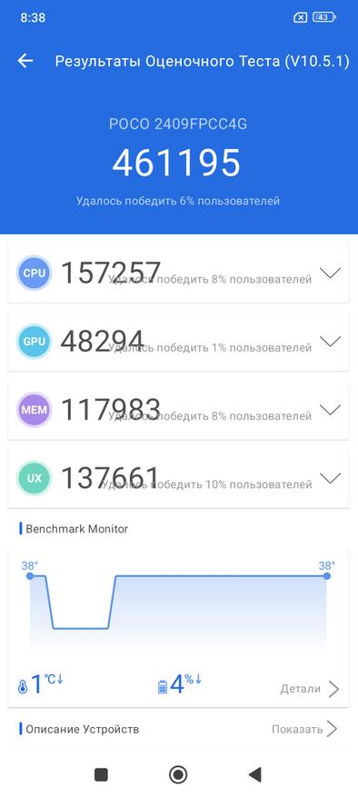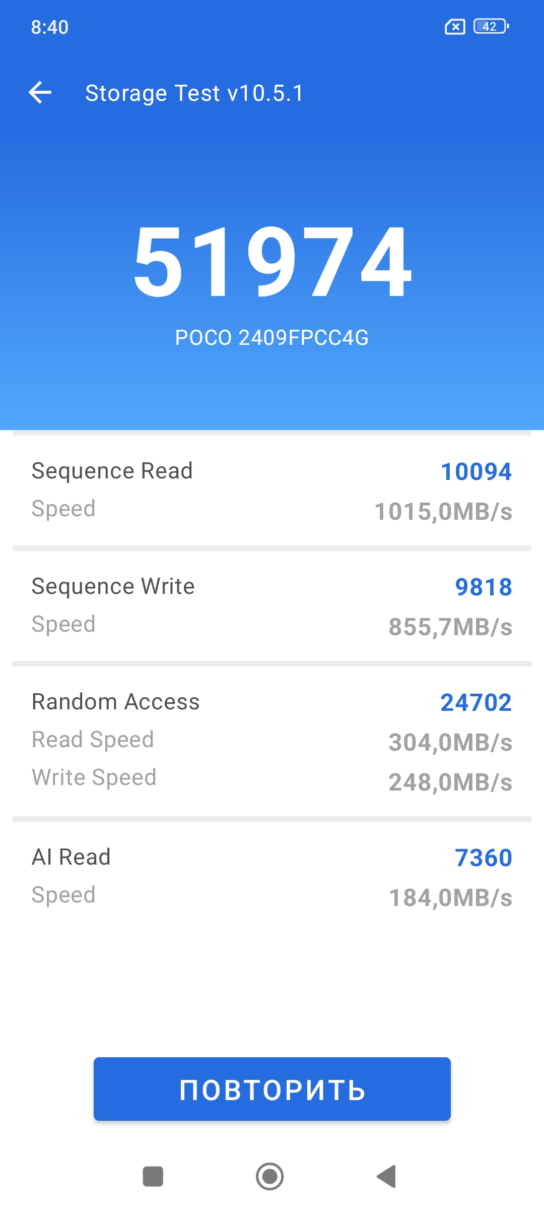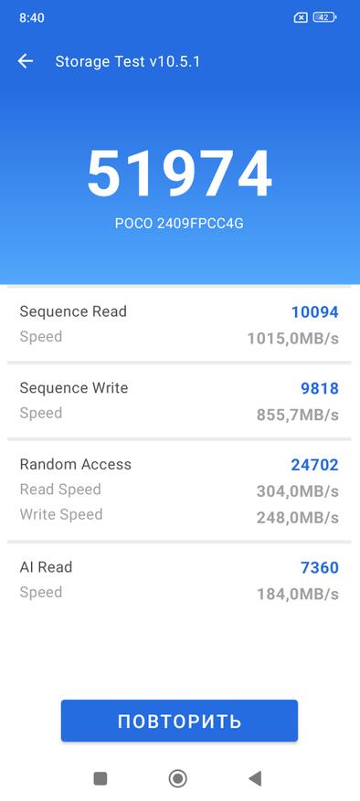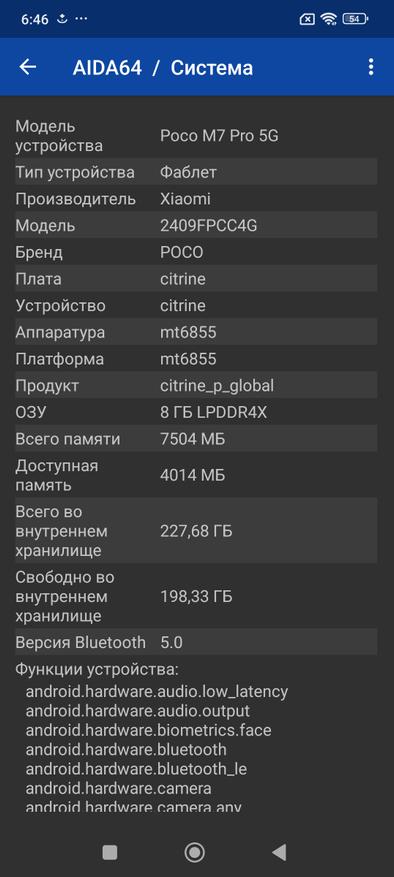 Напомню, что в смартфоне Poco M7 Pro 5G может быть установлено 8 или 12 ГБ оперативной памяти в зависимости от комплектации. Мой смартфон содержит 8 ГБ и по моему мнению ее больше и не надо. Оперативная память на LPDDR4X показывает вполне стандартные результаты по скорости чтения и передачи файлов. Можно увеличить ОП до 16ГБ за счет использования выделенного пространства флеш-накопителем.