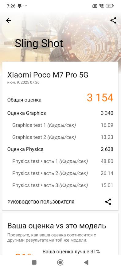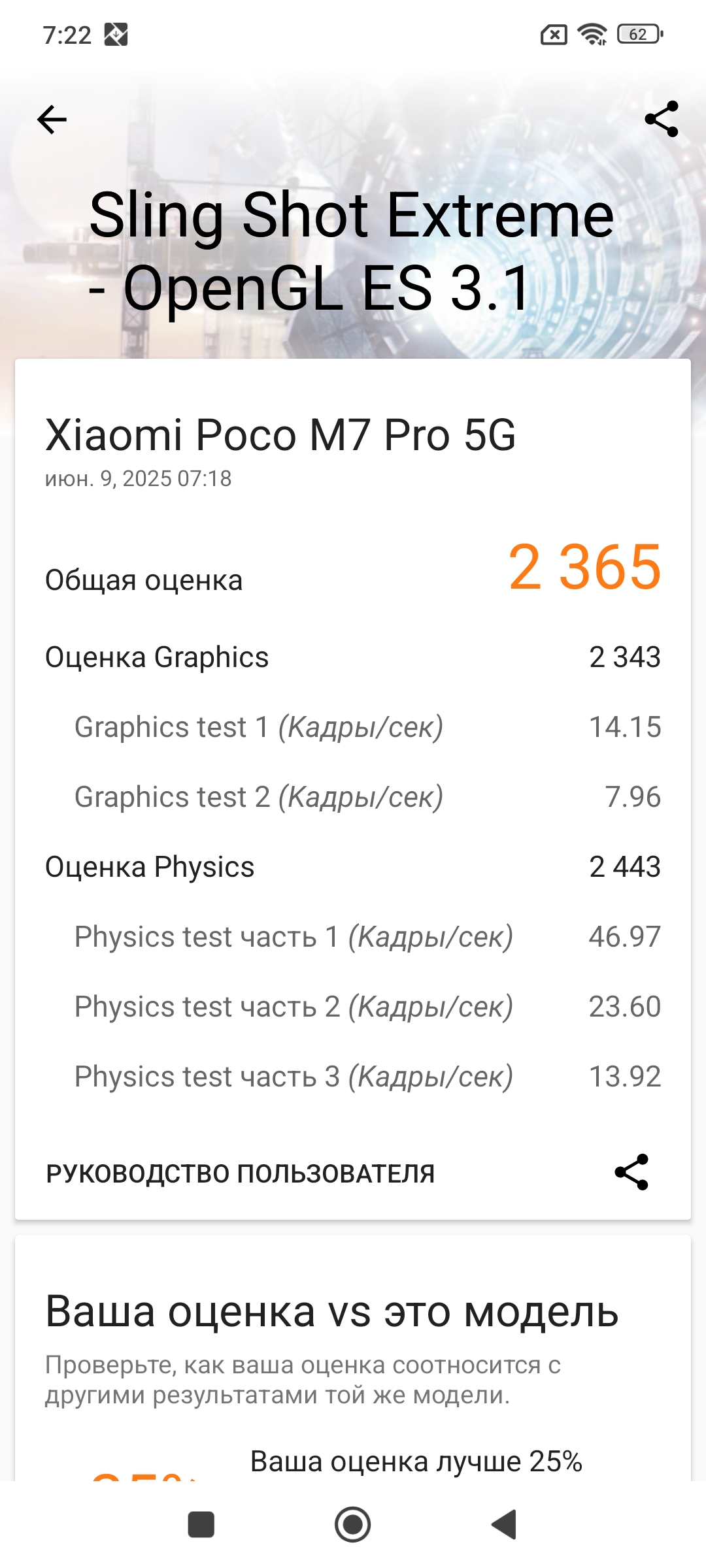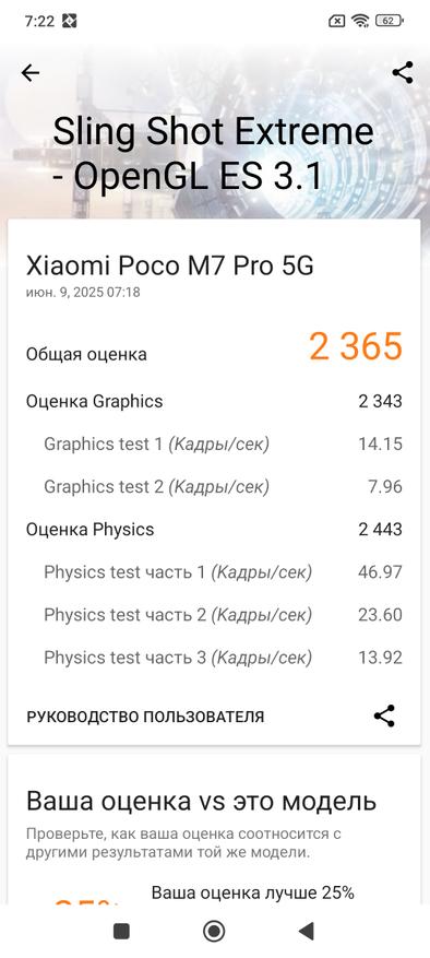 Смартфон довольно сложно назвать игровым, но поиграть на средних настройках графики вполне возможно. При выставлении максимально возможных настроек, можно наблюдать, что в «танчиках» смартфон Poco M7 Pro демонстрирует уверенные 60 FPS. А вот если выставить на 16х анизотропную детализацию текстур, то окружающий мир будет более привлекателен для игры, но FPS падает до 36-45.