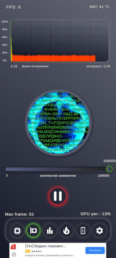 Еще несколько тестов производительности процессора и графического чипа в однопоточном и многопоточном режиме. Если процессор довольно стойко переносит нагрузку, то видеочип снижает количество FPS при многопоточном режиме до 8-9, тогда как номинальном режиме спокойно воспроизводит 53-55 FPS.