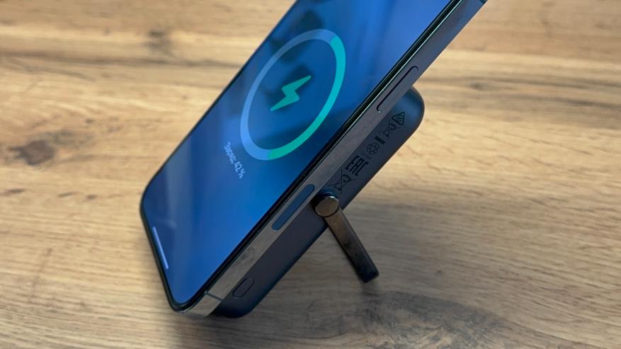 Сбоку расположена металлическая рамка-подставка: её можно откинуть и поставить пауэрбанк вместе со смартфоном на стол. Решение простое и для кого-то покажется удобным. Я же сам на практике использовал только один раз.