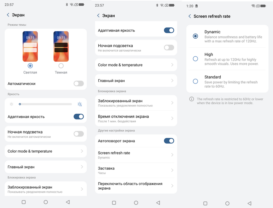 Как я уже упоминал ранее, в смартфоне установлена матрица с разрешением 2460x1080, работающая на частоте 120Гц. По умолчанию включен сбалансированный режим обновления экрана, экономящий заряд батареи.