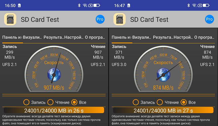 Память судя по всему работает по одной из спецификаций UFS, и демонстрирует отличные скорости как чтения так и записи.