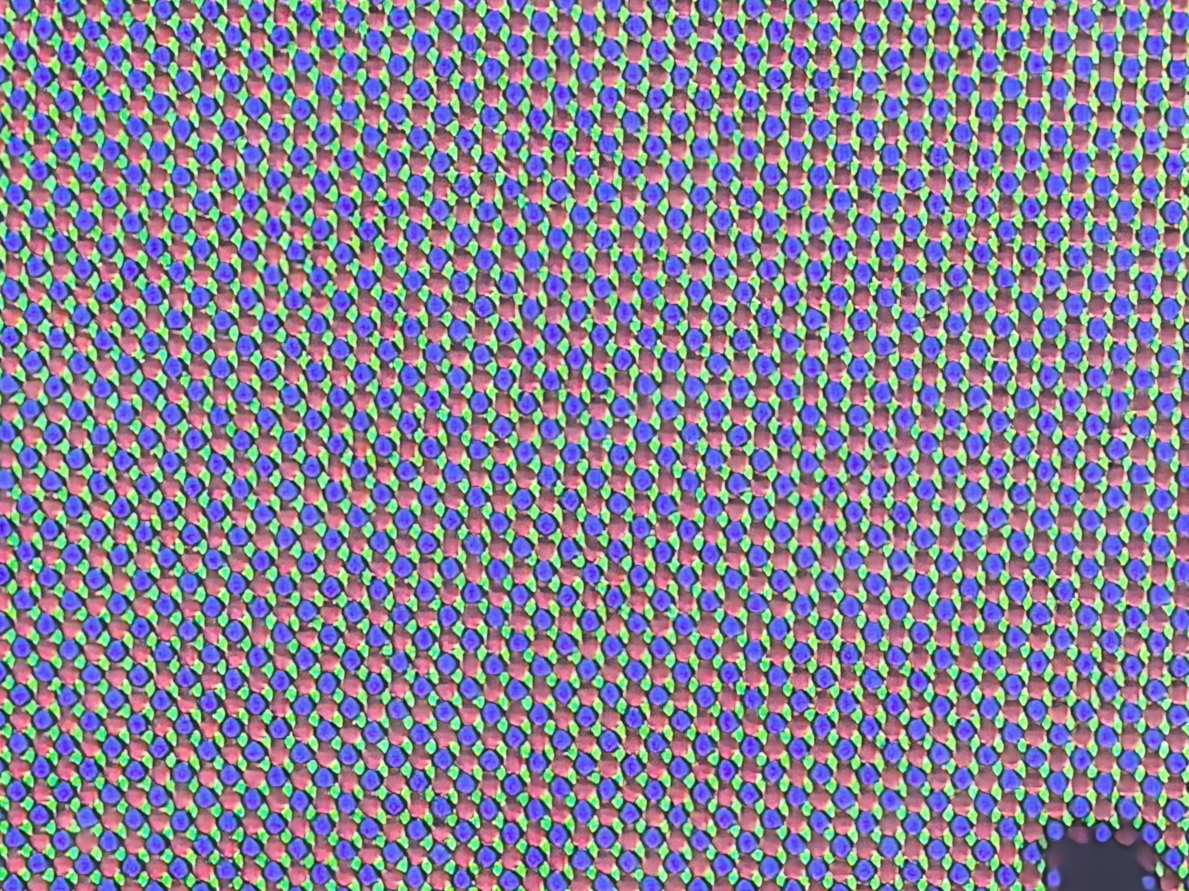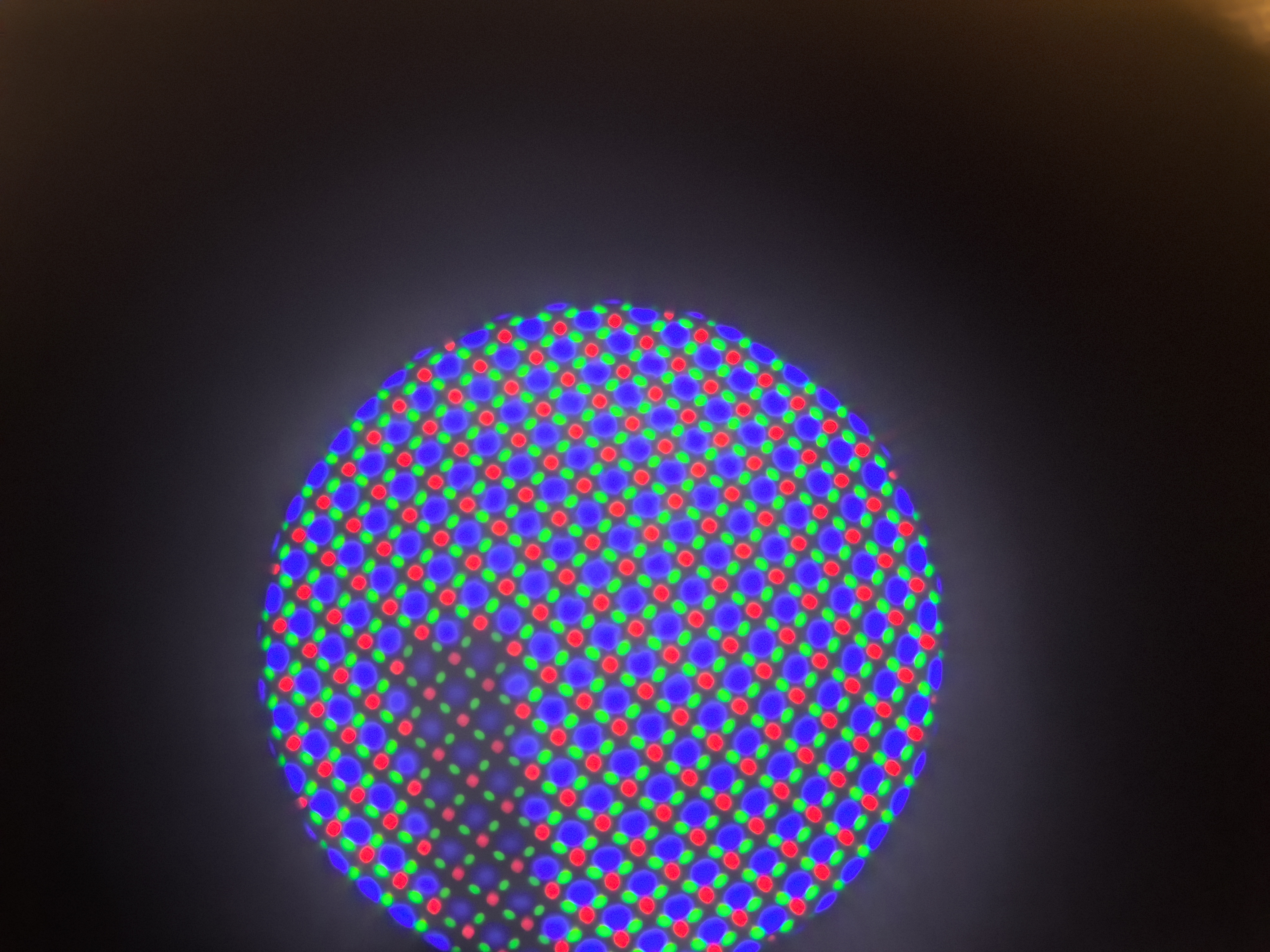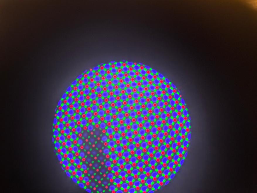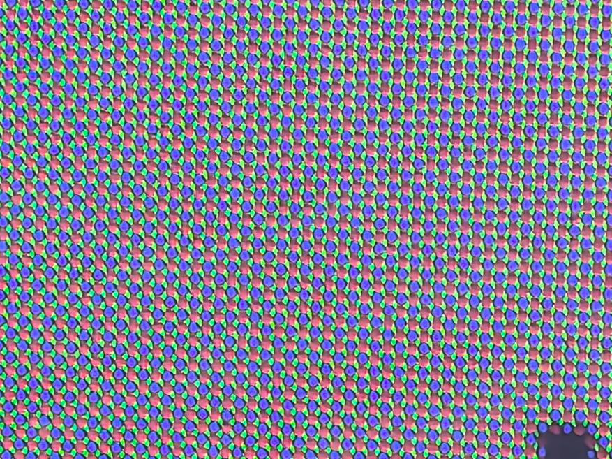 Пиксели LTPO дисплея через карманный микроскоп Svbony SV603 (обзор здесь) и камеру HUAWEI Pura 70 Ultra показал на следующих фотографиях. Структура пикселей — привычная для OLED-экрана: 2 красных, 4 зелёных и один синий диоды, расположенные в виде ромба.