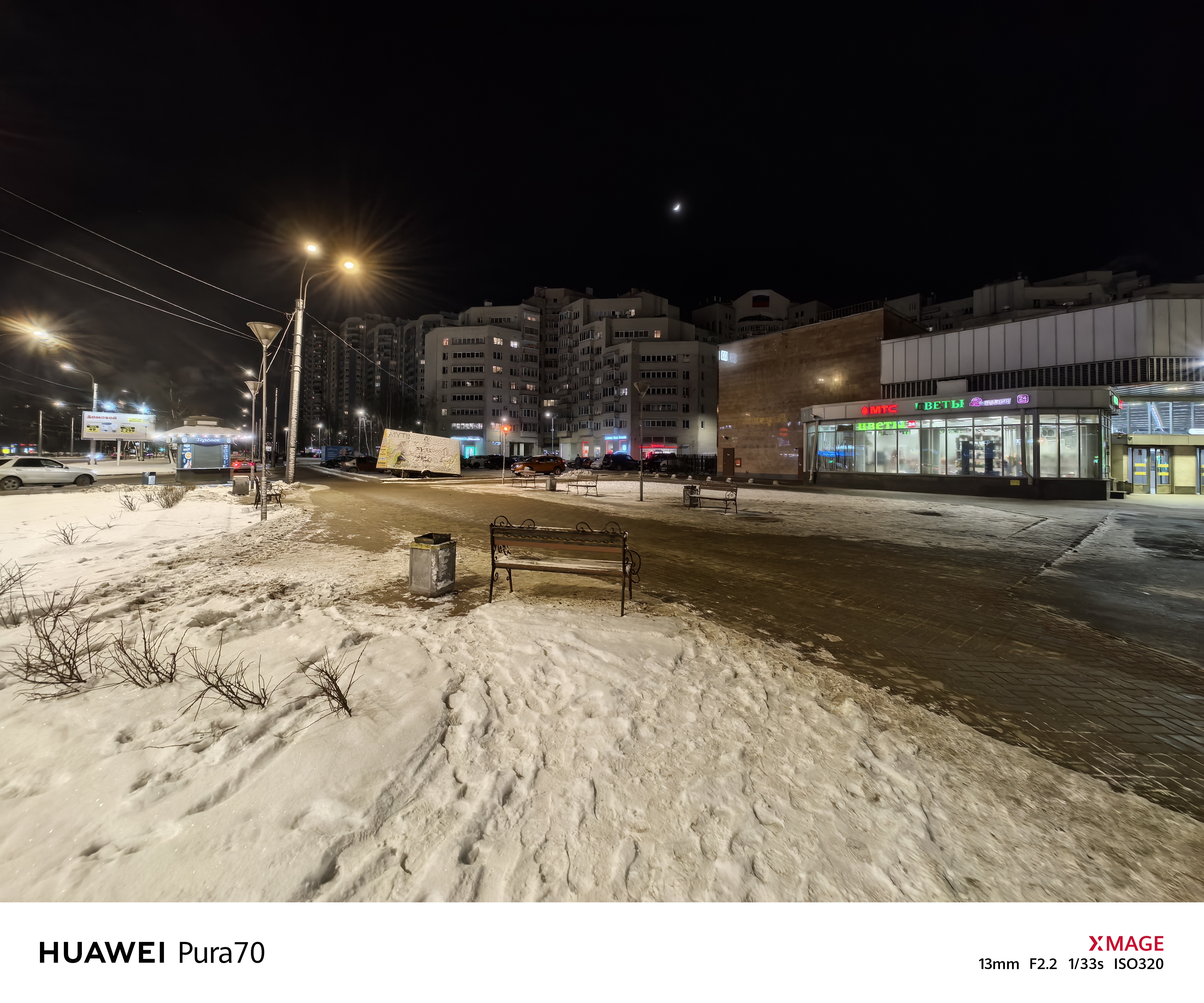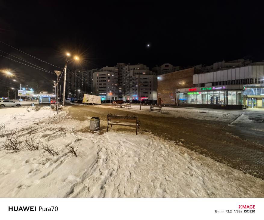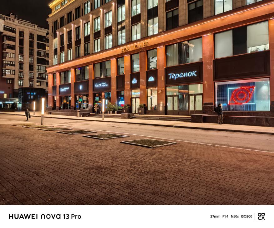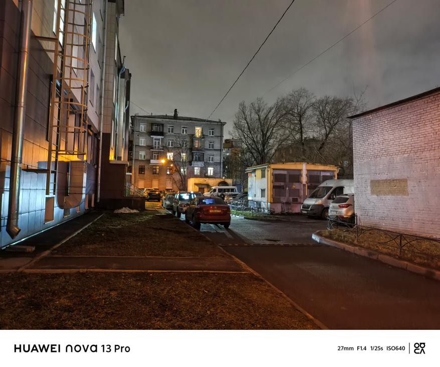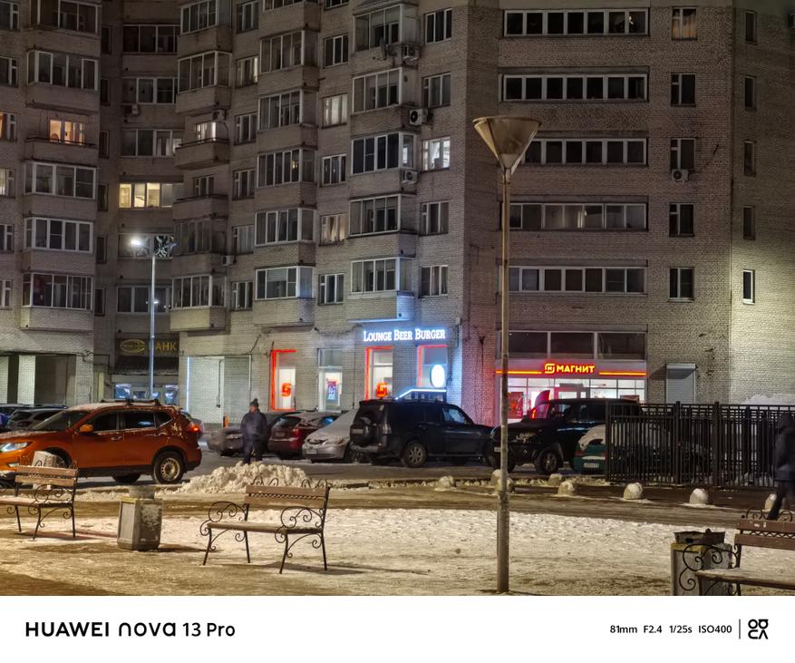 В темное время суток разница остаётся такой же, как и в примерах выше. Линзы Pura 70 Ultra «поймали» полосы от точечных источников света. На Nova 13 Pro такого нет из-за меньшего количества стекл до матрицы. Детализация похуже у Nova 13 Pro, но тут сравнение камер из разных ценовых категорий, поэтому некритично.