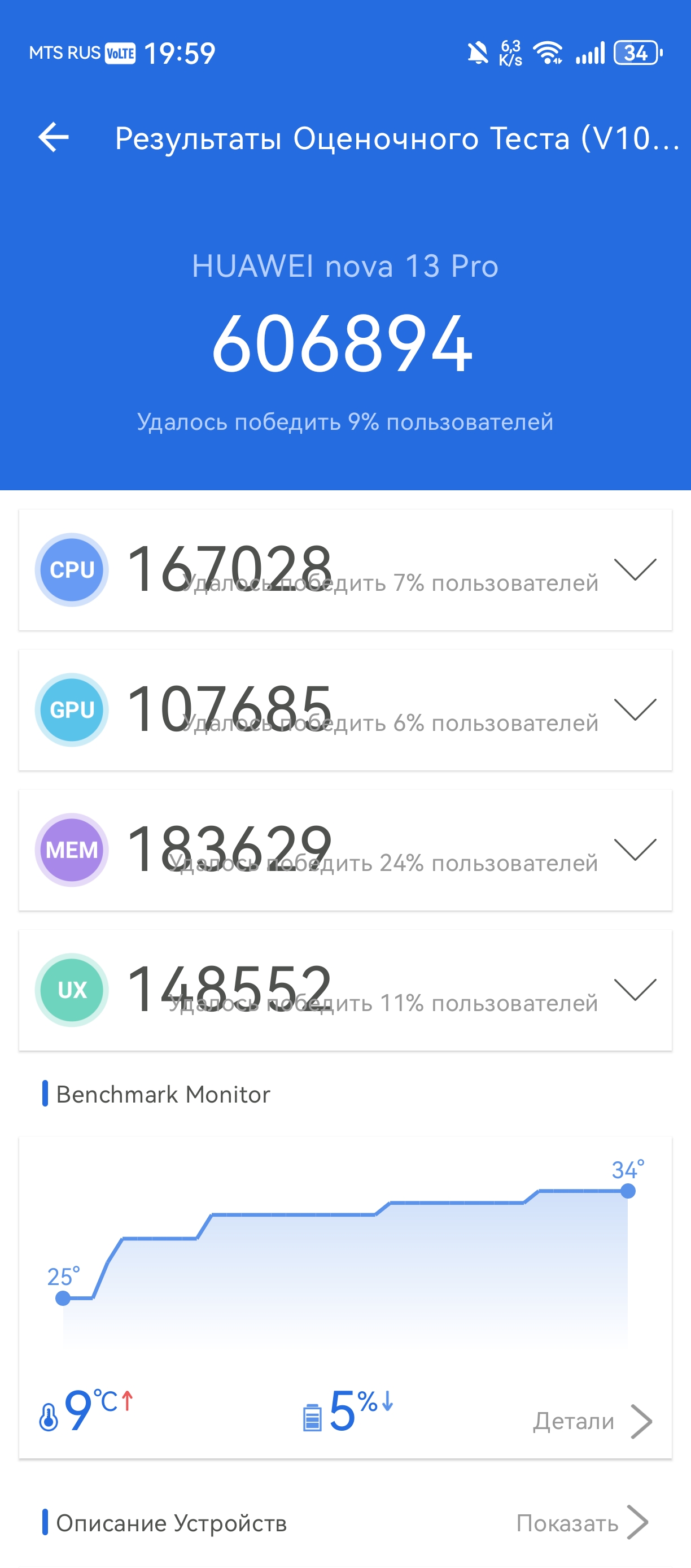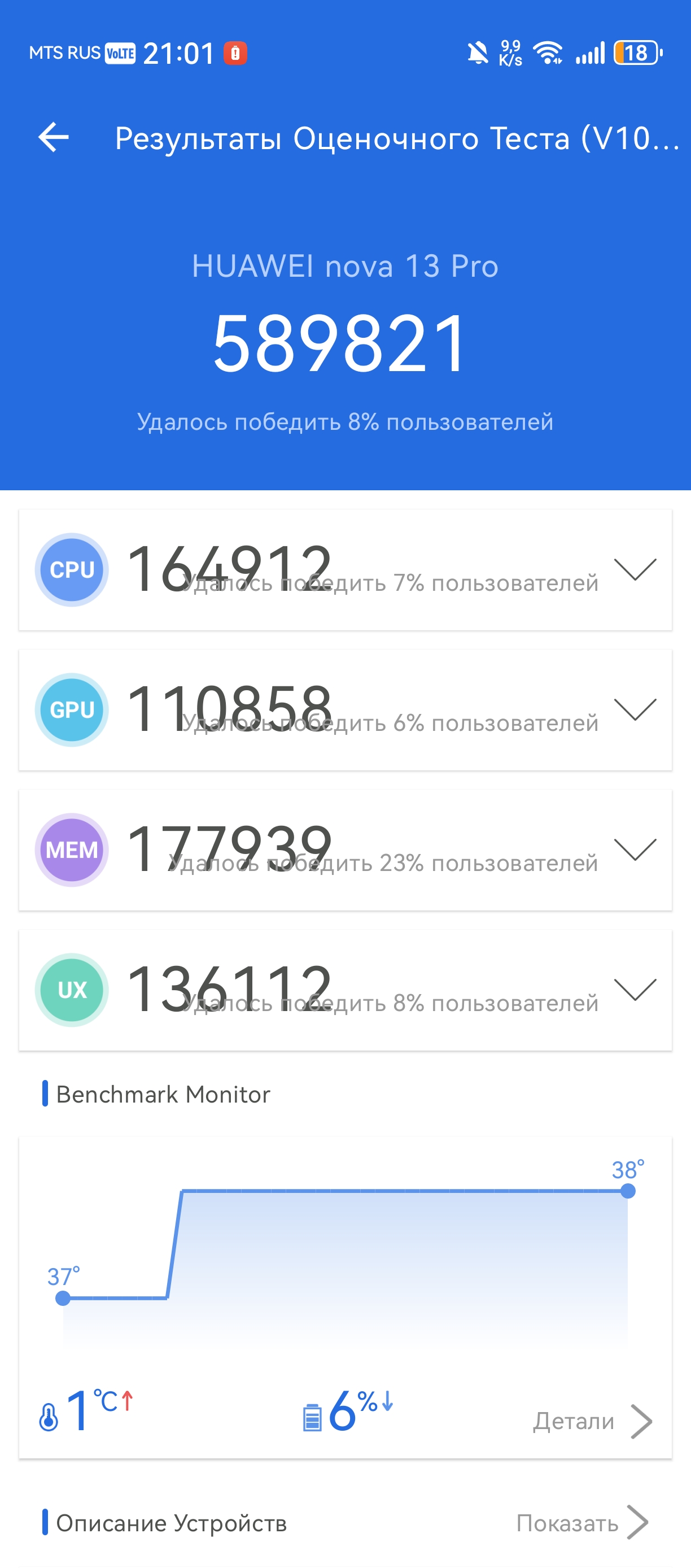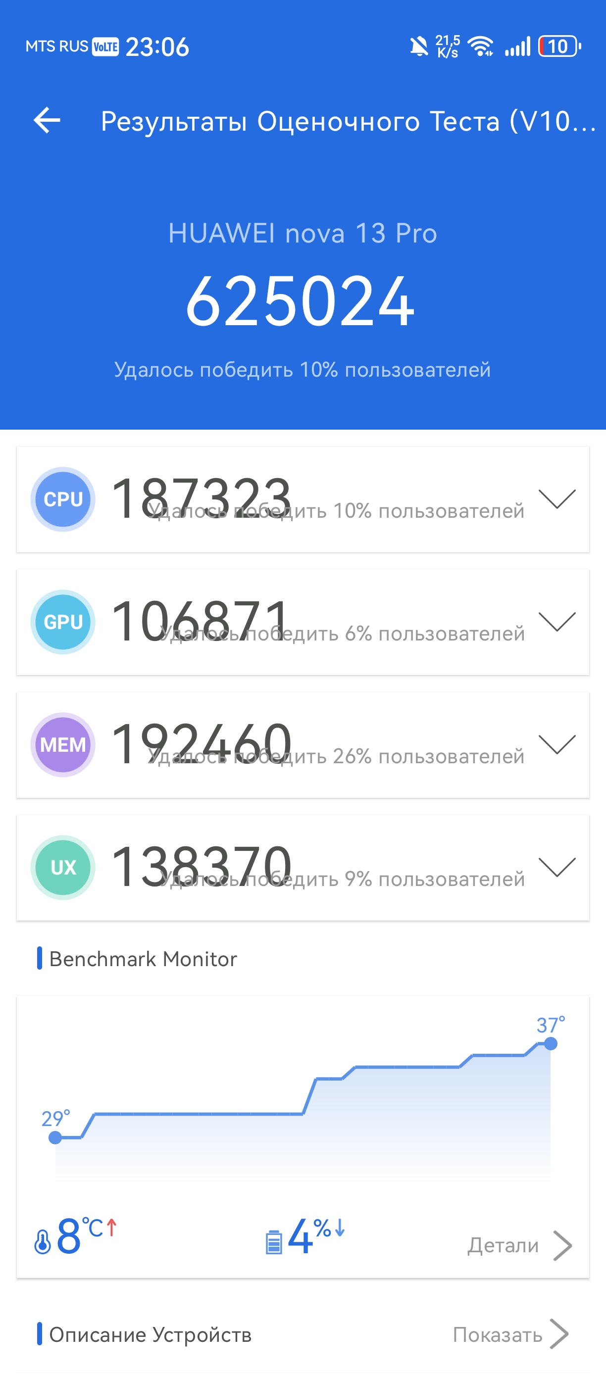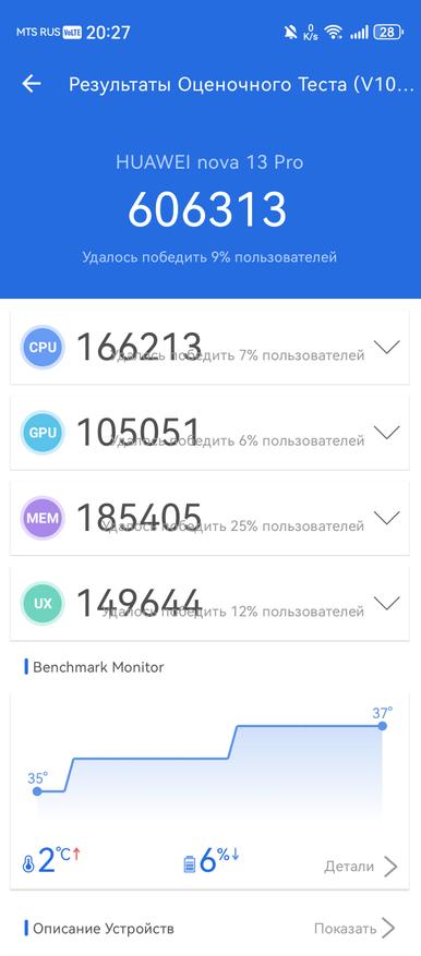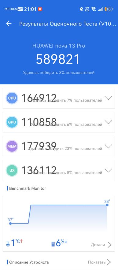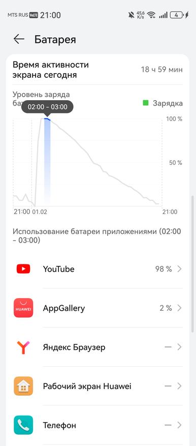 В синтетическом тесте на разряд аккумулятора хватило на более 19 ч просмотра YouTube на 50% уровне яркости. Такого результата я не получил у Poco X7 Pro (12 ч) с большей ёмкостью аккумулятора. Результат HUAWEI Nova 13 Pro получился на 50% больше. При обычном использовании ёмкости аккумулятора хватает минимум на полные сутки.