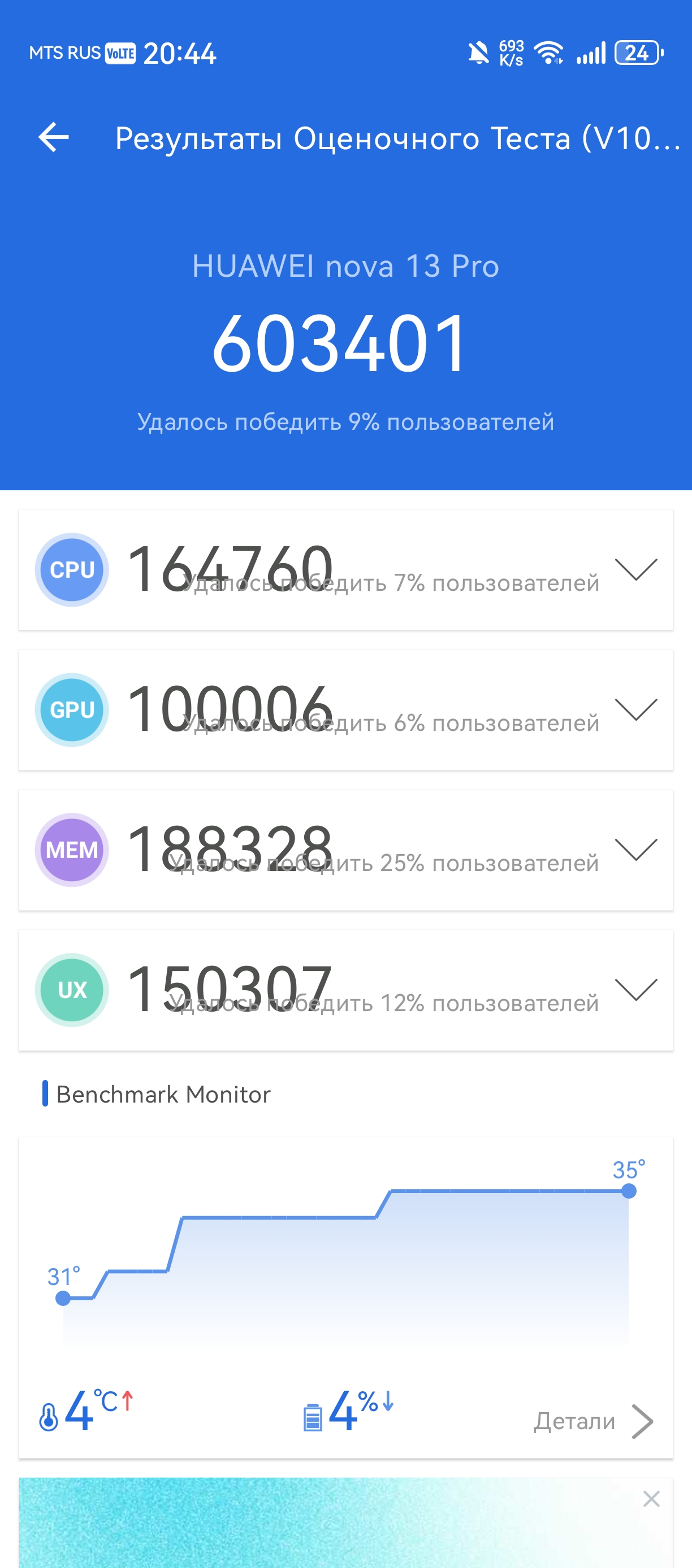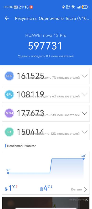 Я быстро привык к опции, когда экран остаётся активным, пока на него смотрю, со смартфона HUAWEI P50 Pro. В других ее не хватало. В случае обозреваемого было аналогичное состояние. Не смотря на то что это на любителя, но удобно. Точно также дела обстояли со скриншотом. Я привык его делать жестами. В Nova 13 Pro жестов нет. В остальном я не сильно почувствовал разницу в техническом плане при ежедневном взаимодействии. Проще — разницы между 625 тыс. баллов в Антуту и 1 млн. (в случае Pura 70 Ultra) нет. Интерфейс такой же плавный, отклик системы быстрый, в программах недостатка производительности нет. В играх будут ограничения, но я кроме PUBG не играю во что-то другое.
