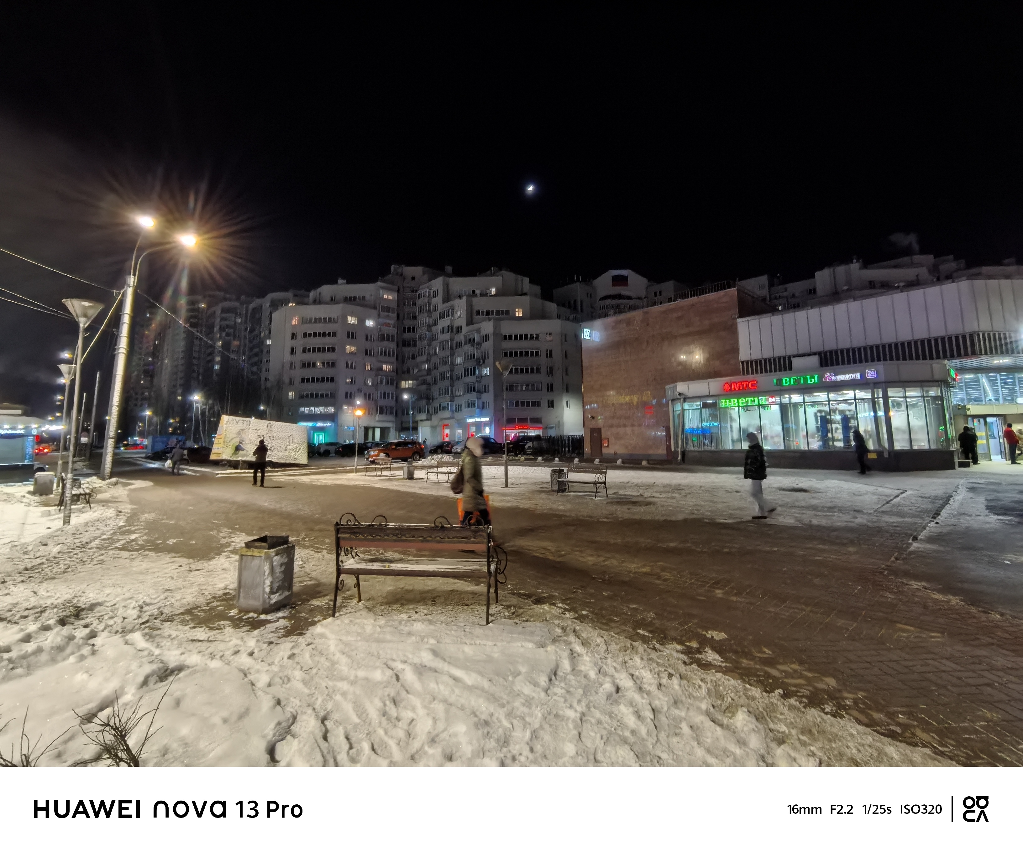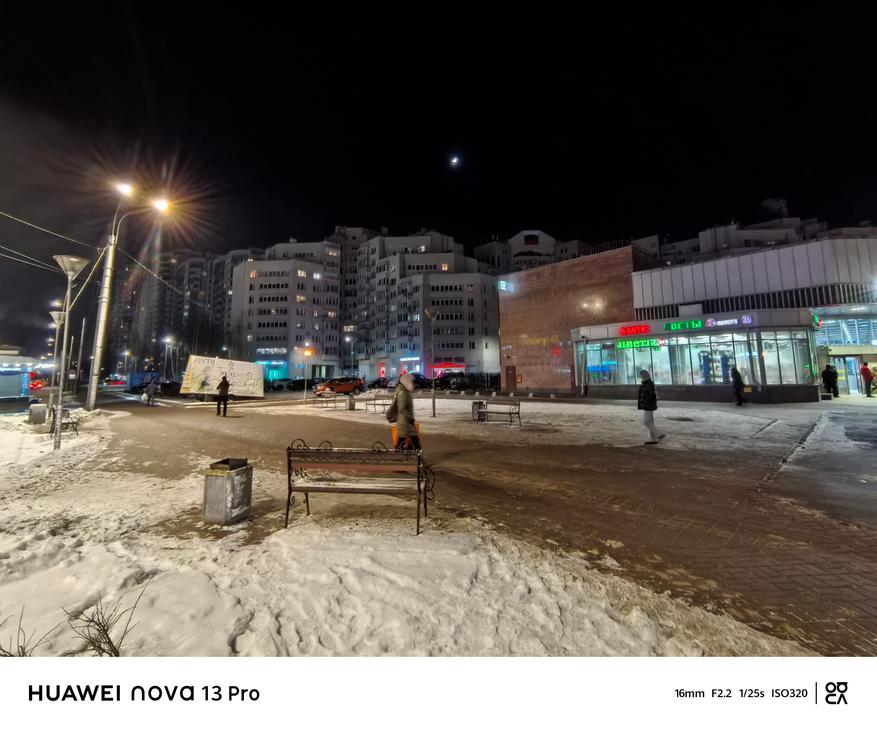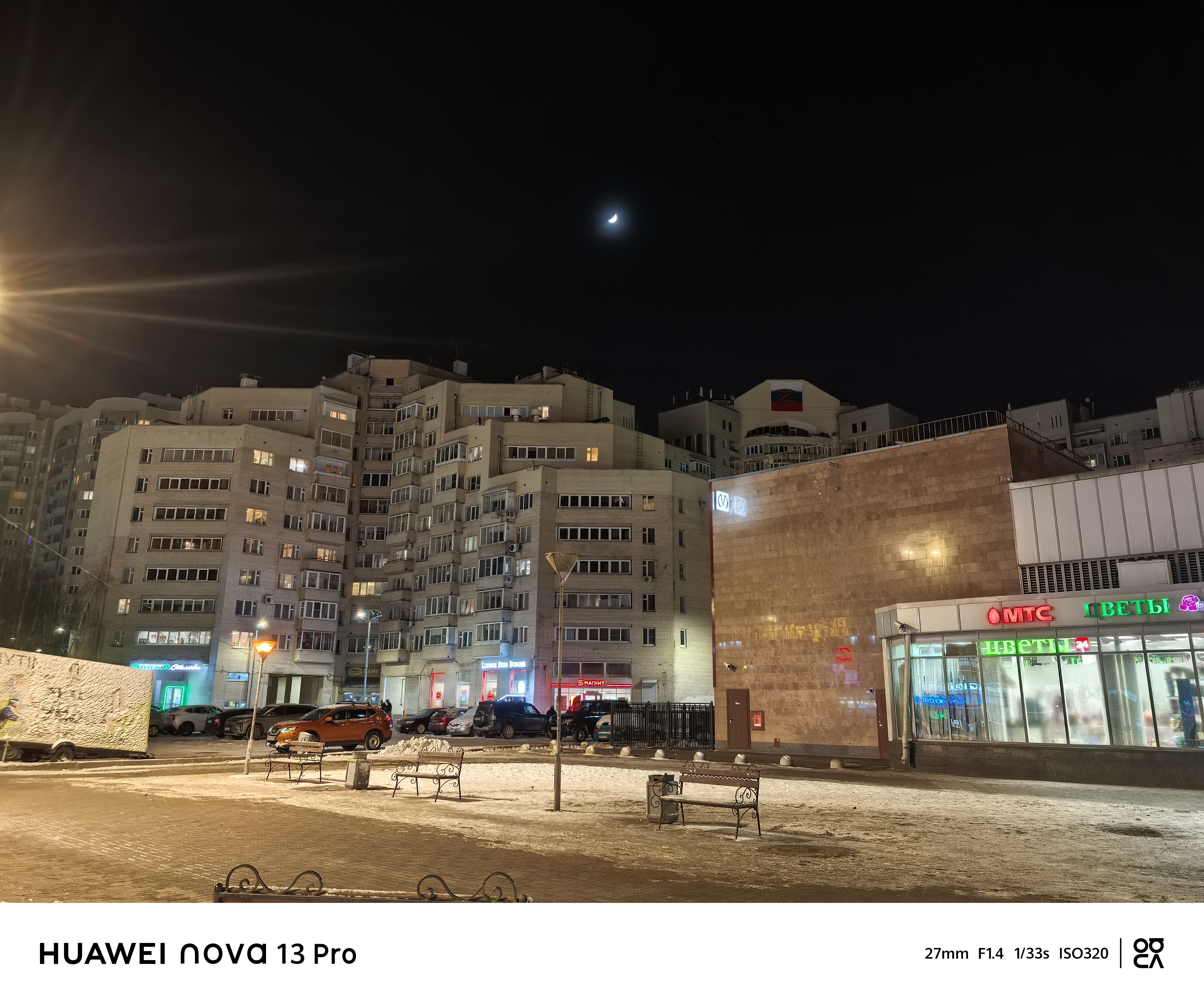 Кадр примерно такой же, как в случае со льдом. Nova 13 Pro показал хороший, четкий ночной снимок, но не поймал теплый свет фонарей. На камеры второго телефона это удалось сделать, но не сказать, что изображение от этого выиграло. При сравнении я бы отдал предпочтение первому, так как на втором, кажется, неправильно подобран баланс белого (и не важно, что в действительности красный оттенок от фонарей был так заметен). Можно сделать осторожный вывод, что камеры и алгоритм Nova 13 Pro не настолько точны в деталях, но большая точность обычно лежит в другом ценовом сегменте.