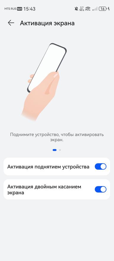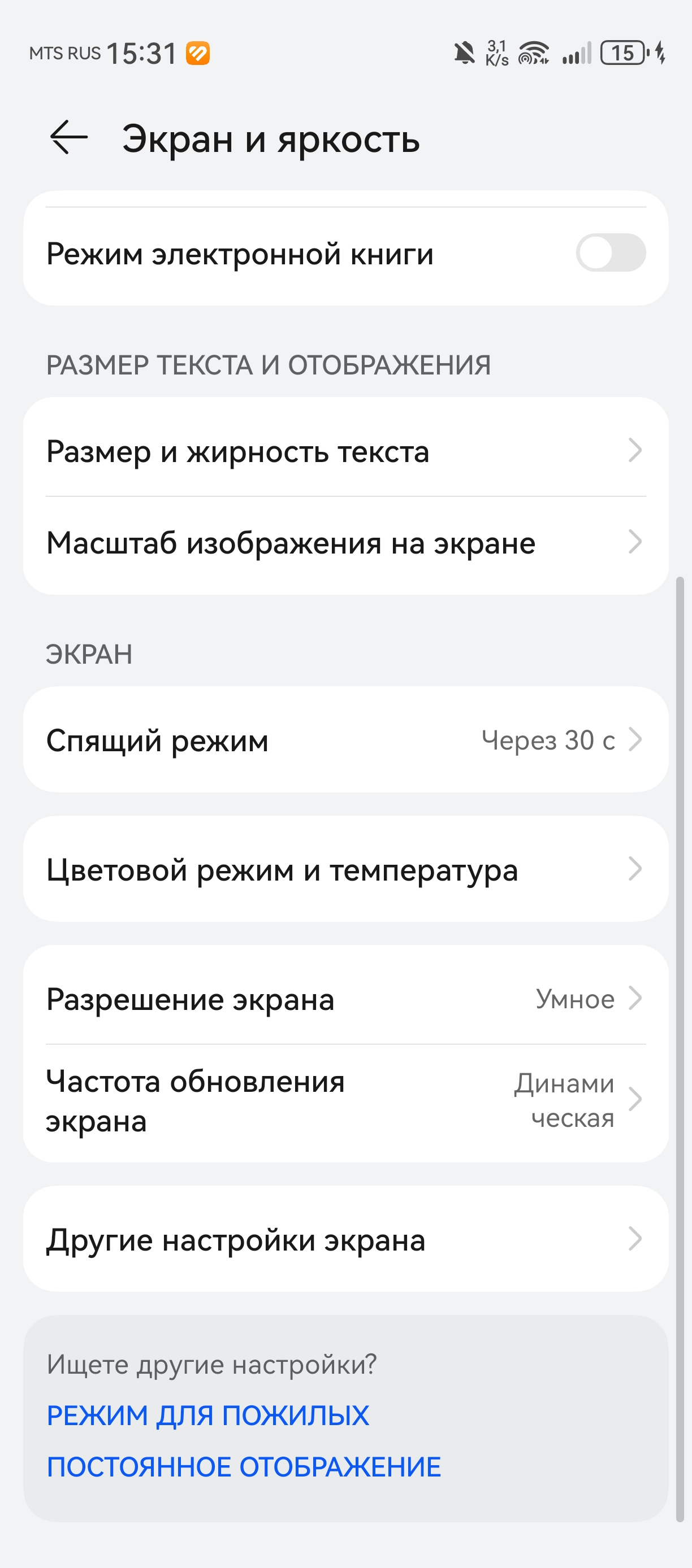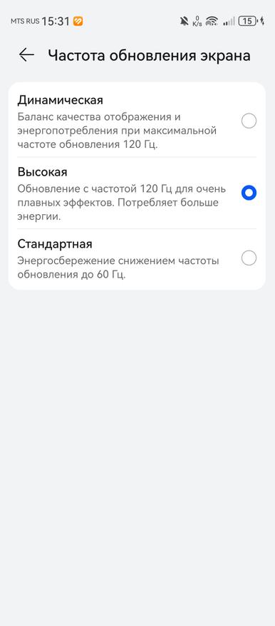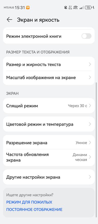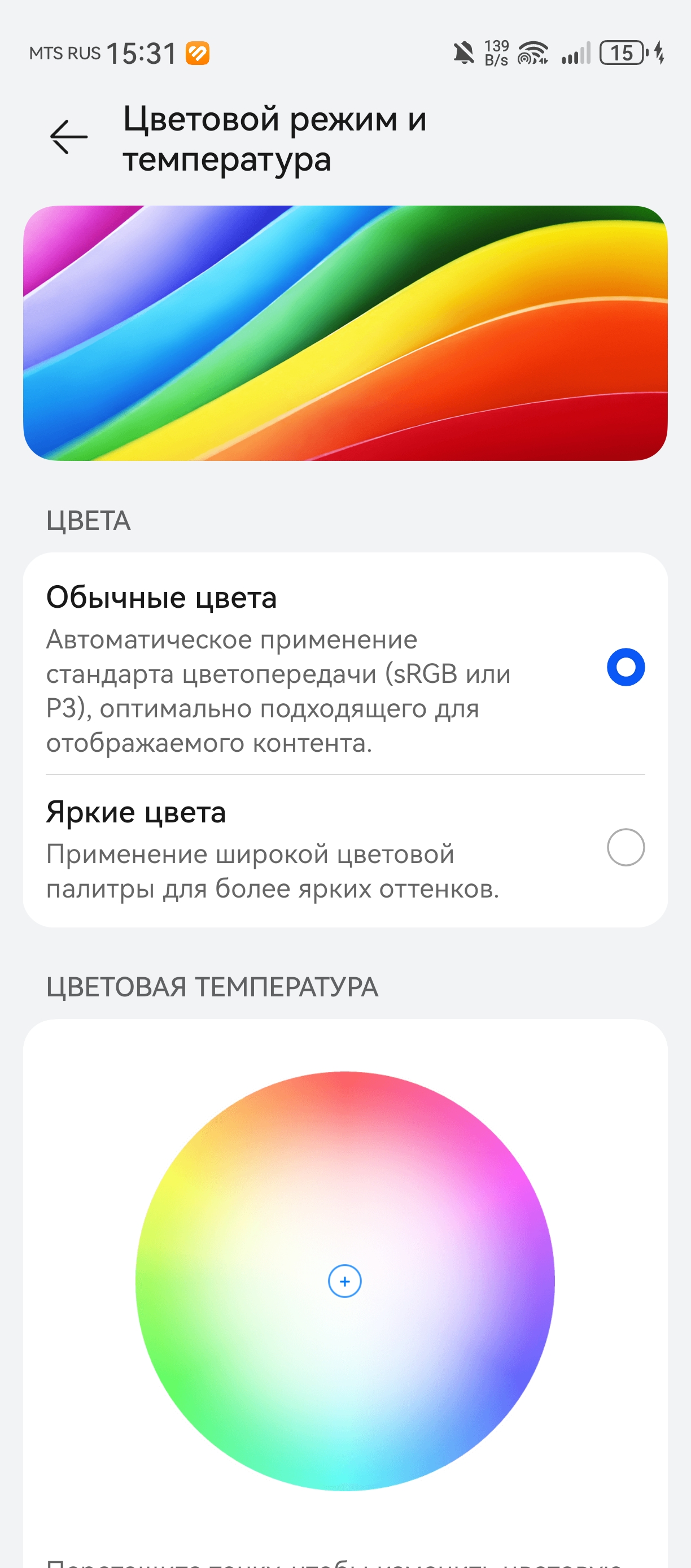 Подсветка экрана может обновляться с частотой от 1 до 120 Гц. Экран в модели «дорогой», в смысле что это не просто OLED, а LTPO OLED. Разница в меньшем энергопотреблении и динамичной частоте обновления, что расходует меньше заряда. Я привык на смартфоне HUAWEI активировать опцию «Защита глаз». Экран приобретает небольшой жёлтый оттенок, приглушая яркость и делая цвета темными. Можно выбрать уровень «желтизны». Цветопередачу можно настроить в двух вариантах: «Обычные» и «Яркие» цвета. Позже я перешёл на вторую. Мне она больше понравилась, так как отображение стало с большим количеством теплых цветов. Первый вариант отображения цветов для меня был «холодным». Я спрятал вырез экрана под черную полоску, включил активацию экрана на касания и подъем. Это все мои настройки.