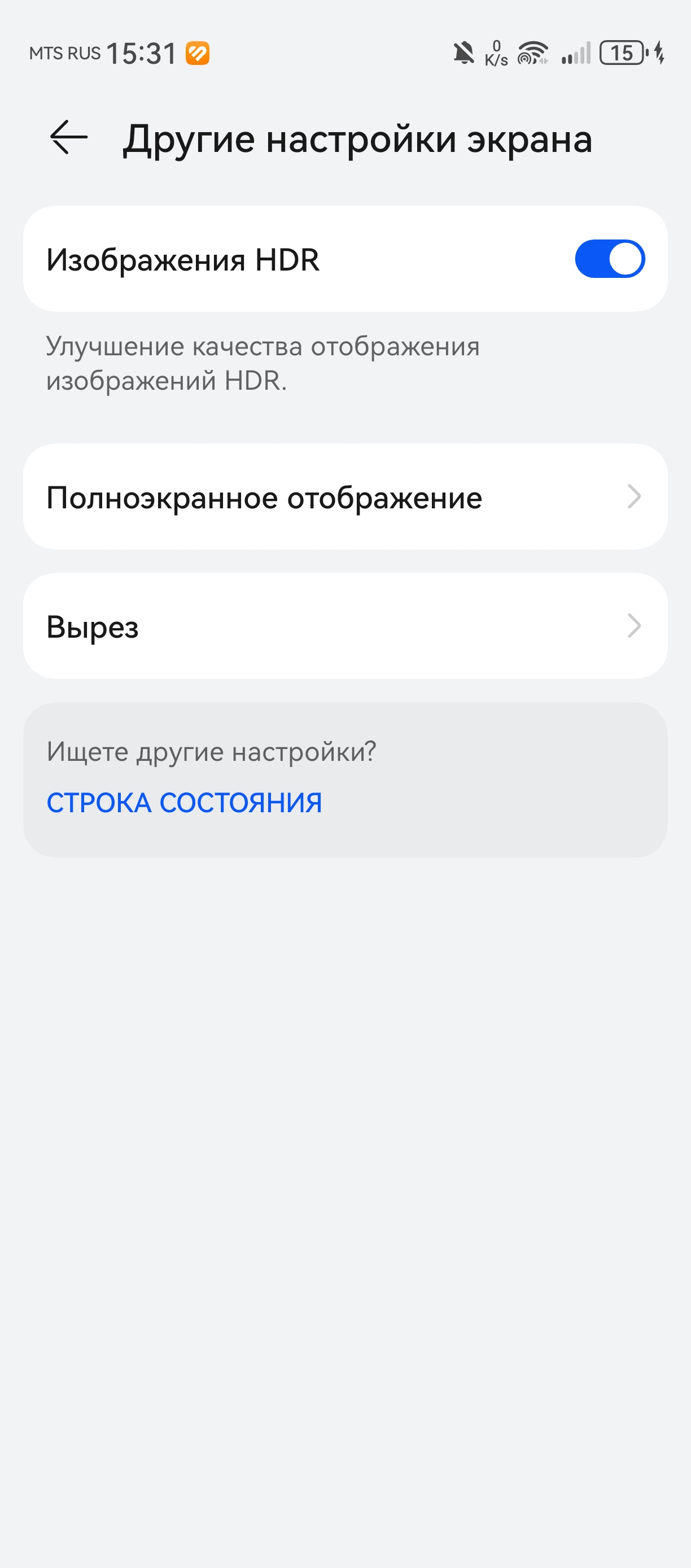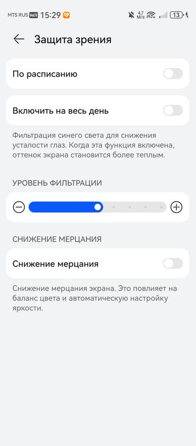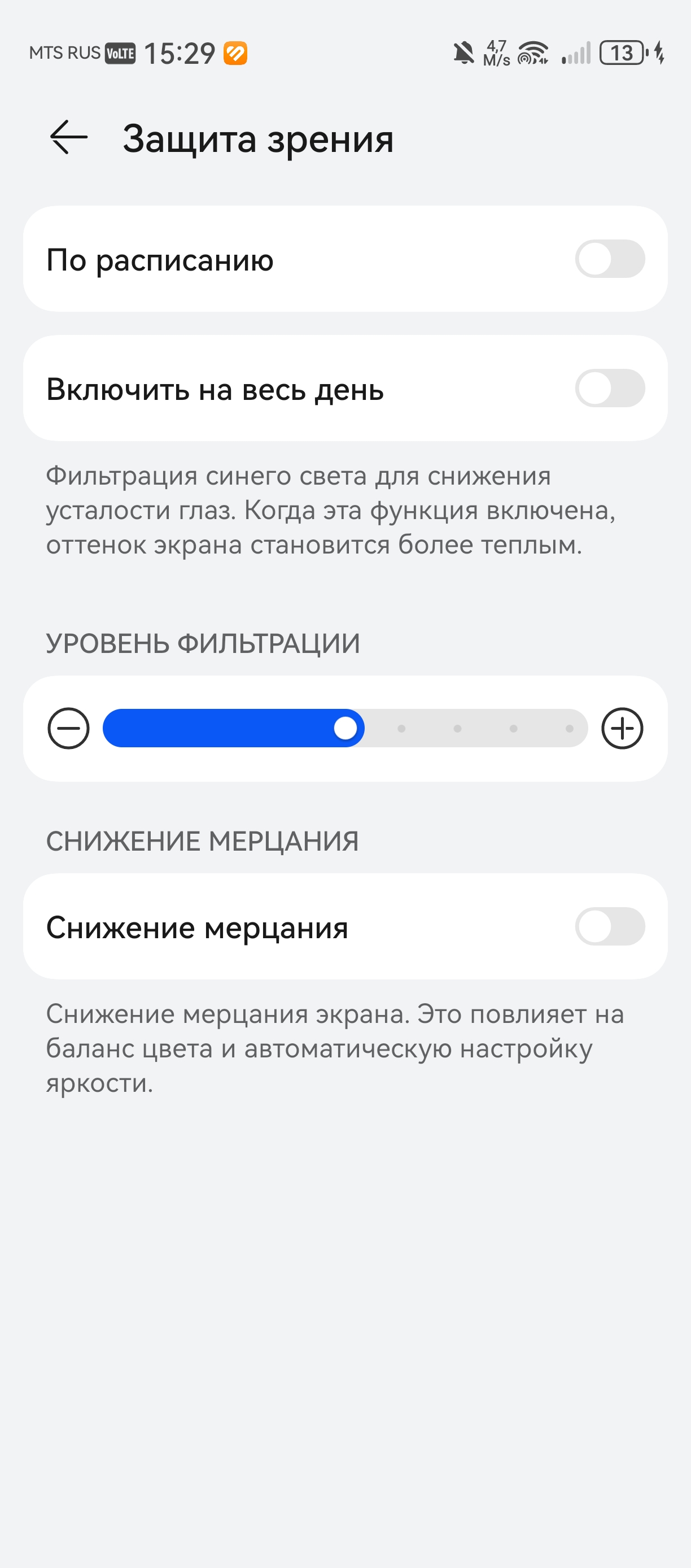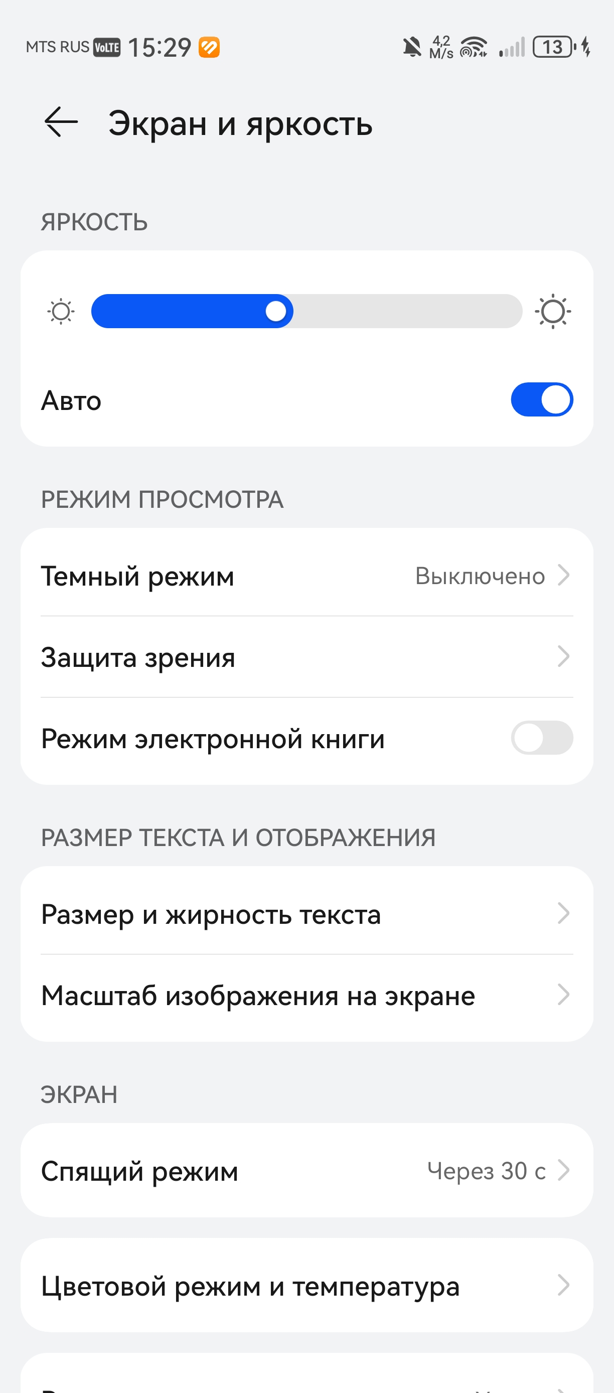 Подсветка экрана может обновляться с частотой от 1 до 120 Гц. Экран в модели «дорогой», в смысле что это не просто OLED, а LTPO OLED. Разница в меньшем энергопотреблении и динамичной частоте обновления, что расходует меньше заряда. Я привык на смартфоне HUAWEI активировать опцию «Защита глаз». Экран приобретает небольшой жёлтый оттенок, приглушая яркость и делая цвета темными. Можно выбрать уровень «желтизны». Цветопередачу можно настроить в двух вариантах: «Обычные» и «Яркие» цвета. Позже я перешёл на вторую. Мне она больше понравилась, так как отображение стало с большим количеством теплых цветов. Первый вариант отображения цветов для меня был «холодным». Я спрятал вырез экрана под черную полоску, включил активацию экрана на касания и подъем. Это все мои настройки.