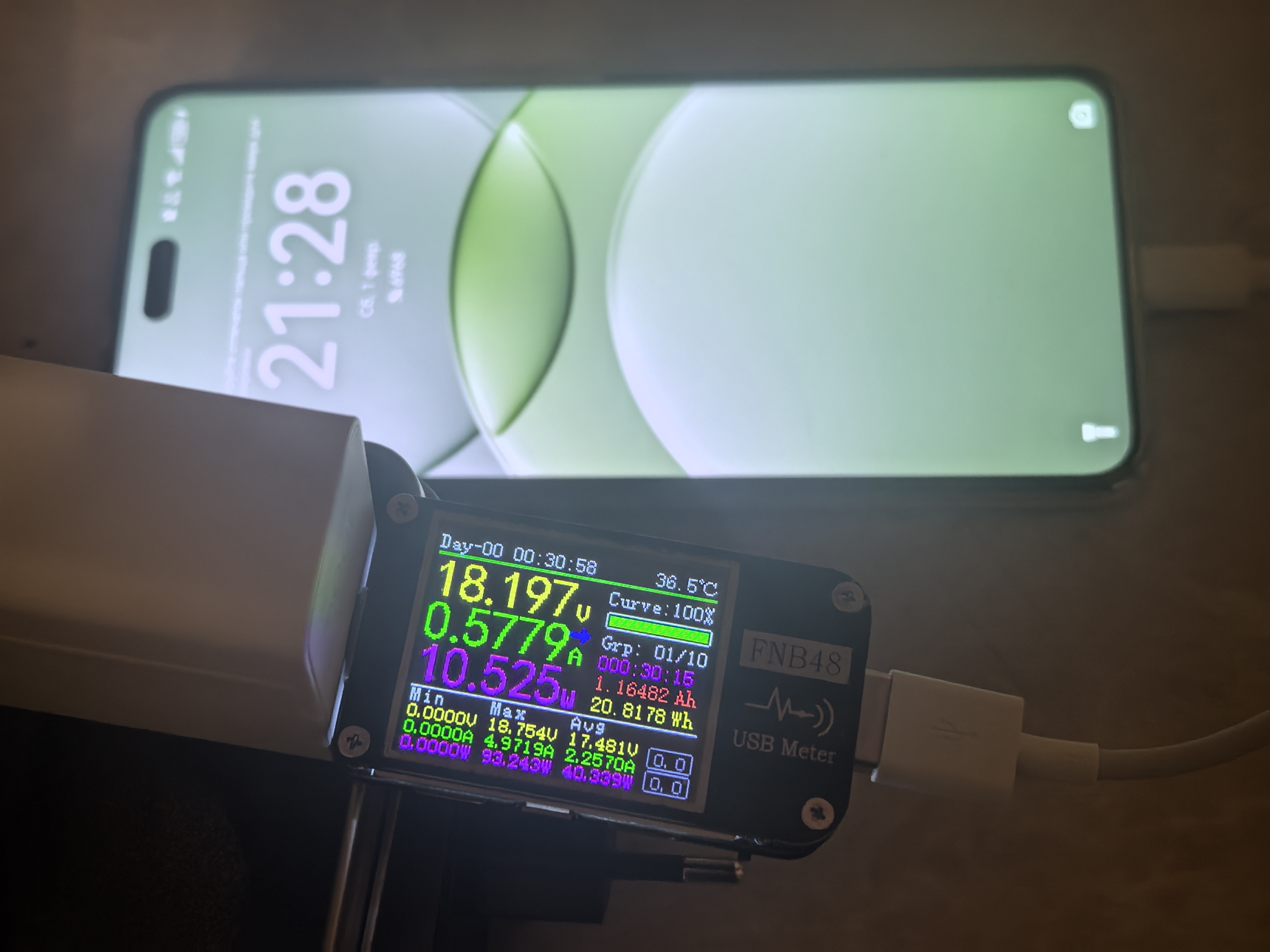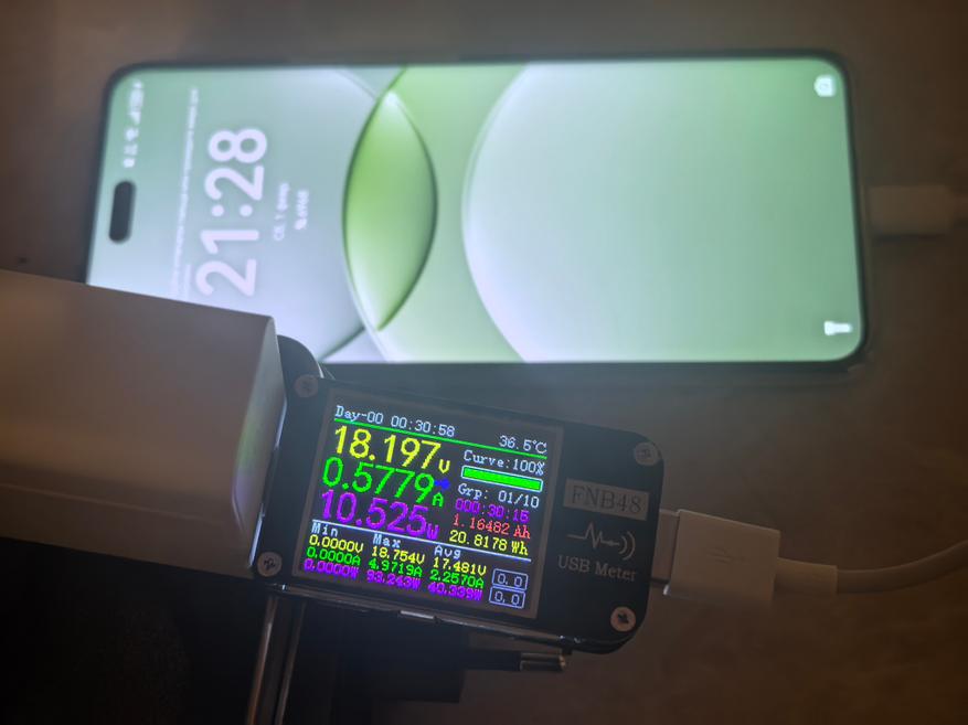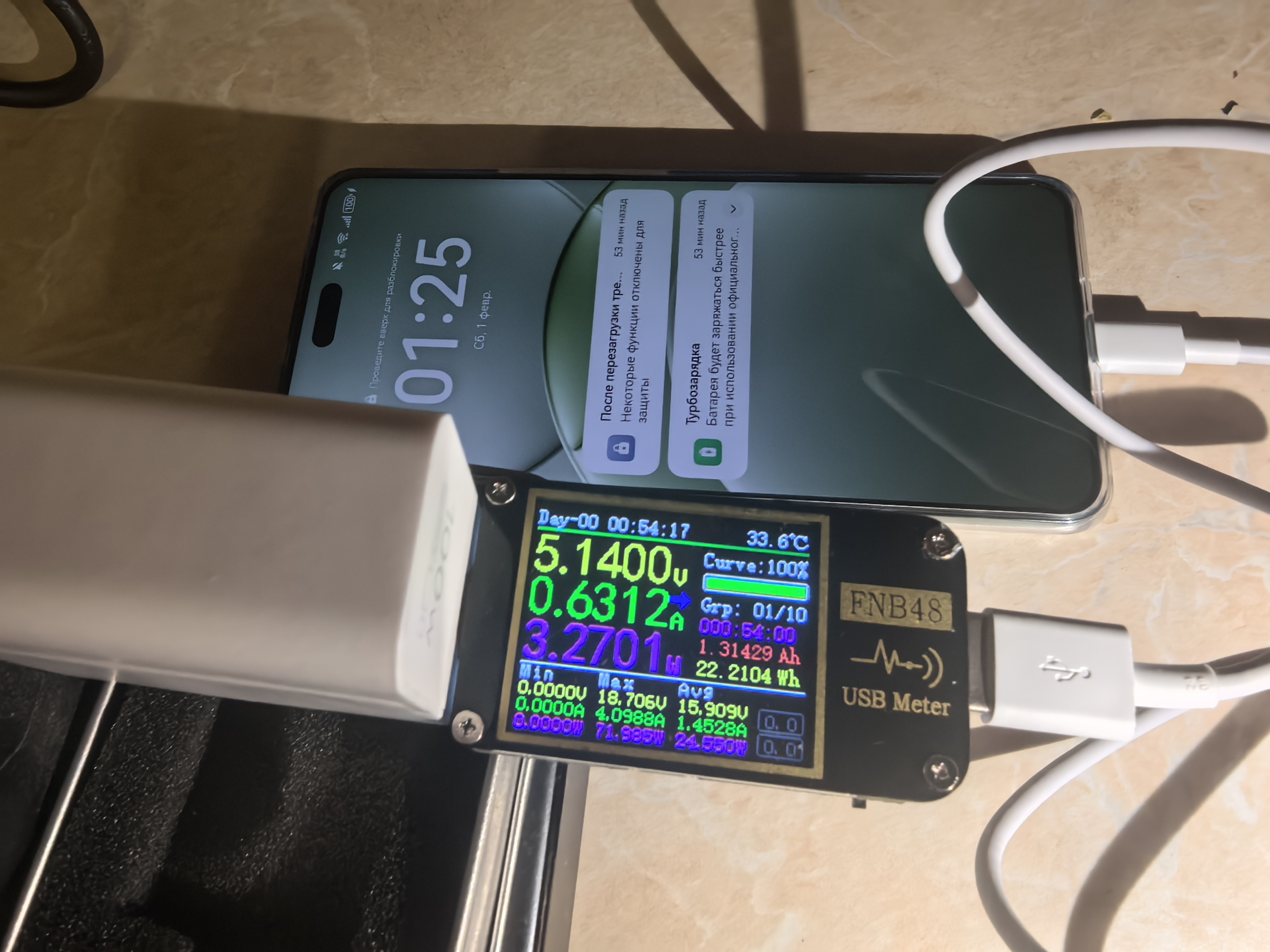 Заряжается смартфон быстро при помощи комплектного 6А кабеля и 100W ЗУ. Есть два режима заряда: обычный и «Турбозарядка». В первом за 20 минут аккумулятор восполняется до 50%, как и Poco X7 Pro с комплектным ЗУ на 90W. Только емкость аккумулятора у второго больше, чем у обозреваемого. Процесс проходит на проприетарном протоколе Huawei Super Charge. Полный заряд в обычном режиме занял 54 мин и составил 1314mAh (22,2Wh). По тестеру я получил максимально мощность заряда в 72W. В случае Poco X7 Pro значение было 43W, но в обоих телефонах тестер тормозил заряд (не давал достигнуть максимальной мощности).