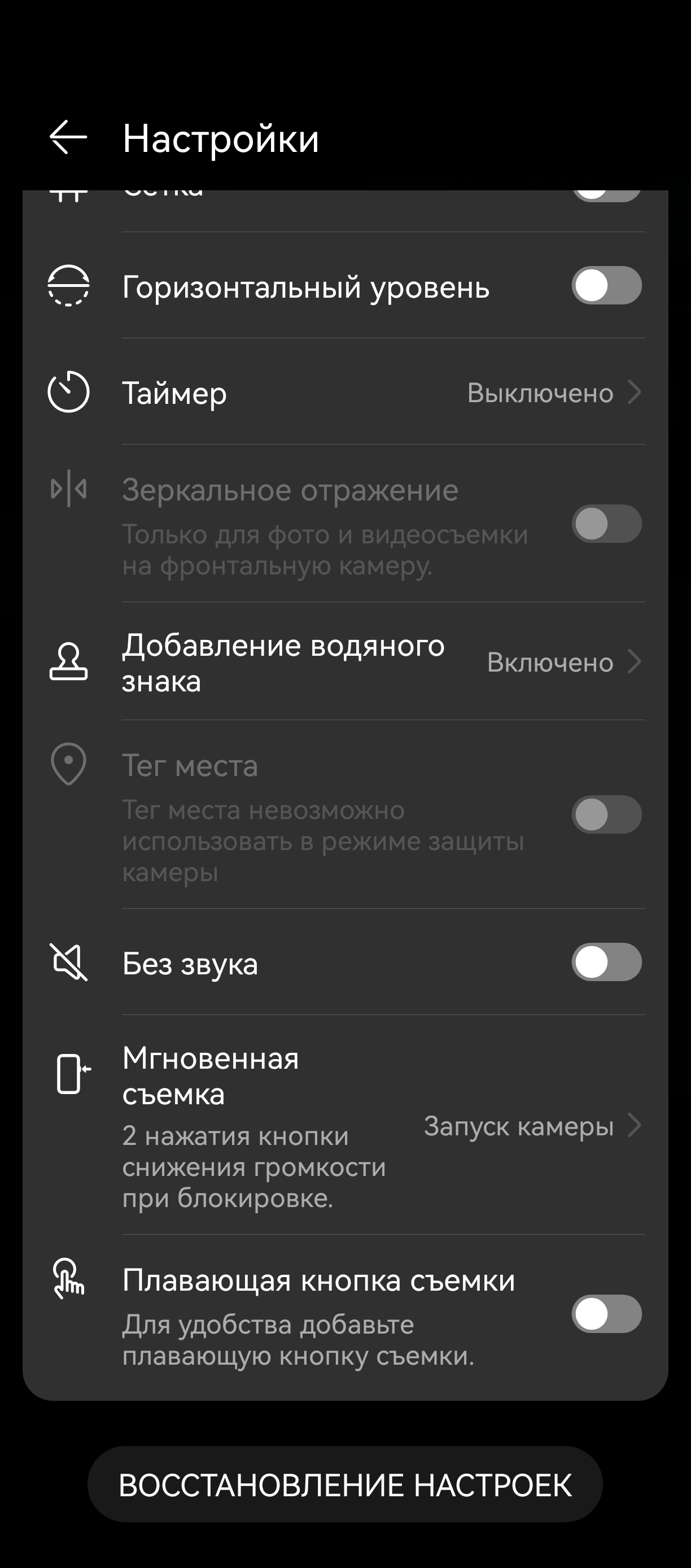 | Варианты съёмки: | Физическая диафрагма, документы, замедленное видео, интервальная, панорама, режим «Видеоблог» |