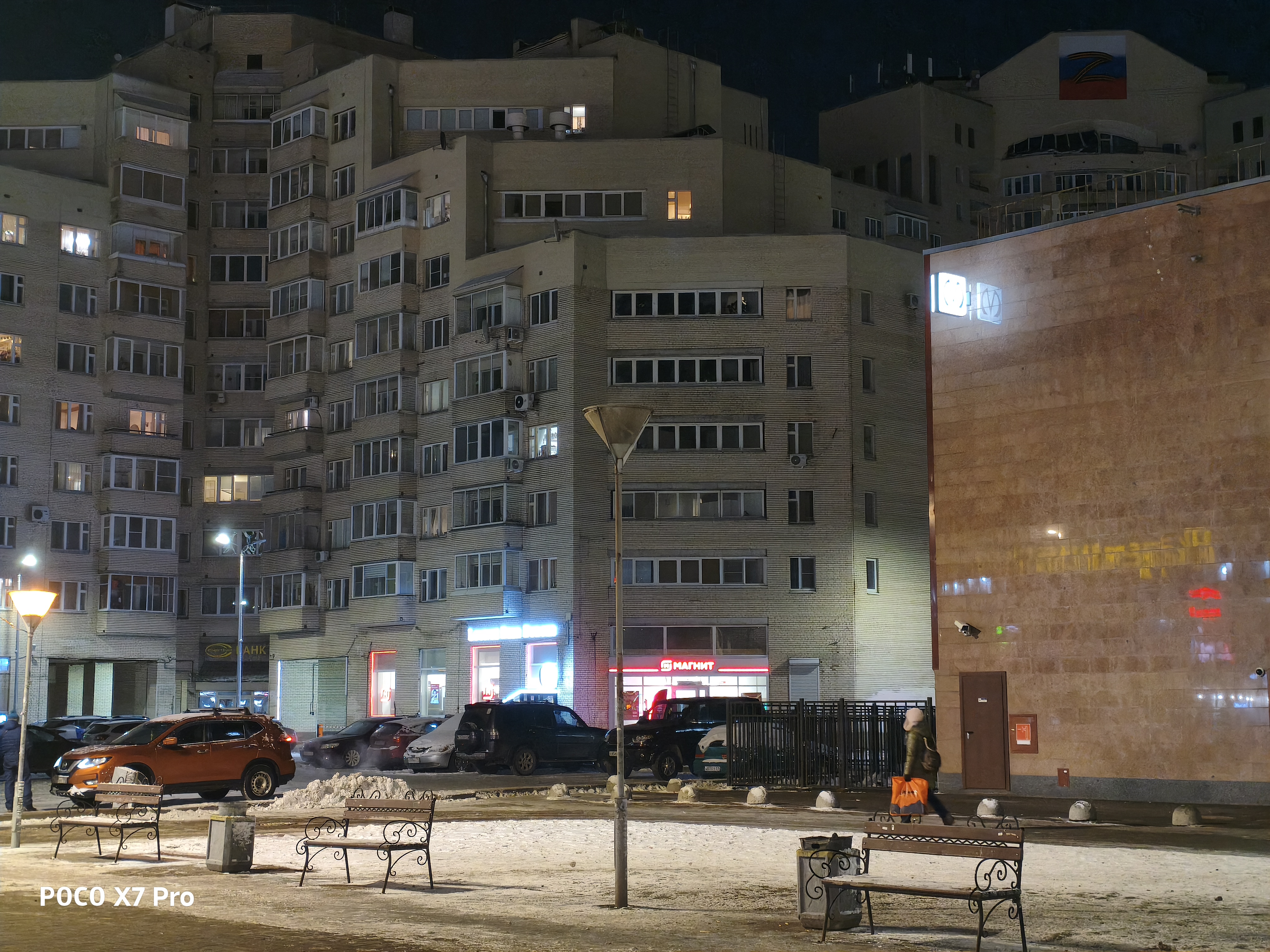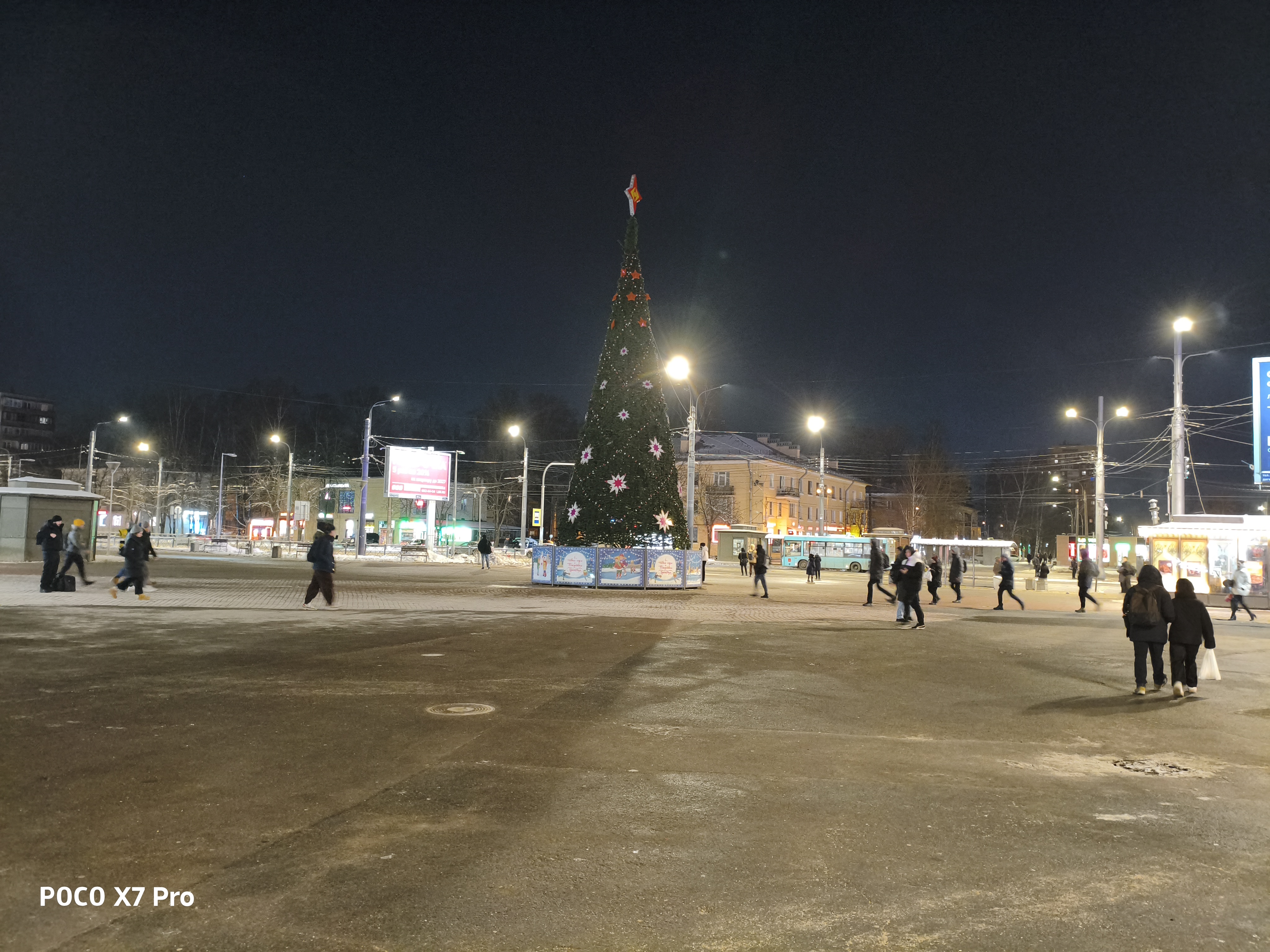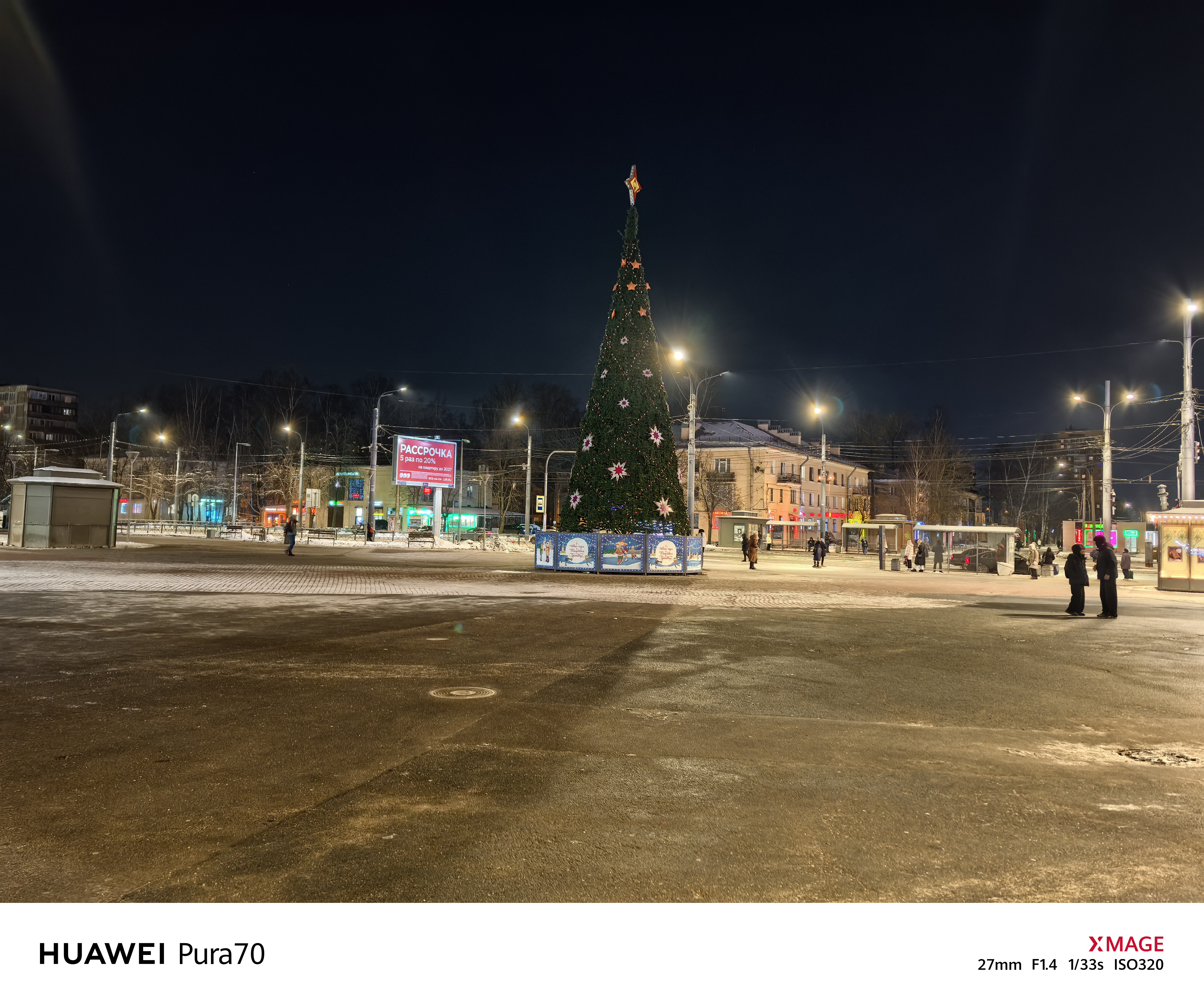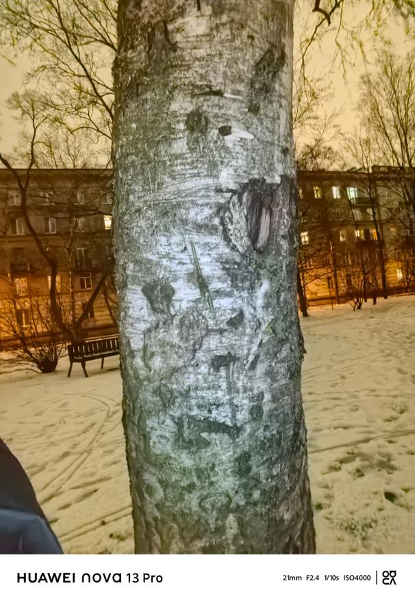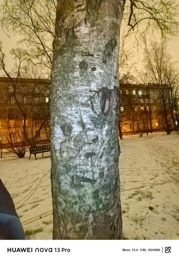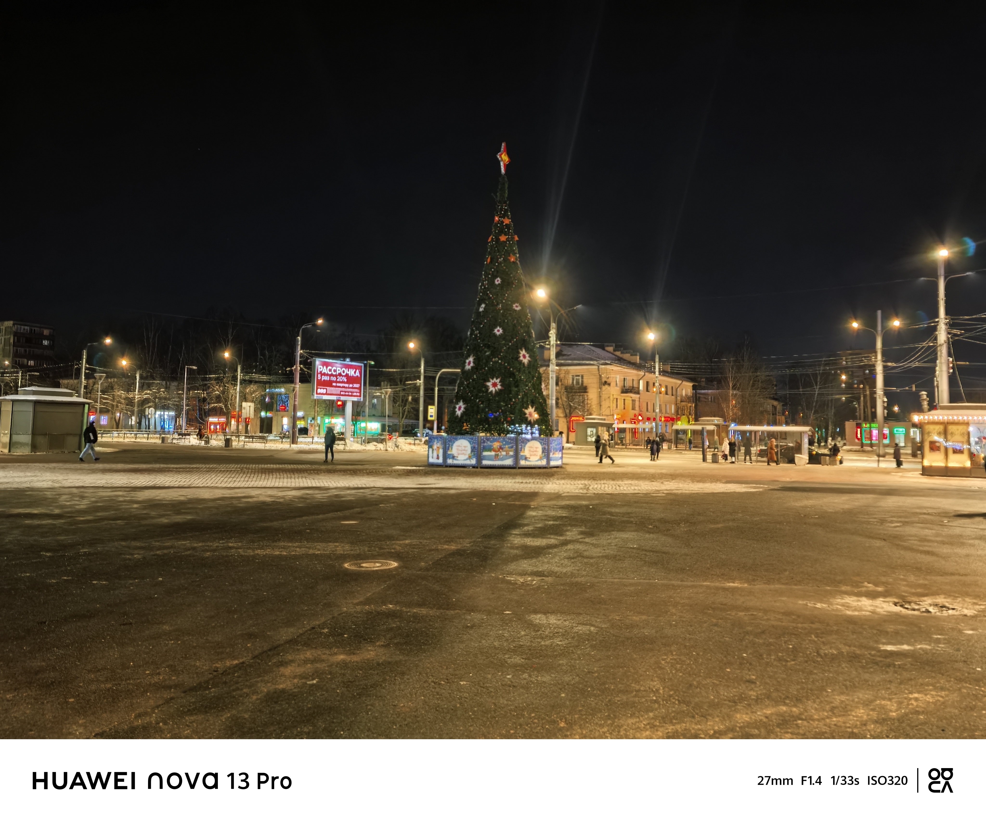 Фотографируя ёлку вечером мне хочется убрать холод из кадра, чтобы акцент был на объекте, а не атмосфере. Тут на помощь приходит способность Nova 13 Pro. В серии снимков мне нравятся два кадра, второй из них с Poco F5 Pro. По количеству шумов Nova 13 Pro не фаворит, но объект на нем выделен лучше, что нельзя сказать про остальные варианты, на которых выделена холодная погода.