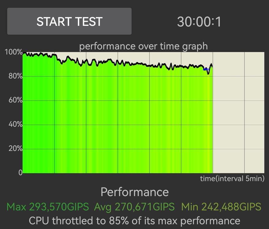 Далее провел тест на троттлинг в течение 30 минут и на 100 потоках. Средний результат — 270671 балл. Все тесты, кроме одного в Antutu, проводились в обычном режиме работы аккумулятора.