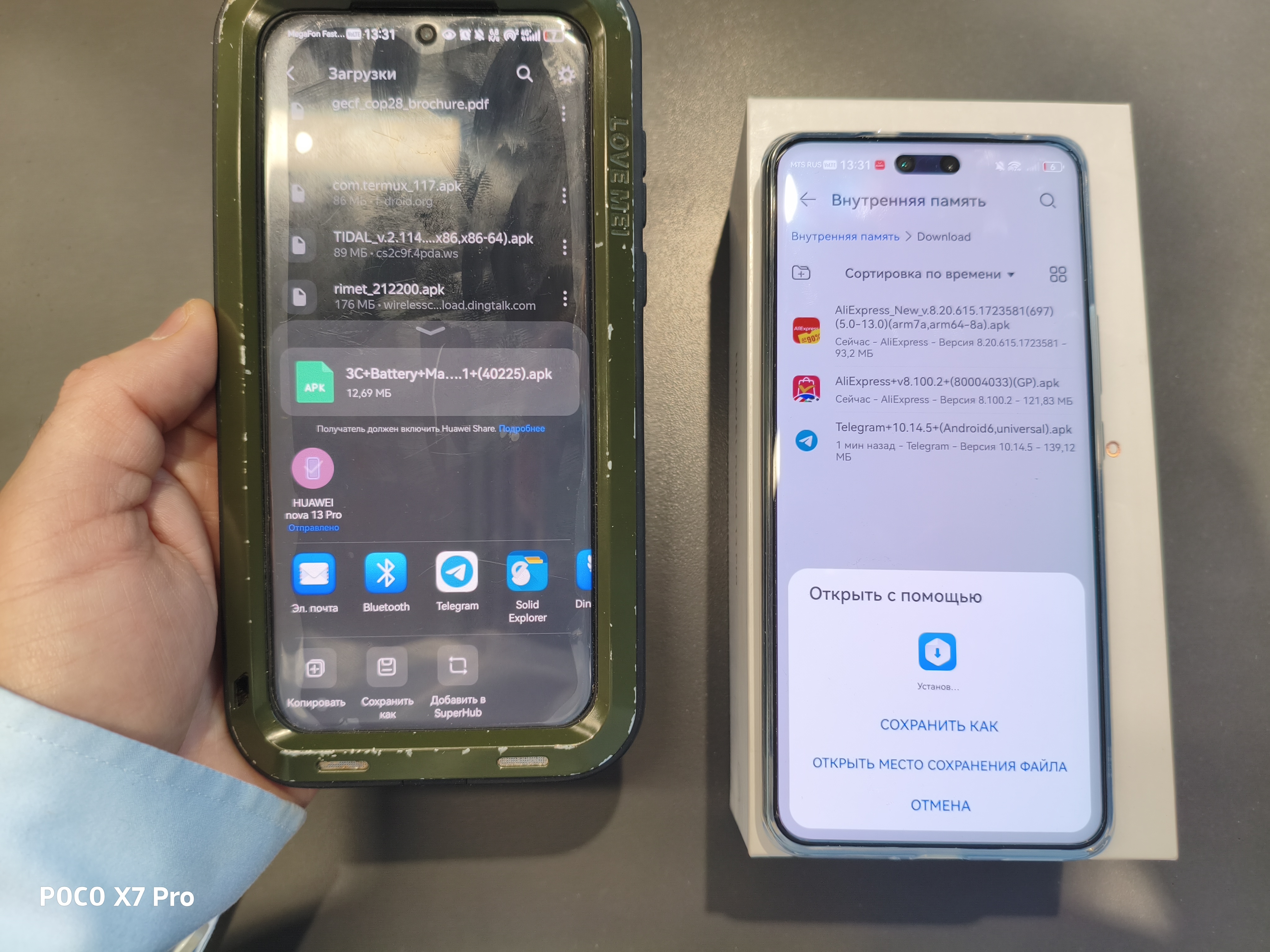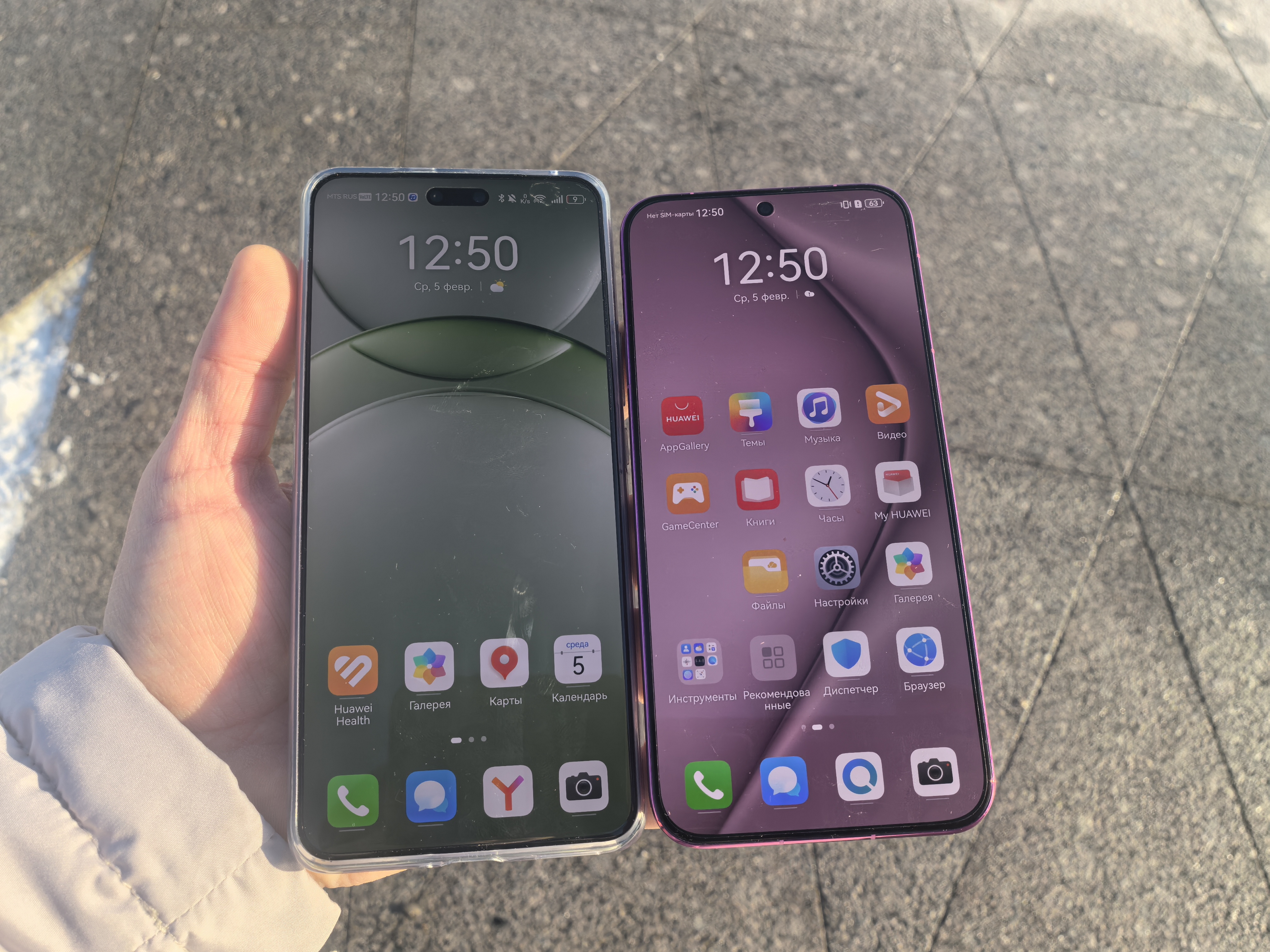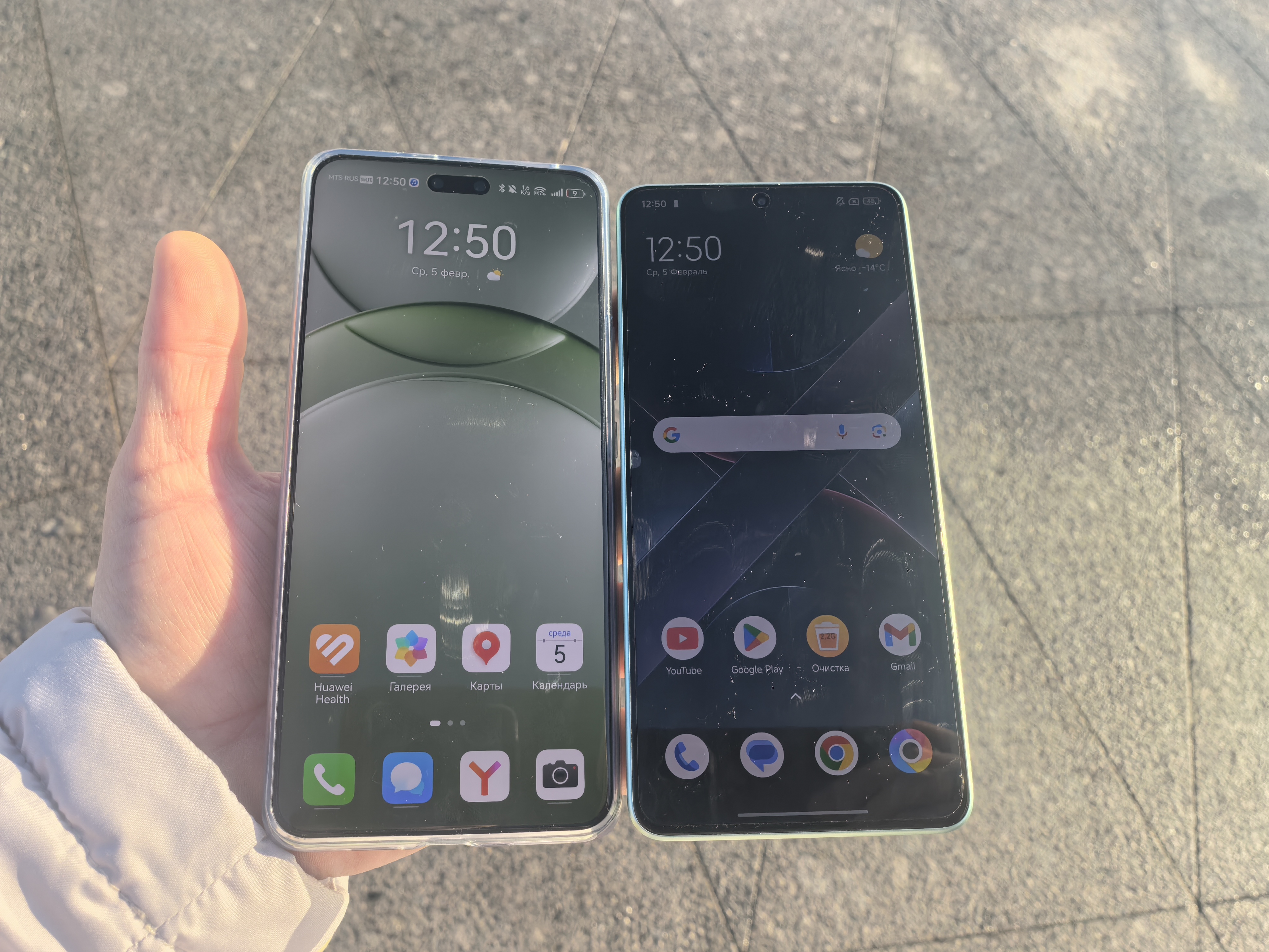Яркость экрана в режиме HDR — 3200 нит. Точно такое же число и у Poco X7 Pro. У младшего представителя линейки HUAWEI Pura — 2500 нит. На следующих фотографиях сравнил яркость экранов на солнце и максимальном уровне подсветки. Разница в 2500 и 3200 нит не сильно заметна. Работает она в режиме HDR.