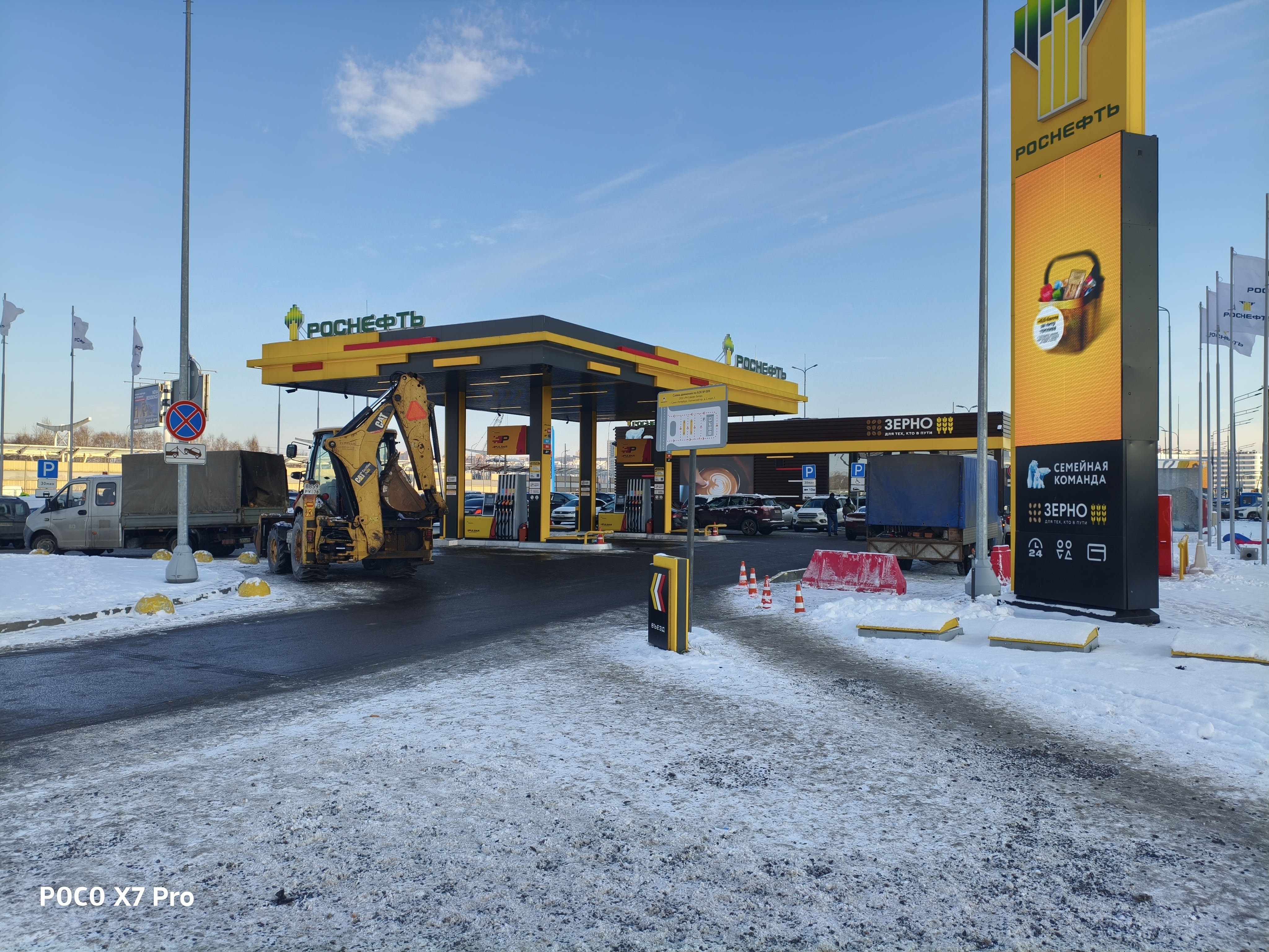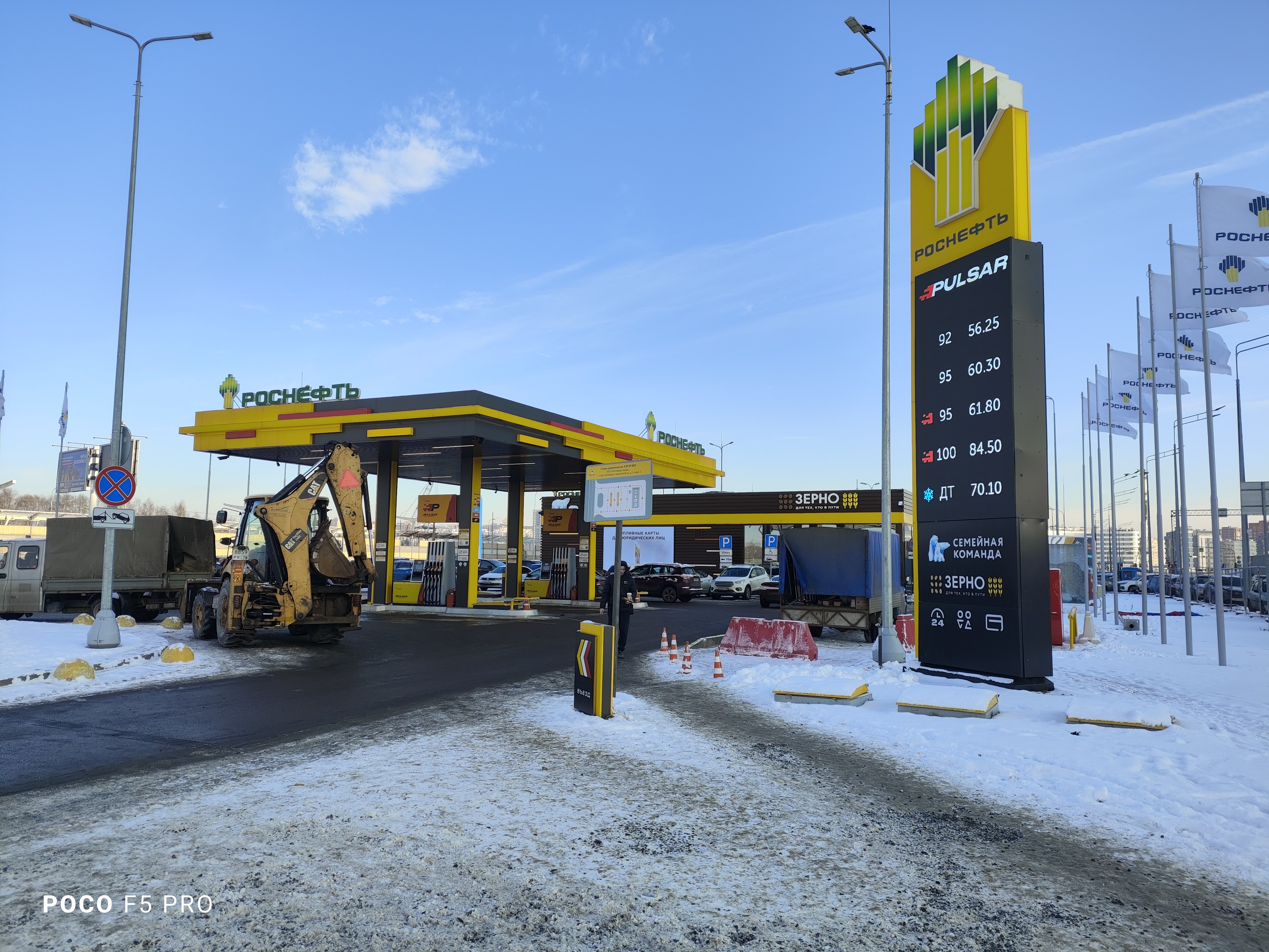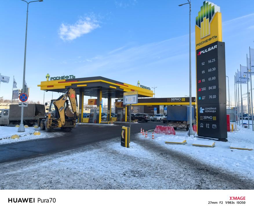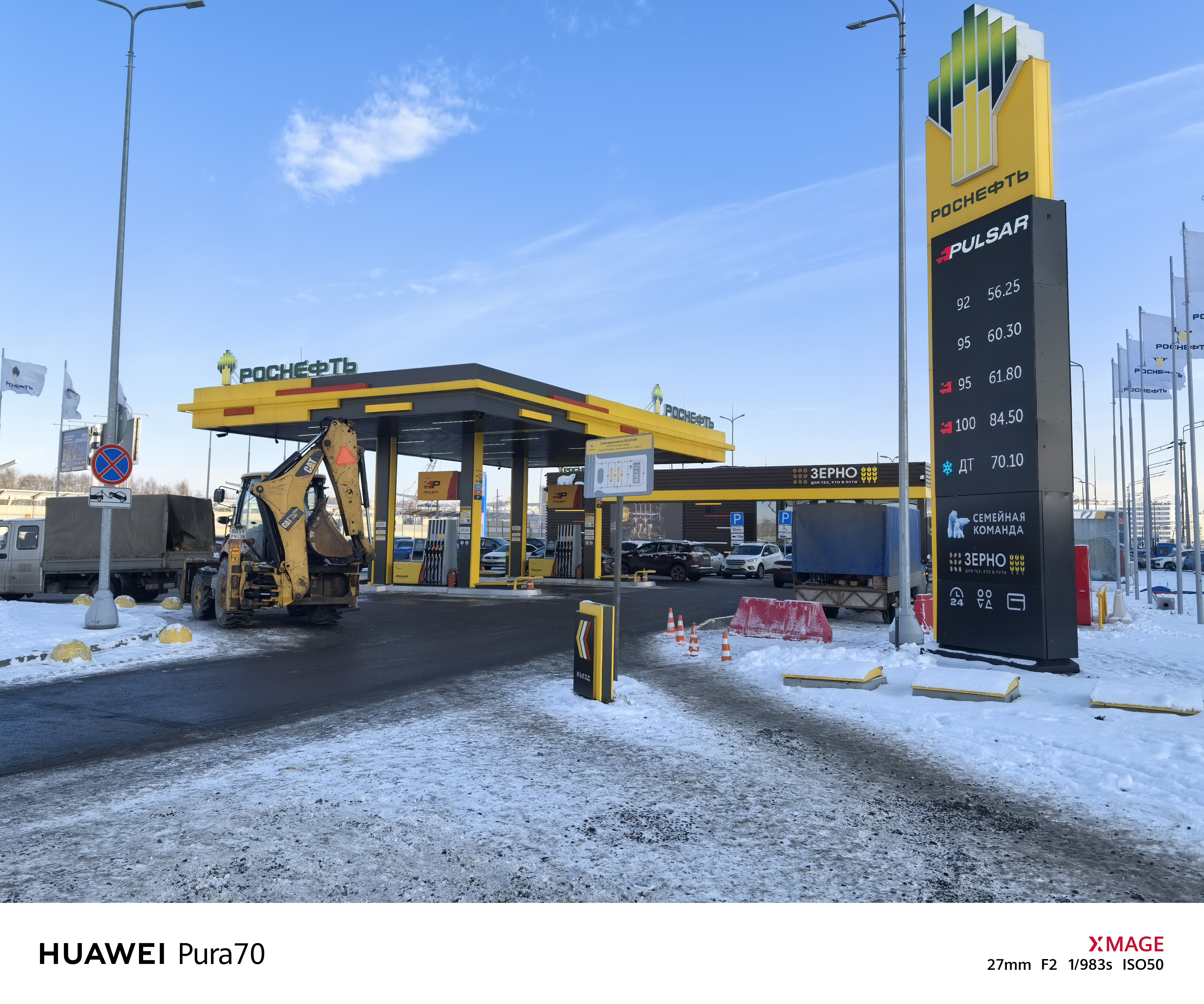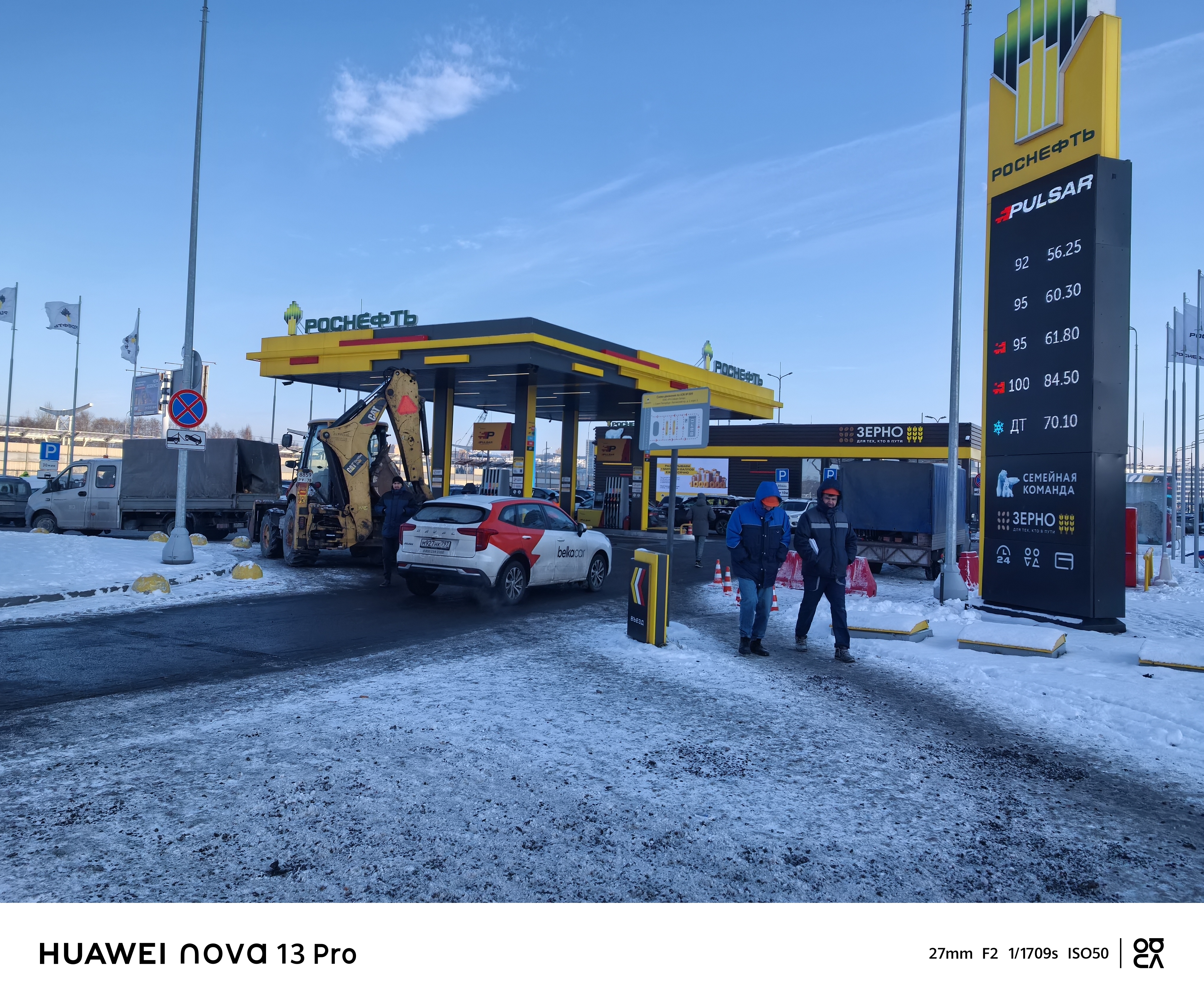 В заправке и ее окрестностях вроде бы нет больших отличий с первого взгляда по кадрам, но, присмотревшись, видно, что фон на Note 13 Pro темнее, чем на Pura 70, при этом небо выглядит синим, а не голубым. Относительно Poco X7 Pro кадр смотрится насыщеннее и с лучше проработанными деталями, что видно по снегу. Снимок на F5 Pro похож на первый, но скучнее и беднее в красках и их насыщенности.