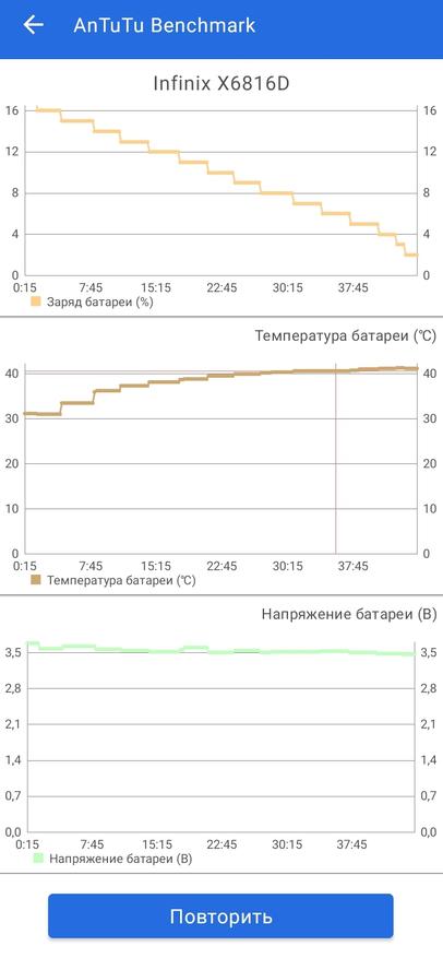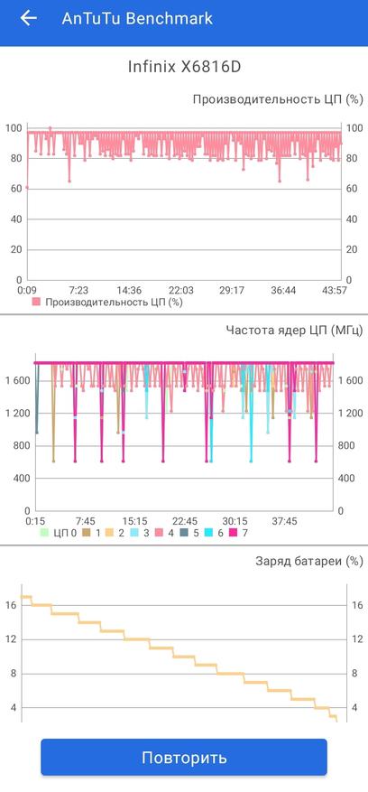 Ниже приведены результаты 45 минутного теста производительности Antutu.