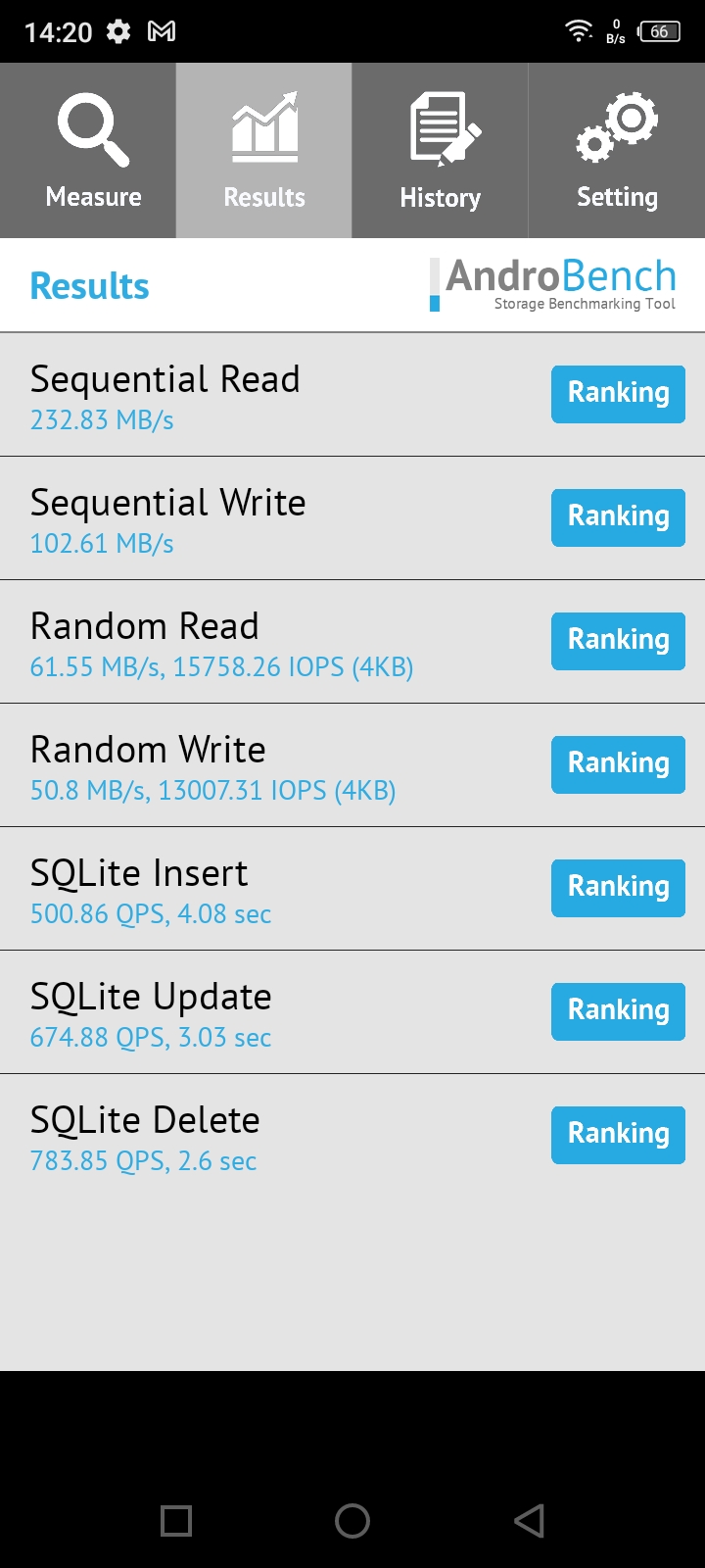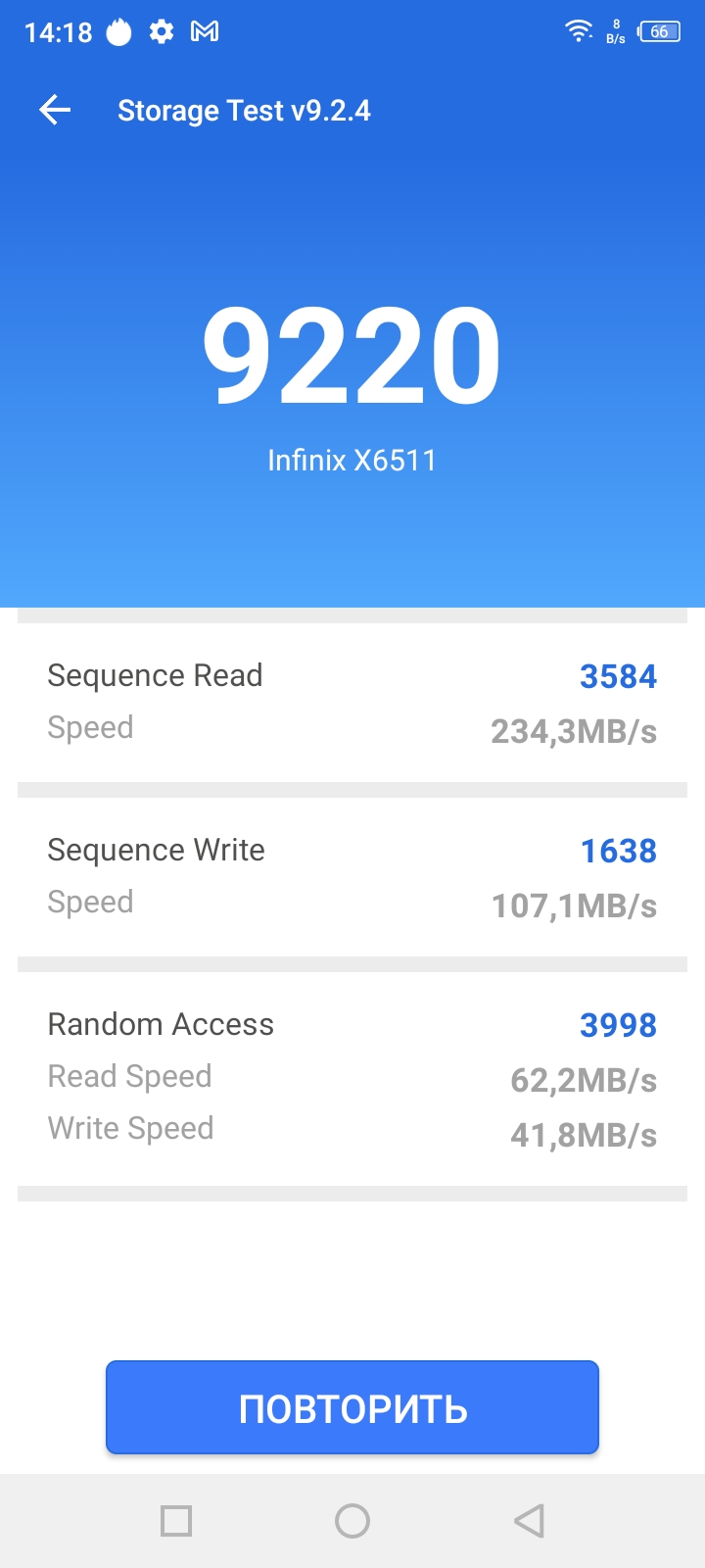 Следующими тестами узнаем о скоростных характеристиках данного процессора и смартфона в частности. Так как в качестве внутреннего накопителя используется 32GB памяти типа MMC 5.1, то проведем ряд замеров: