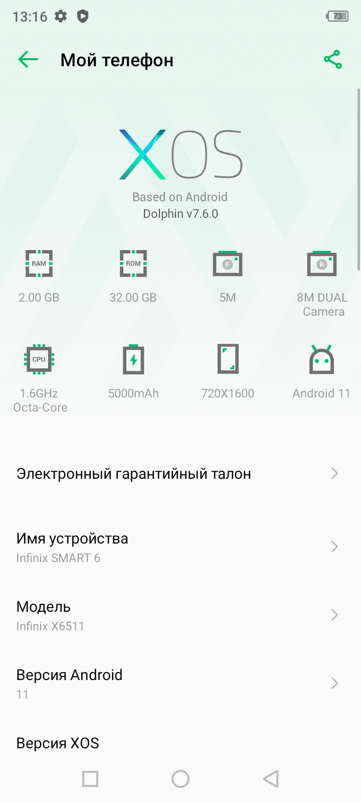 В качестве ОС Infinix Smart 6 применяется Android 11 Go c фирменной оболочкой XOS v7.6. Редакция Android Go предназначена для слабых устройств с ограниченным объемом оперативной памяти (от 2-х GB) и облегченными версиями штатных программ. При этом в спецификации к Go редакциям есть приписка о количестве фоновых приложений (не более 4-х), тогда как Smart 6 держит 6-7 приложений одновременно. Поэтому я не удивлюсь, если никакого Android Go тут нет и для запуска базового Android 11 хватает 2-х GB оперативной памяти.