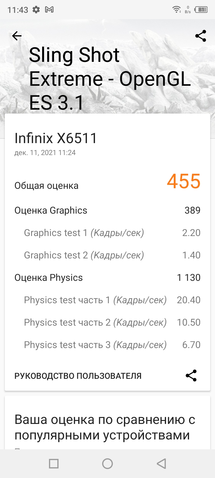 - 3D Mark: Wild Life и Wild Life Extreme – не поддерживаются, Sling Shot – 672, Sling Shot Extreme – 455