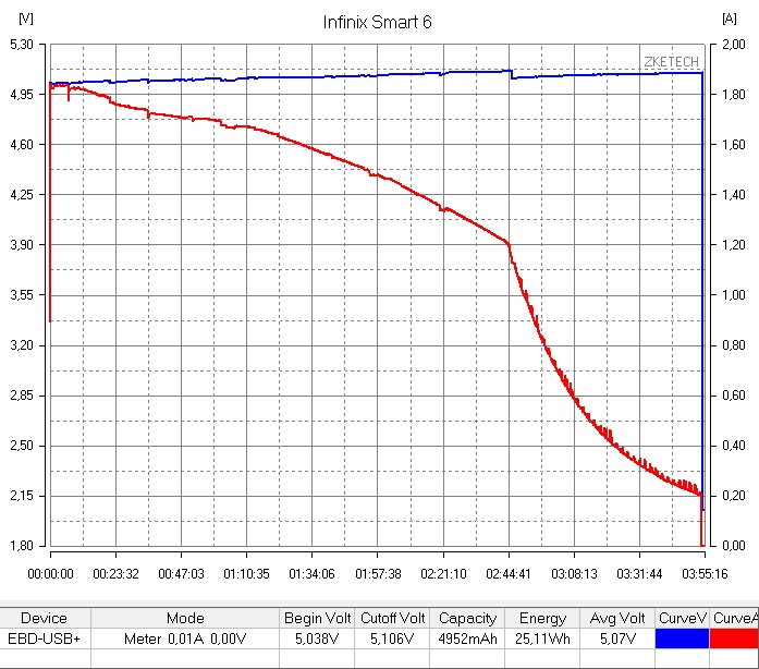 В Infinix Smart 6 применяется Li-Po аккумулятор на 5000 mAh и для его зарядки используется штатный БП на 10W. Данное зарядное устройство заряжает смартфон с 0 до 100% за 3 часа 55 минут, что является довольно длительным результатом. При использовании сторонних БП большей мощности, результаты остаются неизменными.