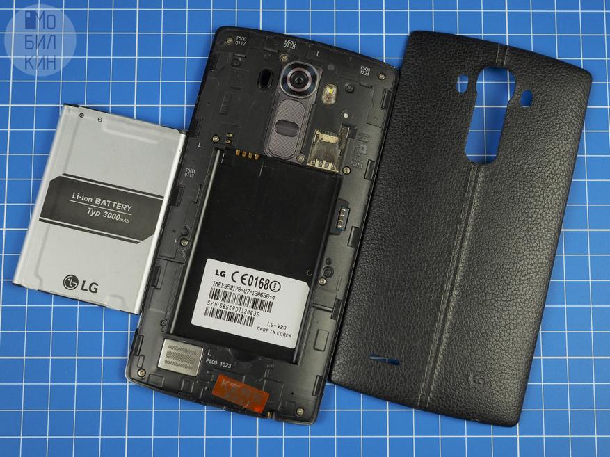 Спереди и с боков телефон покрыт пластиком, а заднюю часть закрывает крышка из шикарной натуральной кожи с прострочкой. Под ней можно увидеть слоты для MicroSIM и карты памяти, съёмную батарейку на 3000 мАч, а также типичный «винегрет» из надписей, характерный для восстановленных смартфонов. Например, наклейка под аккумулятором гласит, что у меня LG V20, а по IMEI так и вовсе пробивается старенькая «раскладушка» LG Wine Smart. По факту же перед нами корейская версия LG G4 F500L или то, что попытались за неё выдать. На верхней грани находится инфракрасный порт для управления техникой, а спереди прячется светодиодный индикатор событий.