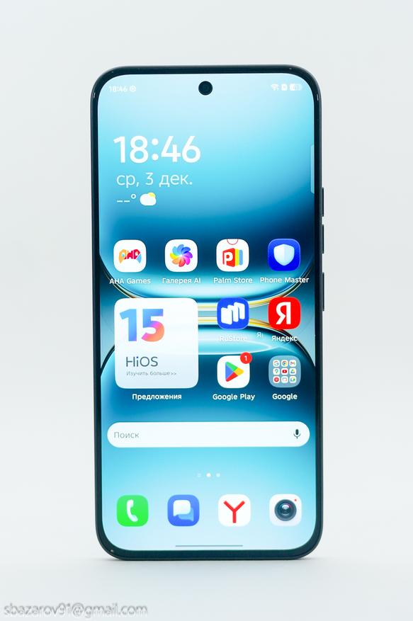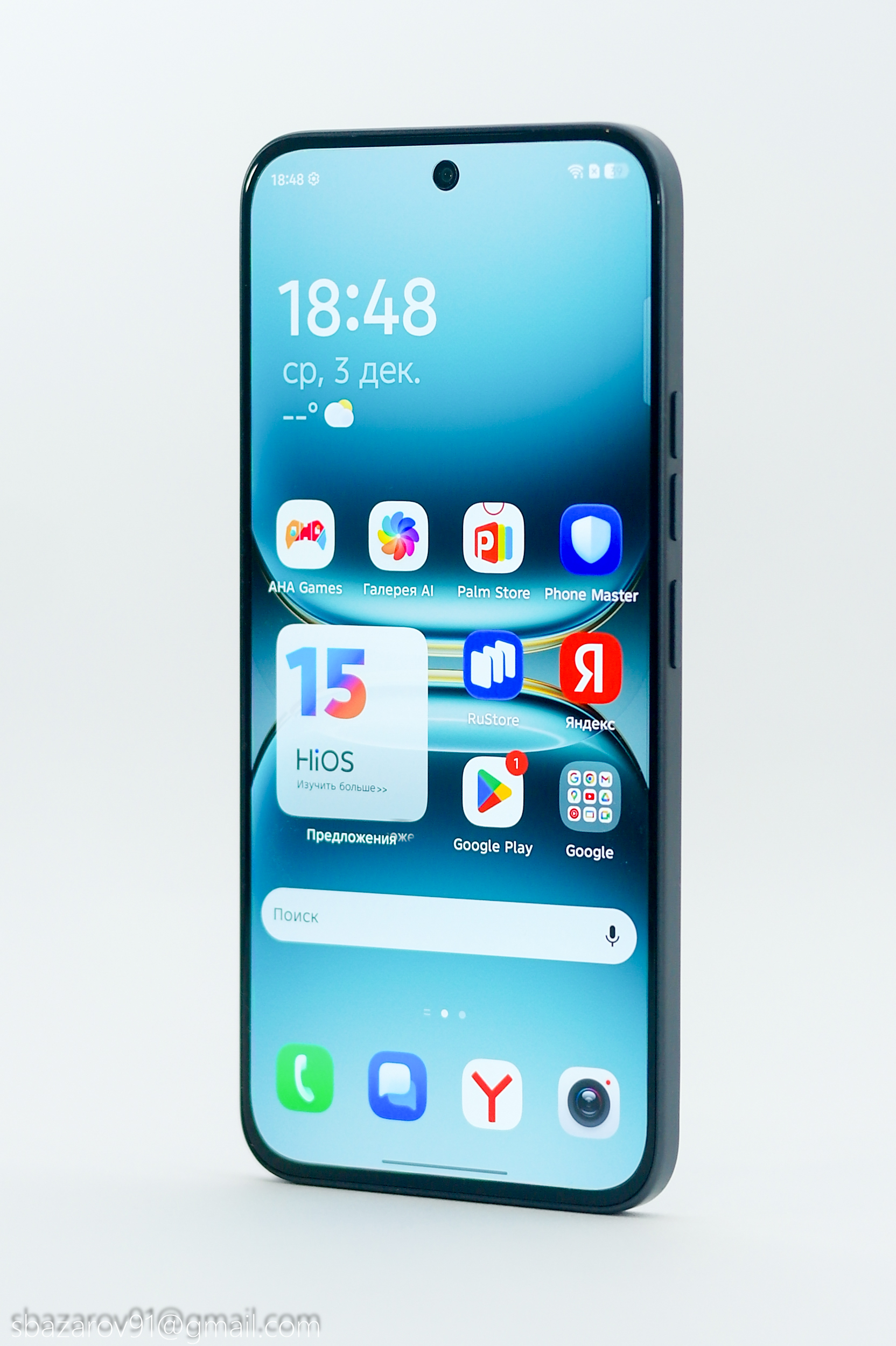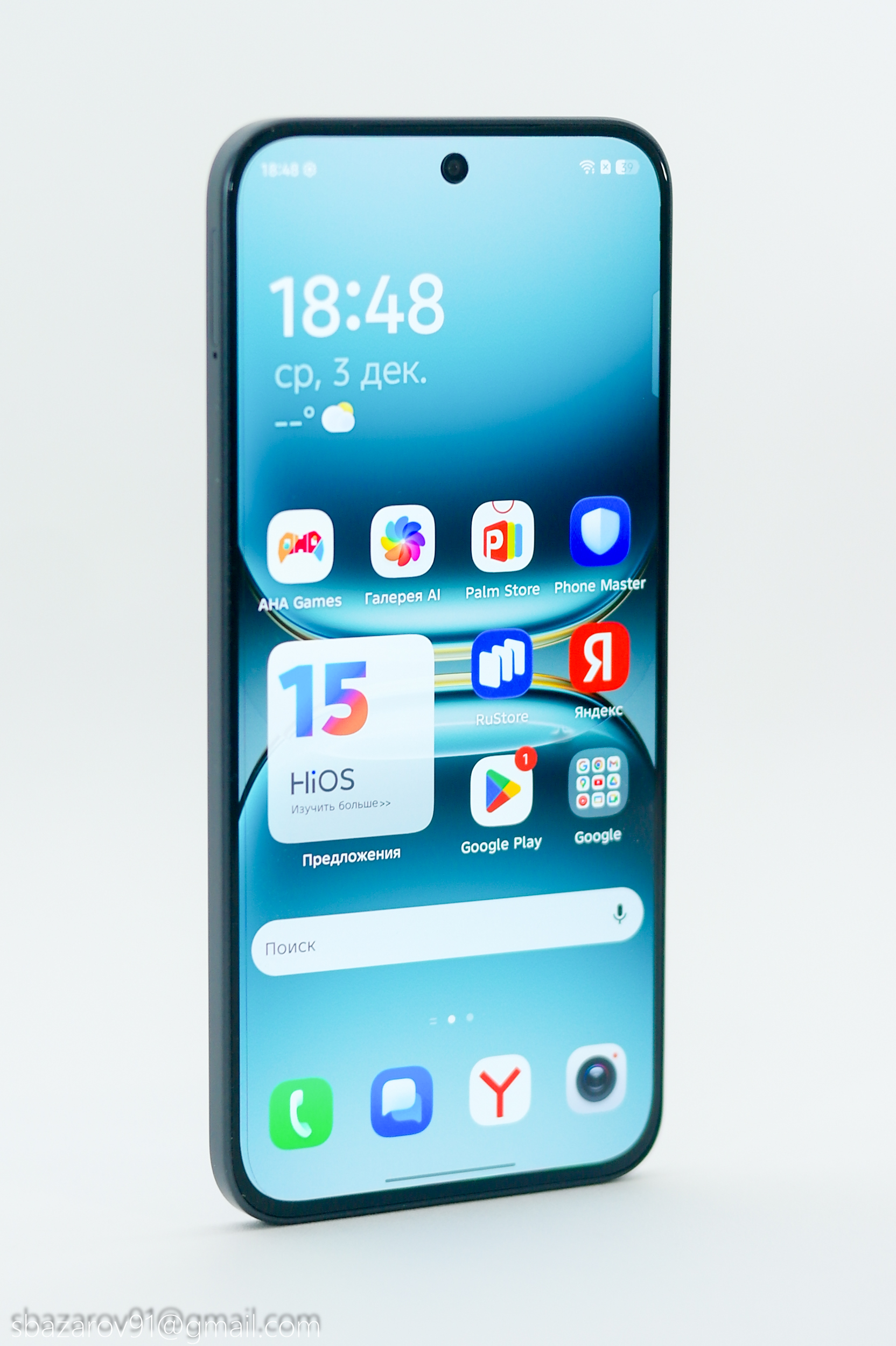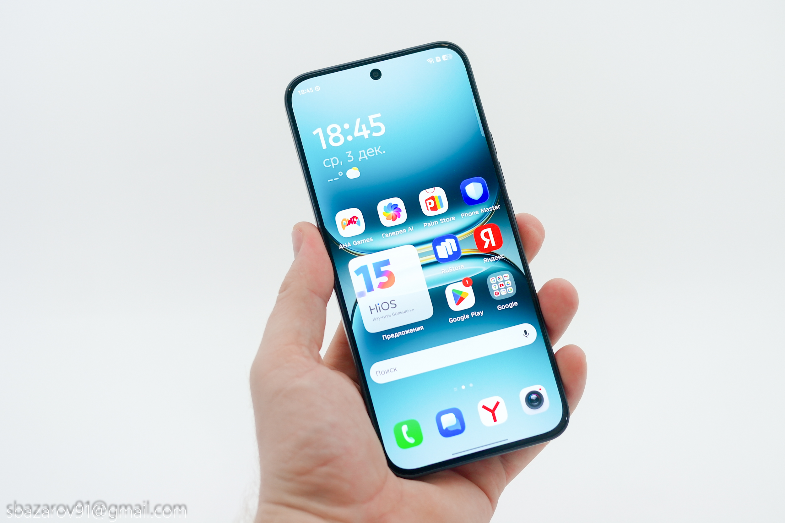 То, что удивляет еще на стадии знакомства, находится на передней панели, а именно экран, который формирует первое и довольно приятное впечатление от новинки TECNO. В его основе лежит AMOLED-матрица с диагональю 6.78 дюймов и соотношением сторон 20:9. Разрешение экрана 2720x1224 пикселей — высокое даже для среднего ценового сегмента, не говоря уже о бюджетной линейке. Однако такое разрешение достигается путем апскейлинга/масштабирования с нативного разрешения 1080р за счет использования сопроцессора TECNO T1. Поэтому в большинстве приложений разрешение отображается как 2400x1080 (FHD+).