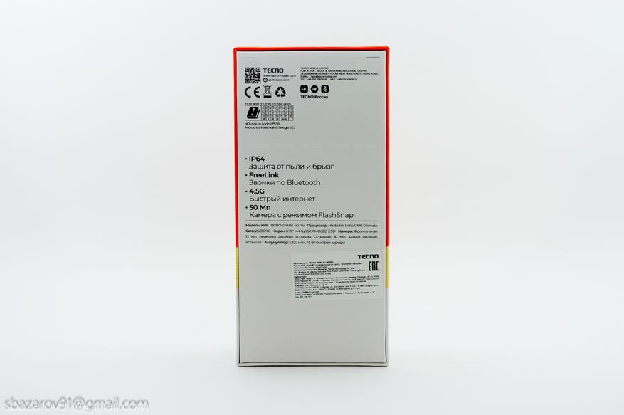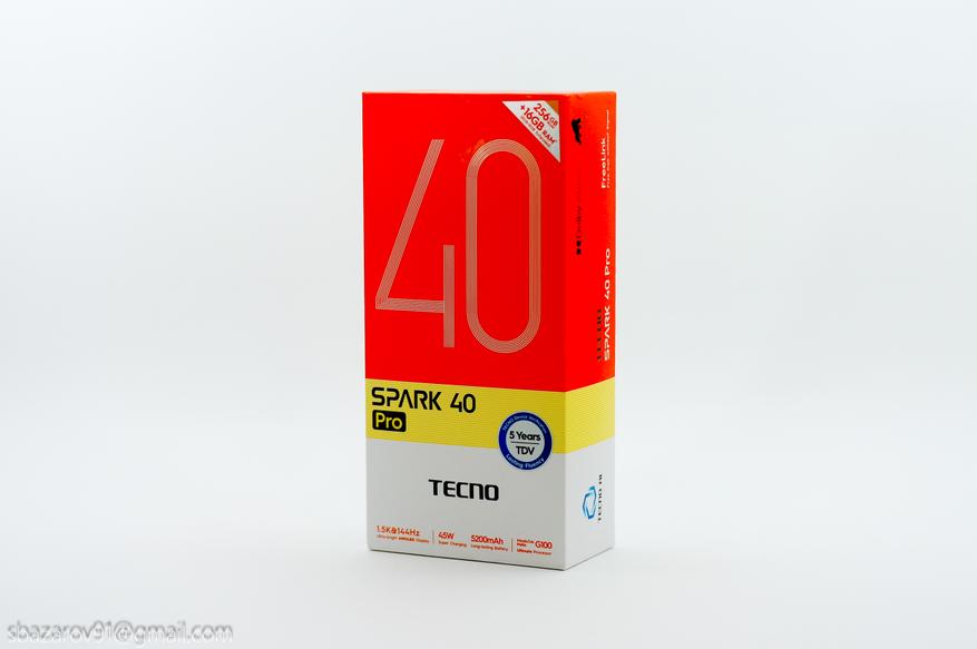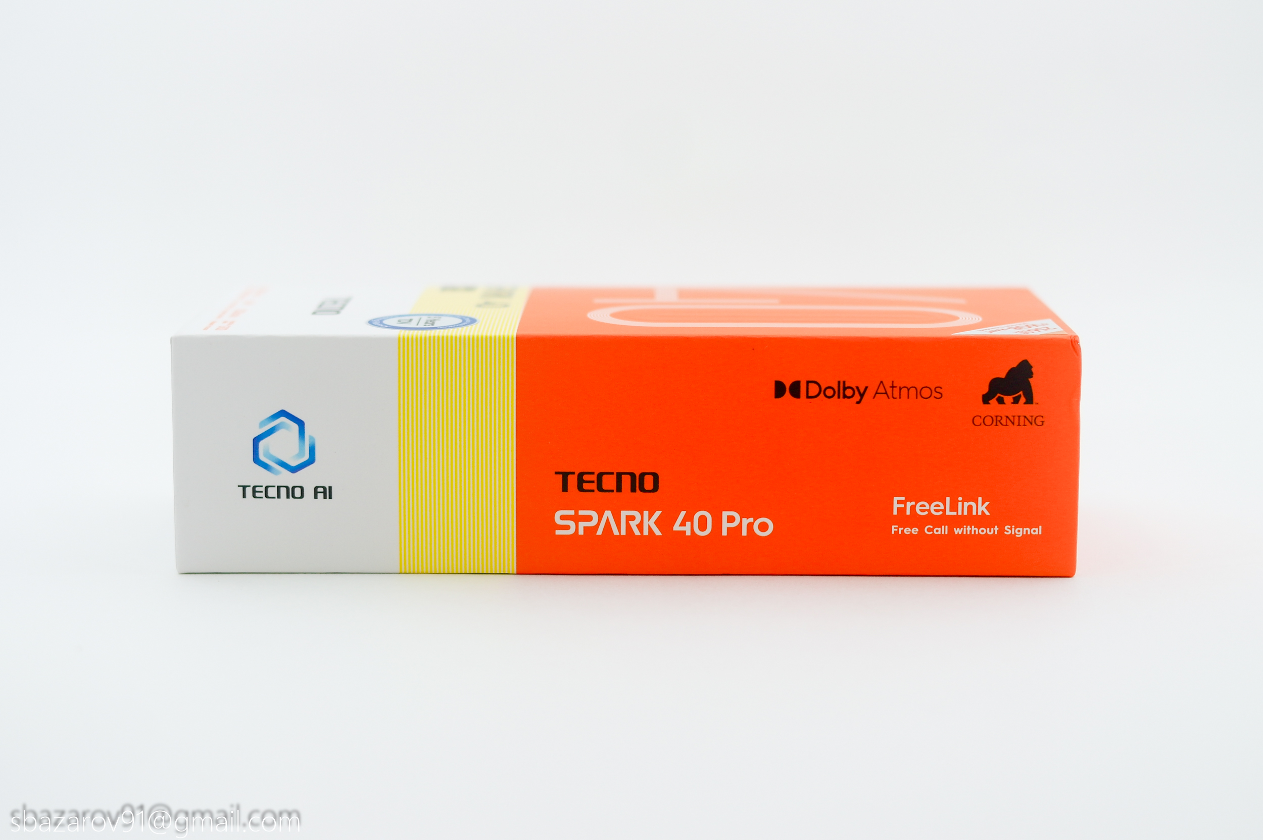 Что касается розничной упаковки, то Spark 40 Pro продолжает дизайн-концепцию «сороковой» линейки бюджетных смартфонов — ярко-оранжевые цвета, текстурированная фактура на лицевой панели и перечень характеристик на обороте.