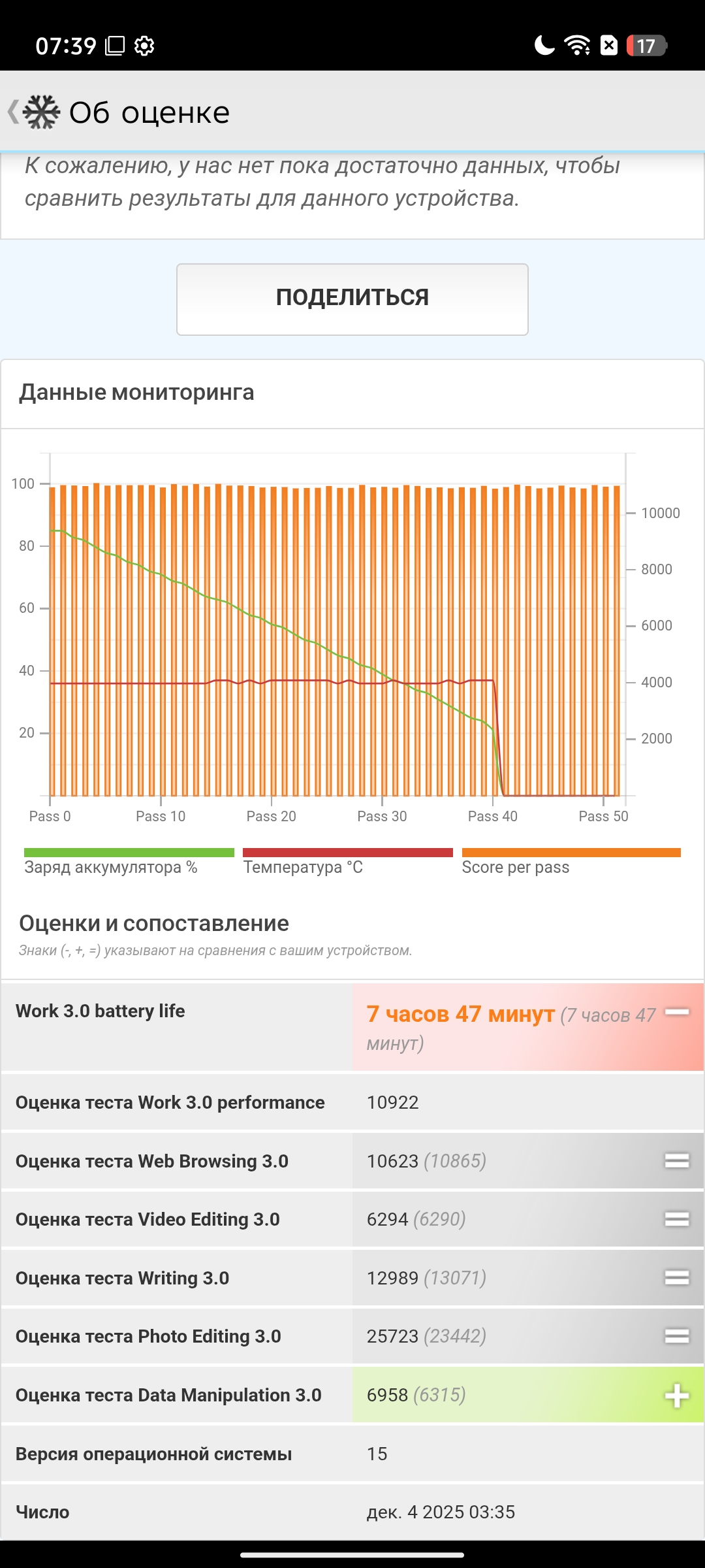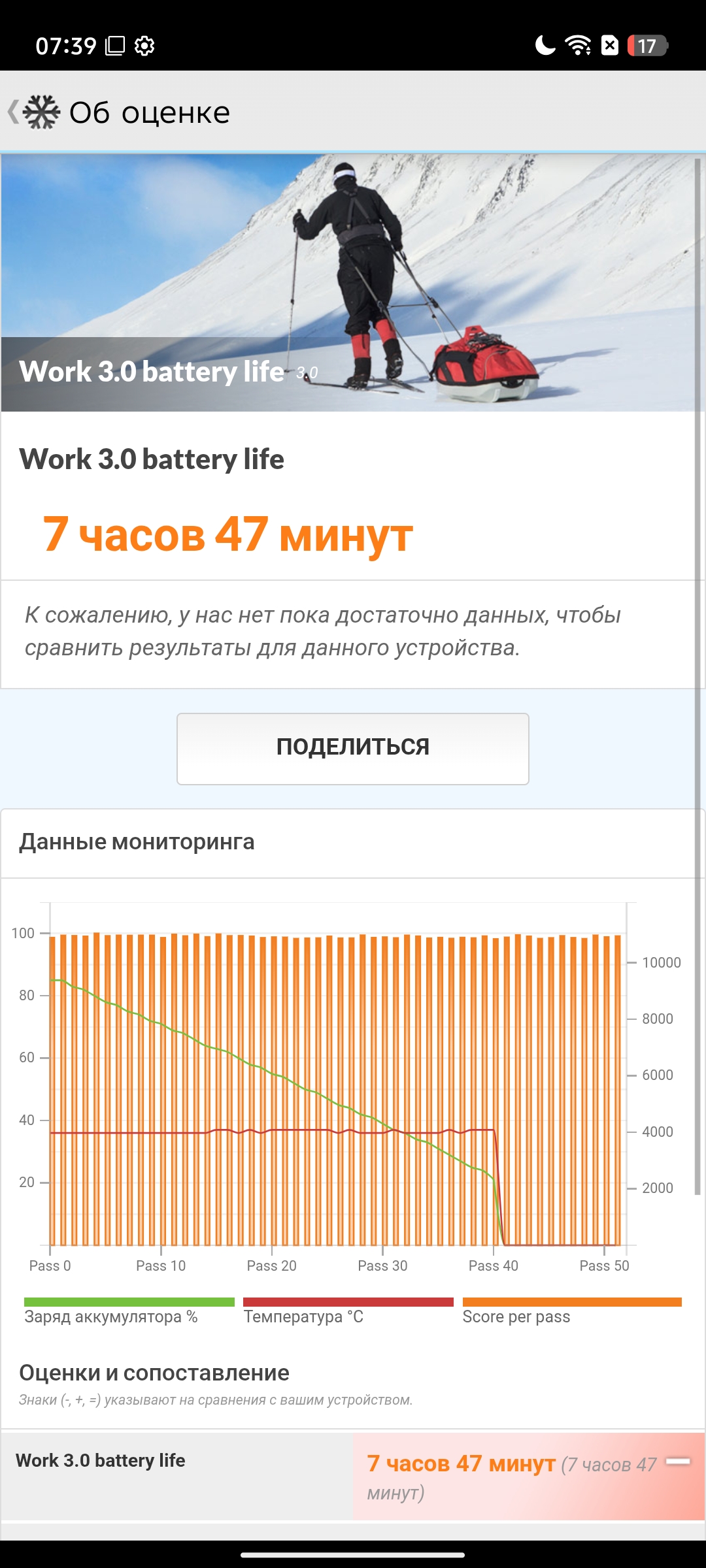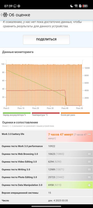 Несмотря на тонкий корпус, Spark 40 Pro получил вполне стандартный аккумулятор ёмкостью 5200 мА*ч. Чуть больше, чем у конкурентов, но и толщина в пользу смартфона от TECNO. В синтетических тестах результат составил 7 часов 47 минут — полноценный рабочий день на максимальной яркости с остатком в 20%, по-моему, неплохо.