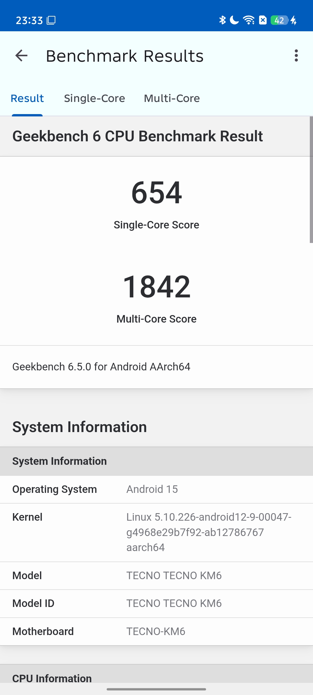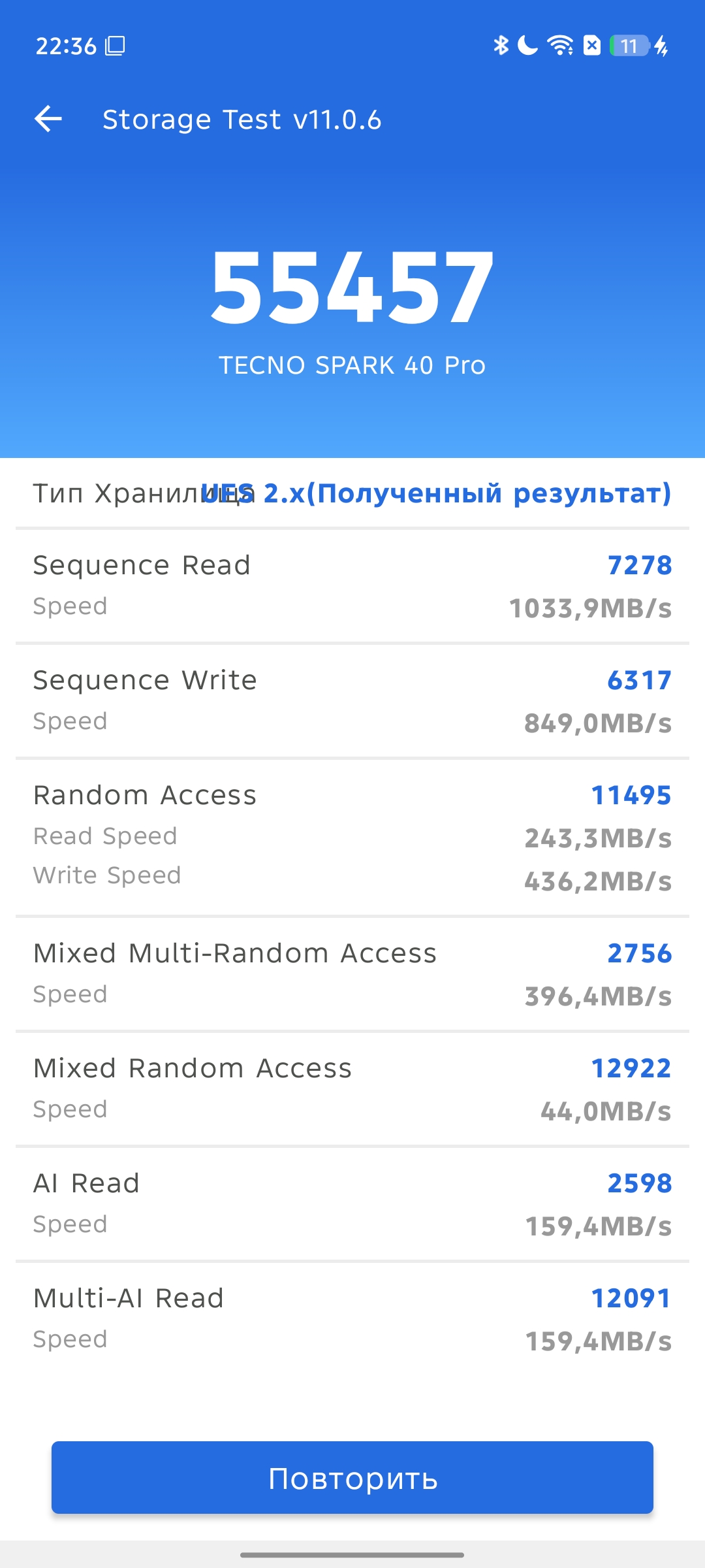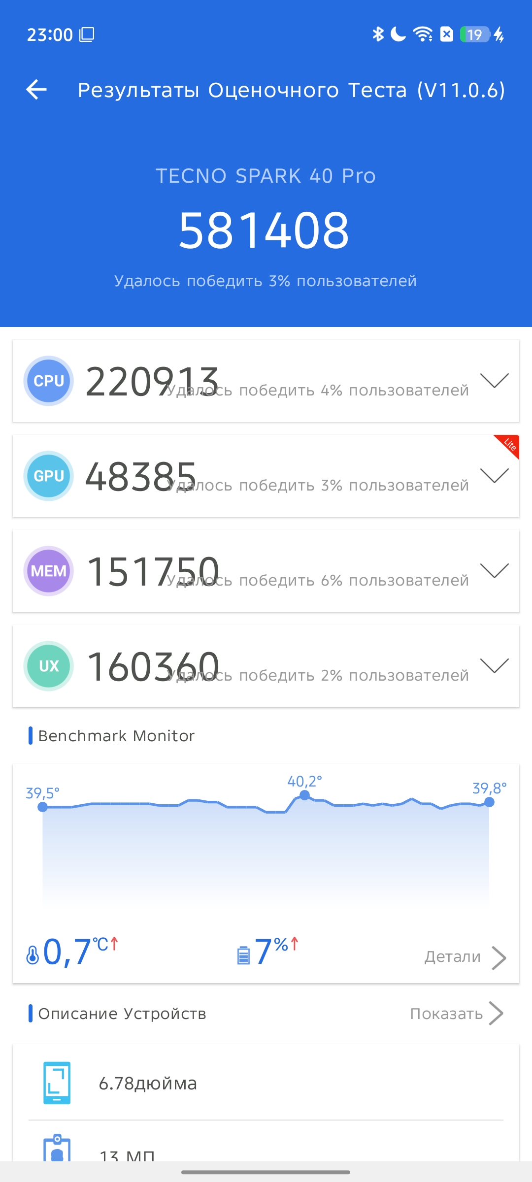 В плане железа сделан значительный шаг вперед (MediaTek Helio G100), особенно если сравнивать с обычным Spark 40, где применяется Helio G91. По структуре это обычный чипсет-трудяга с восемью ядрами, два из которых производительные, а шесть энергоэффективные. Чипсет чувствует себя отлично и не перегревается даже при длительной 100% нагрузке. По части производительности — более чем хорошо за свои деньги: 581 тысяча очков в популярном бенчмарке AnTuTu 11.