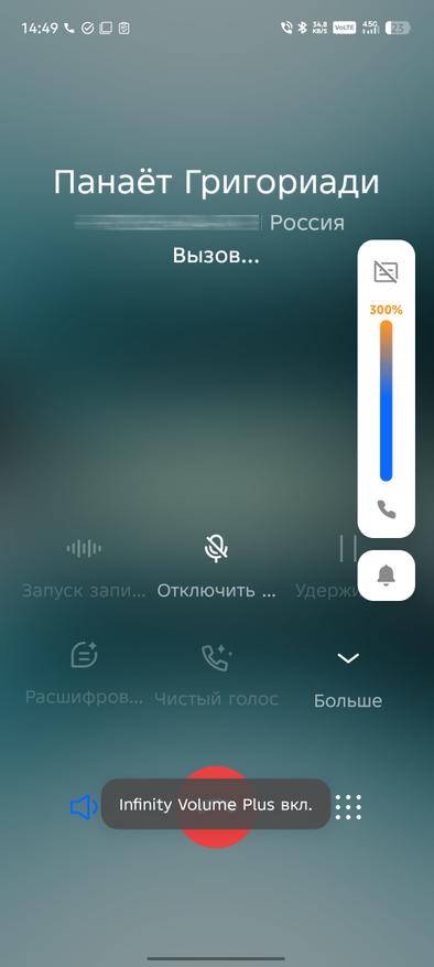 Штатная звонилка оснащена AI-функцией, а именно шумоподавлением при звонках, которое отсеивает посторонние шумы на основе заранее записанного образца вашего голоса. Работает корректно, но иногда звук может искажаться. Также звонилка поддерживает функцию Infinity Volume Plus, представляющую собой программное увеличение громкости вплоть до 300% (в устройствах TECNO вижу впервые). Общая громкость достаточная даже на обычном максимуме, не говоря уже о 300%. А вот запись разговоров осталась верной традициям компании, активируясь без предупреждения.