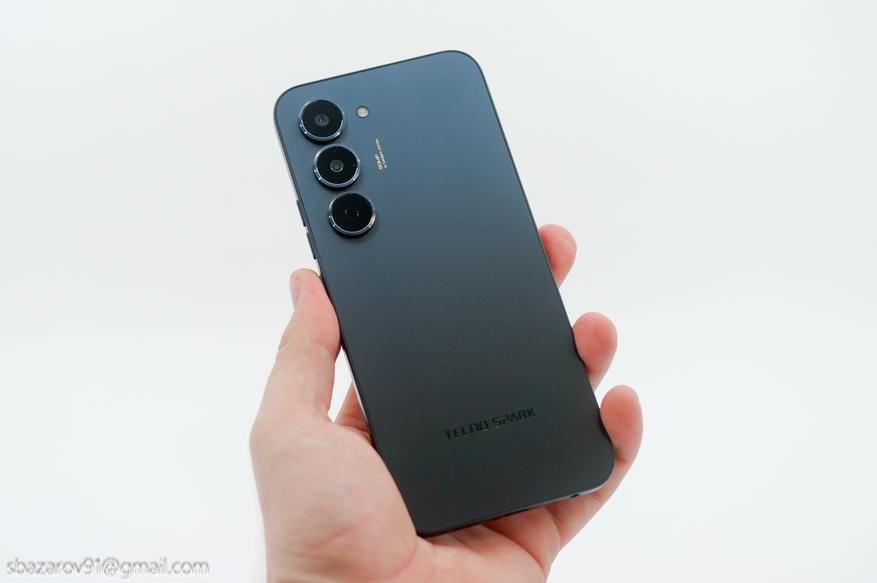 С точки зрения дизайна, TECNO Spark 40 Pro приятен. Смартфон выполнен в минималистичном стиле, с тонким корпусом и прямыми боковыми гранями. Края смартфона имеют скругление, обеспечивающее удобный хват. По ширине — комфортно (75.9 мм), в мужской руке лежит уверенно.